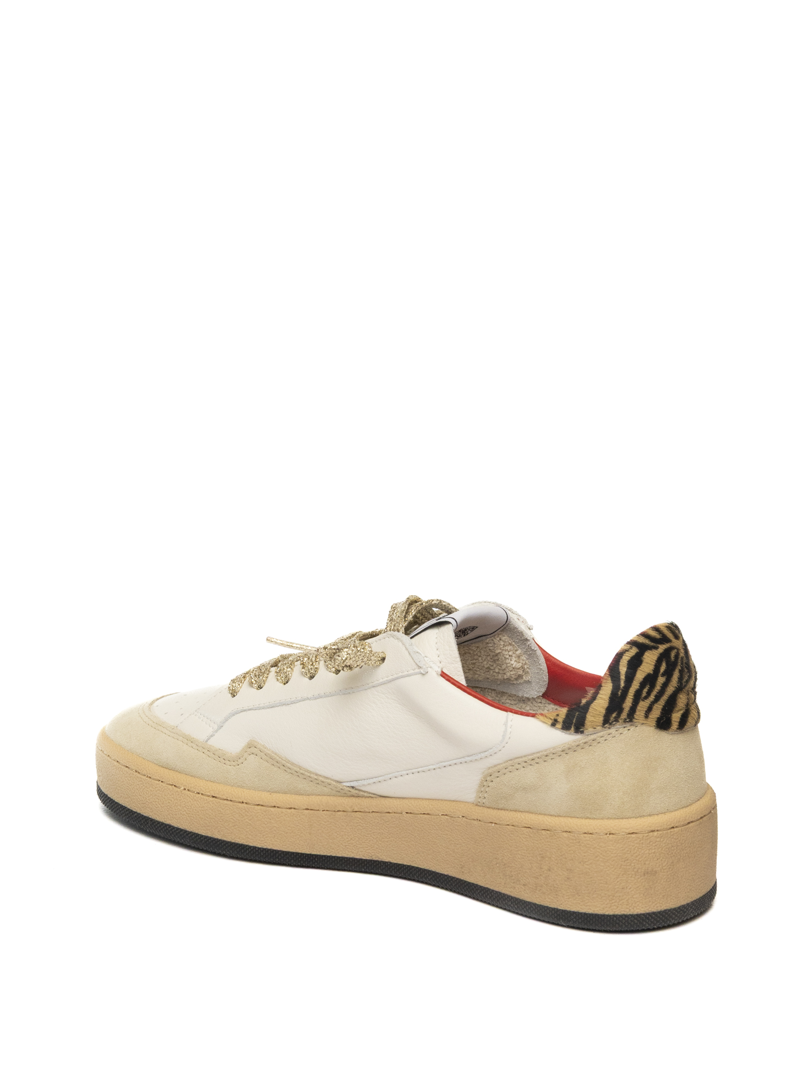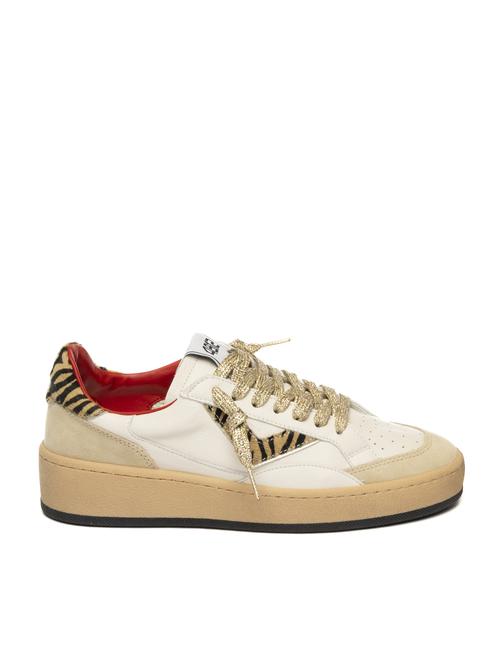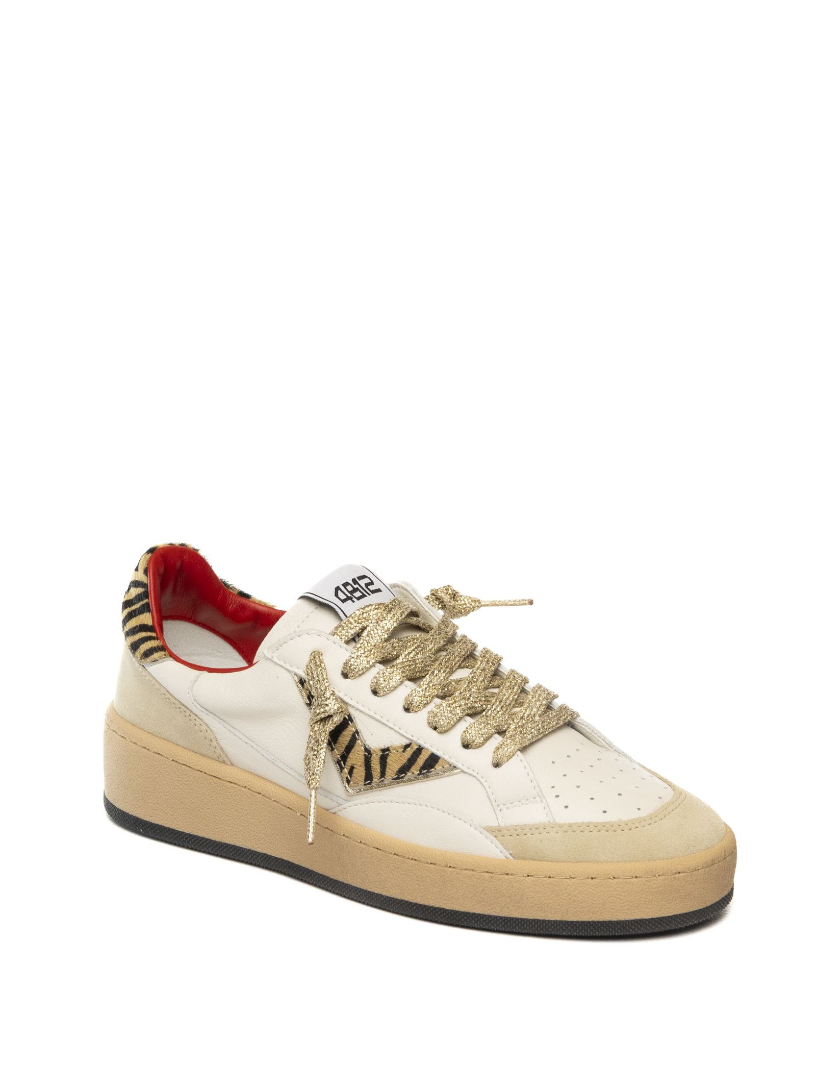 Bold yet refined 4B12 sneakers crafted from genuine leather and suede, blending textures and tones with distinctive flair. The zebra-effect animal print inserts on the heel and side add a touch of personality and edge, while the red leather lining introduces a luxurious, vibrant accent. The padded leather insole ensures lasting comfort, and the gold laminated laces enhance the overall design with subtle shine. The beige rubber sole with black edge provides flexibility, grip, and long-lasting comfort. A statement sneaker that fuses urban spirit with contemporary elegance.