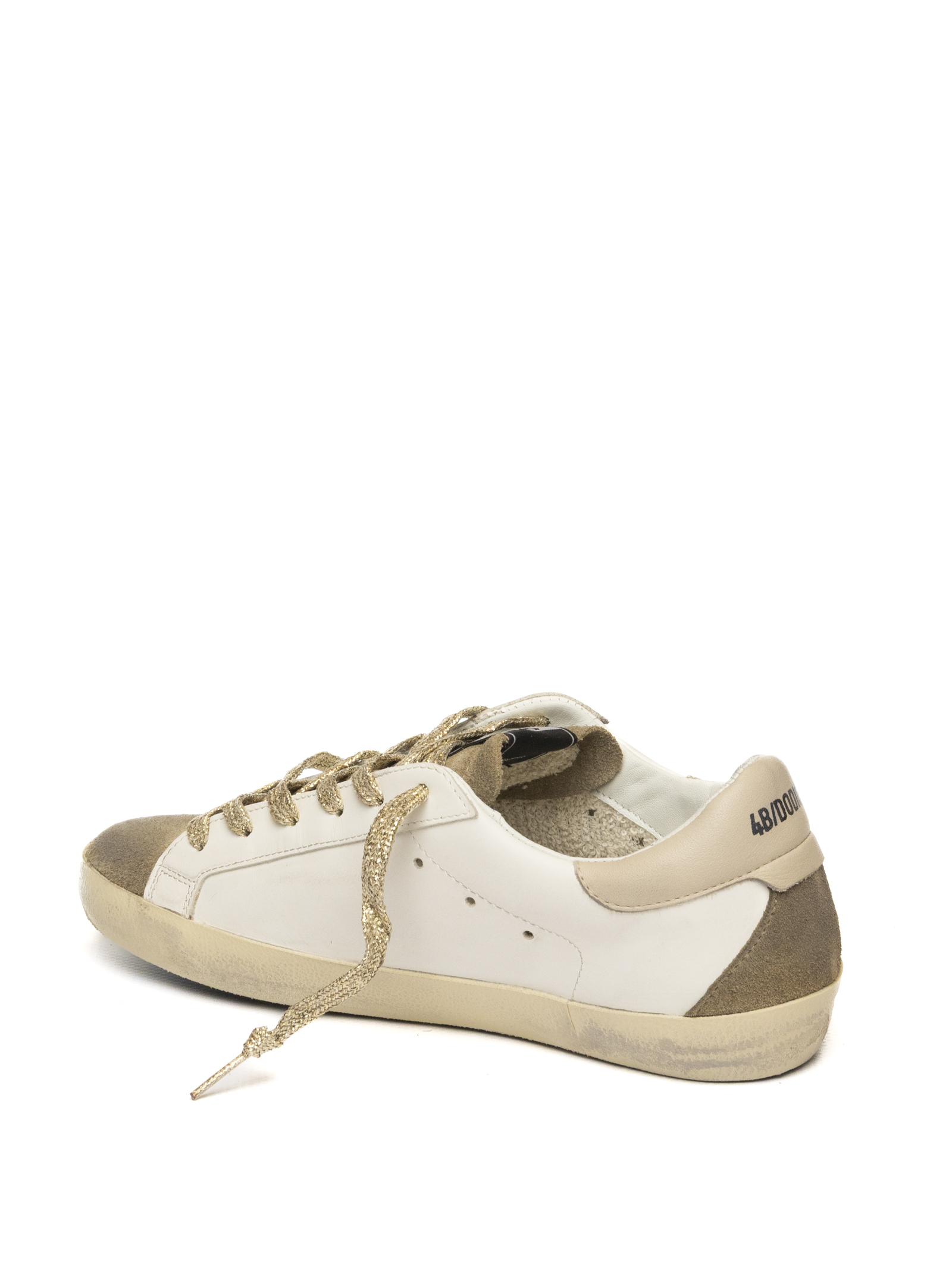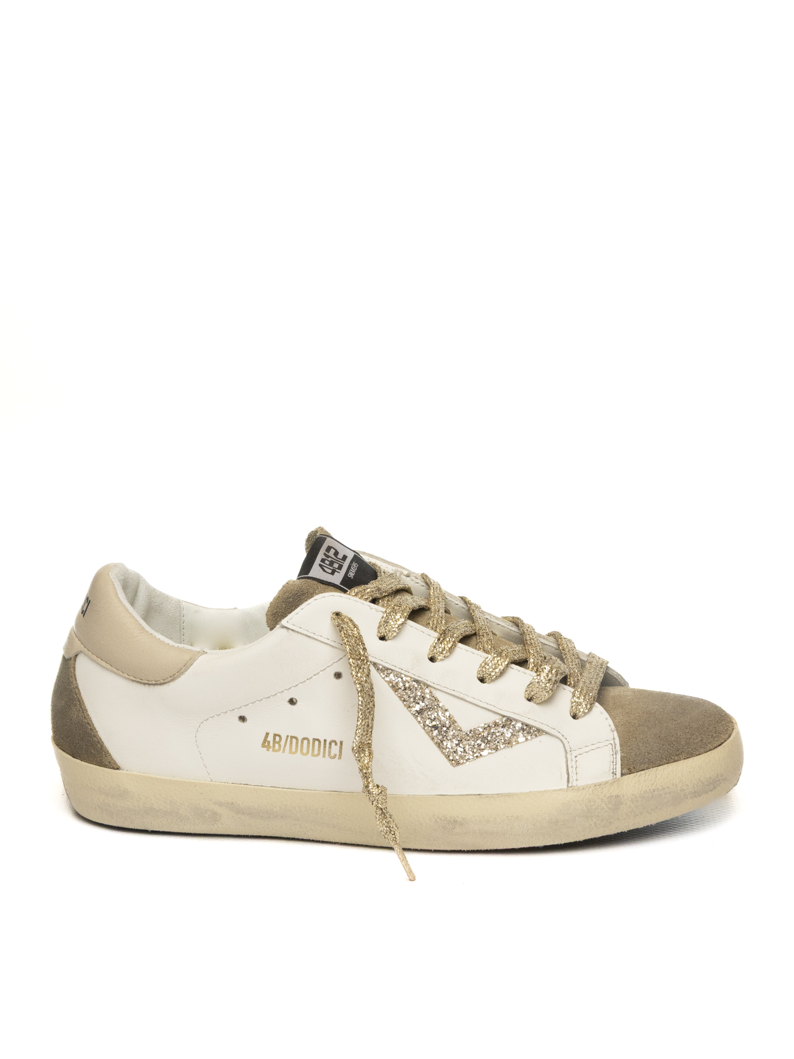 Sporty and contemporary 4B12 sneakers crafted from smooth off-white leather and contrasting taupe suede. The perforated side logo adds a subtle touch of identity, while beige sole details and tone-on-tone laces give the model a refined yet casual look. The natural leather lining ensures breathability and long-lasting comfort, and the padded insole provides excellent cushioning. The flexible rubber sole guarantees a stable and comfortable fit suitable for everyday wear.