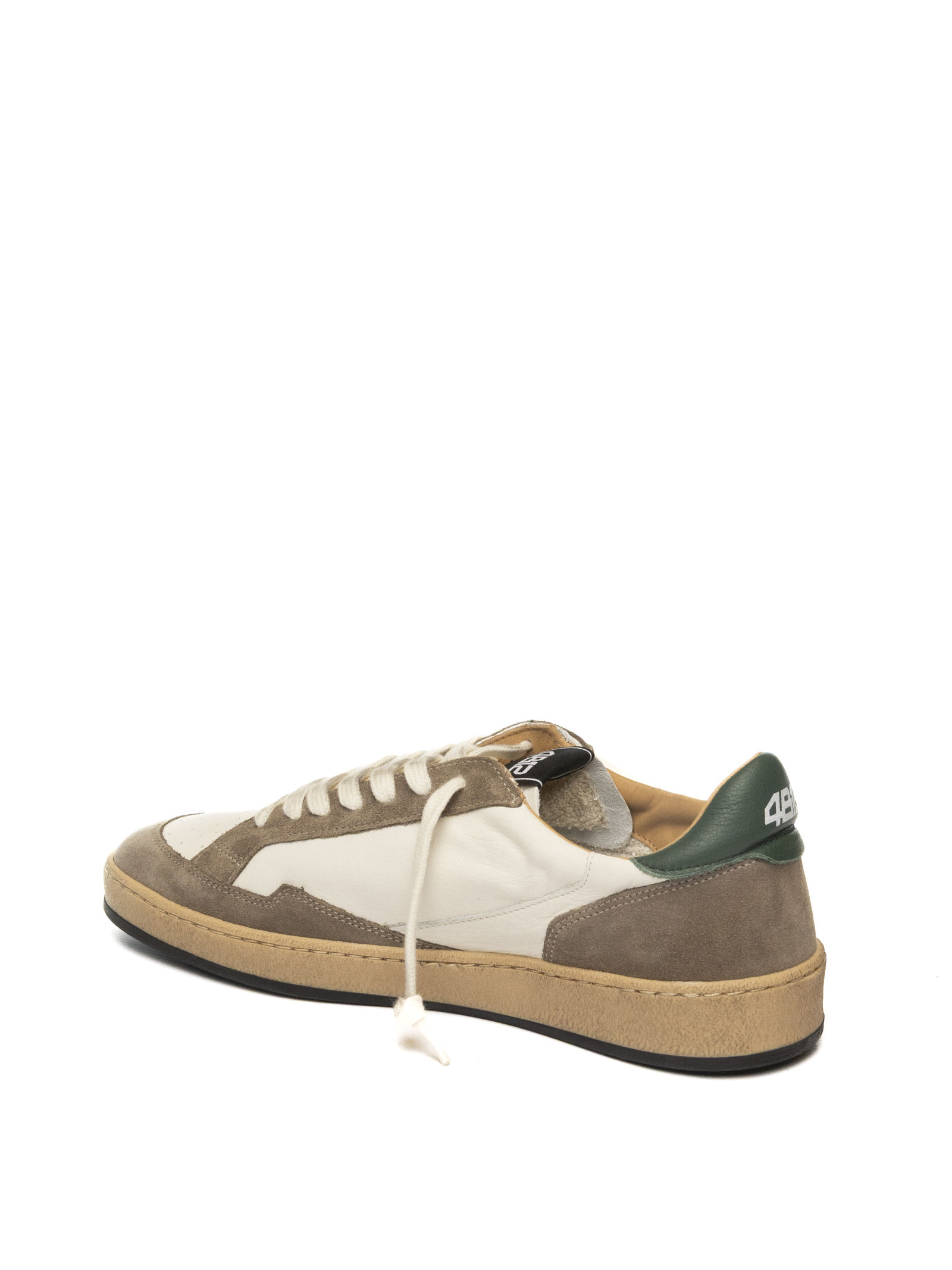 Authentic 4B12 sneakers that merge urban attitude with refined Italian craftsmanship. Made from smooth leather and premium suede, this model features a balanced combination of white and taupe tones enhanced by a military green logo and a forest green leather heel tab. The natural leather lining ensures breathability and comfort, while the padded insole provides superior cushioning. Finished with a beige rubber sole and black edge, these sneakers offer both elegance and everyday versatility.
