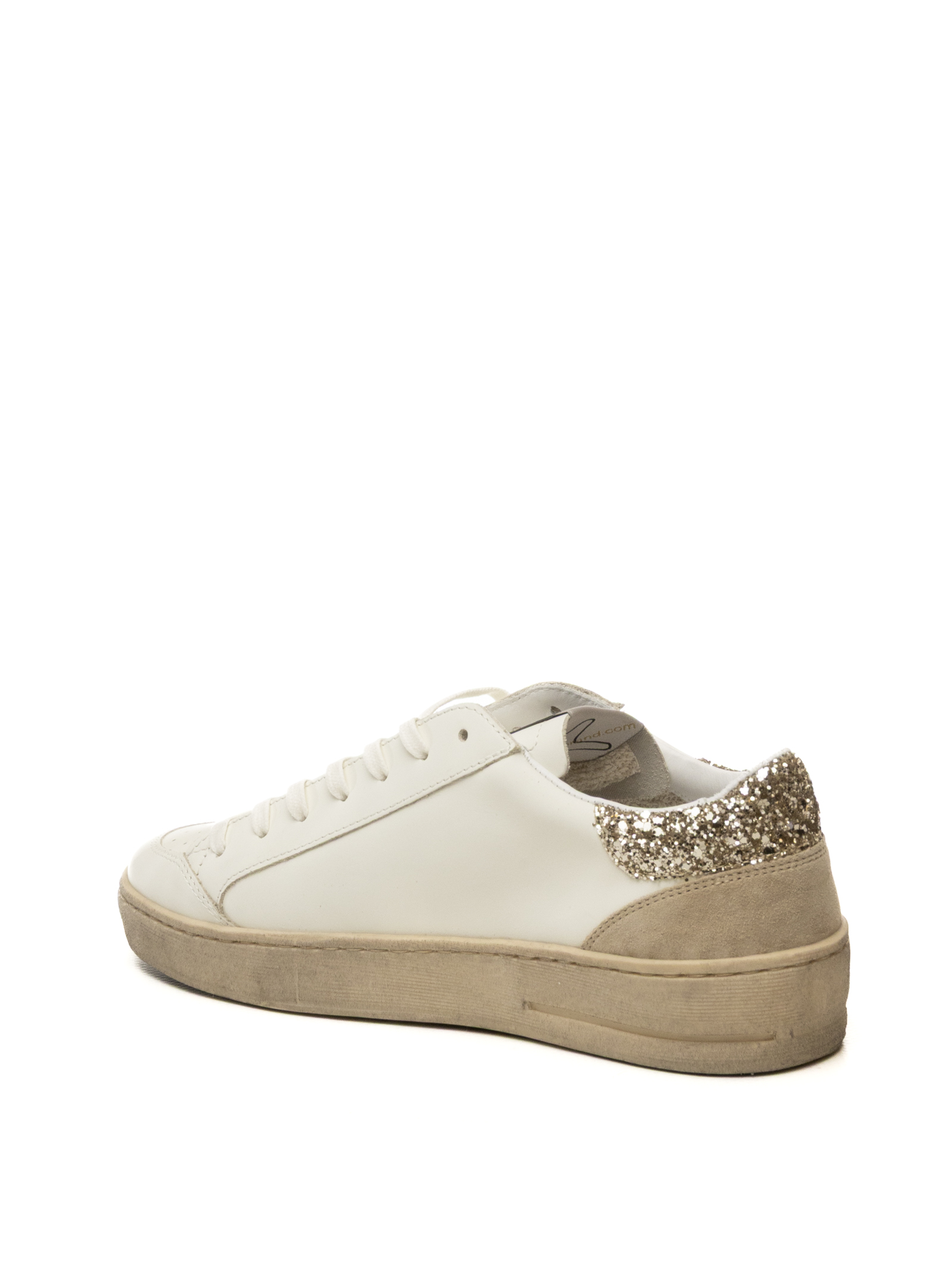 The upper, crafted from supple white calfskin leather, is embellished with the iconic lateral star logo in laminated leather, which elegantly catches the light and coordinates with the tongue and heel accents. The standout feature is the heel tab entirely coated in gold glitter, providing a bold and sophisticated radiance, ideal for completing high-end summer looks.