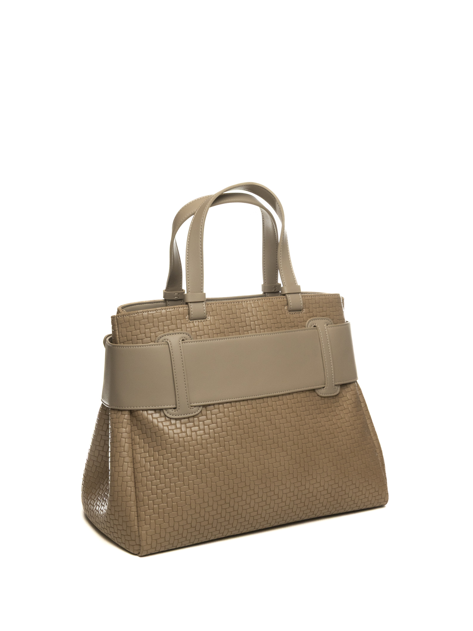 Crafted in a warm and luminous beige (Sand/Taupe), the bag offers a roomy and functional trapezoidal silhouette. The double short handles ensure elegant hand-carrying, while the semi-rigid structure ensures the accessory maintains its impeccable shape over time.