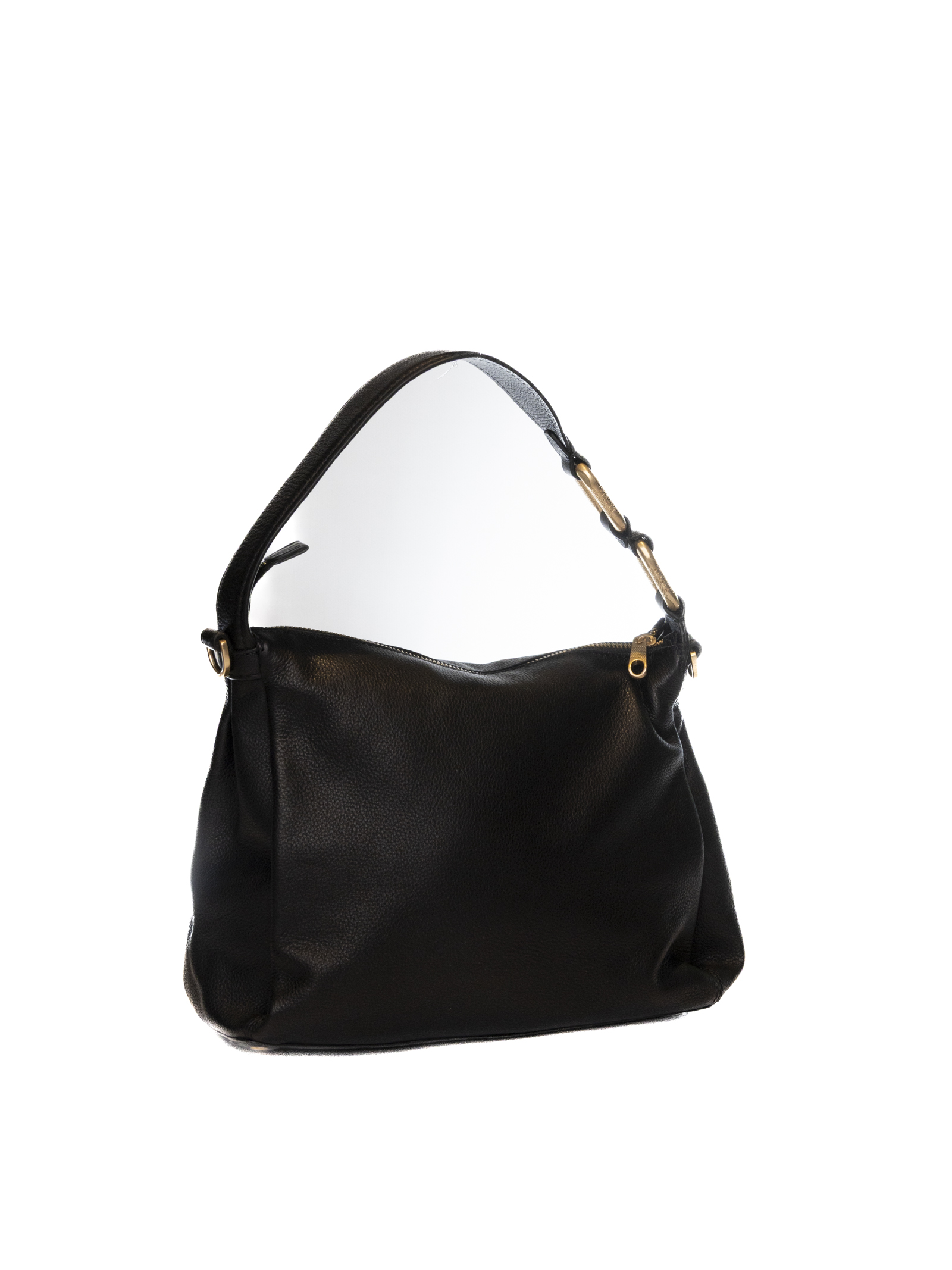 The soft, slightly rounded structure, combined with the diagonal zip and gold details,