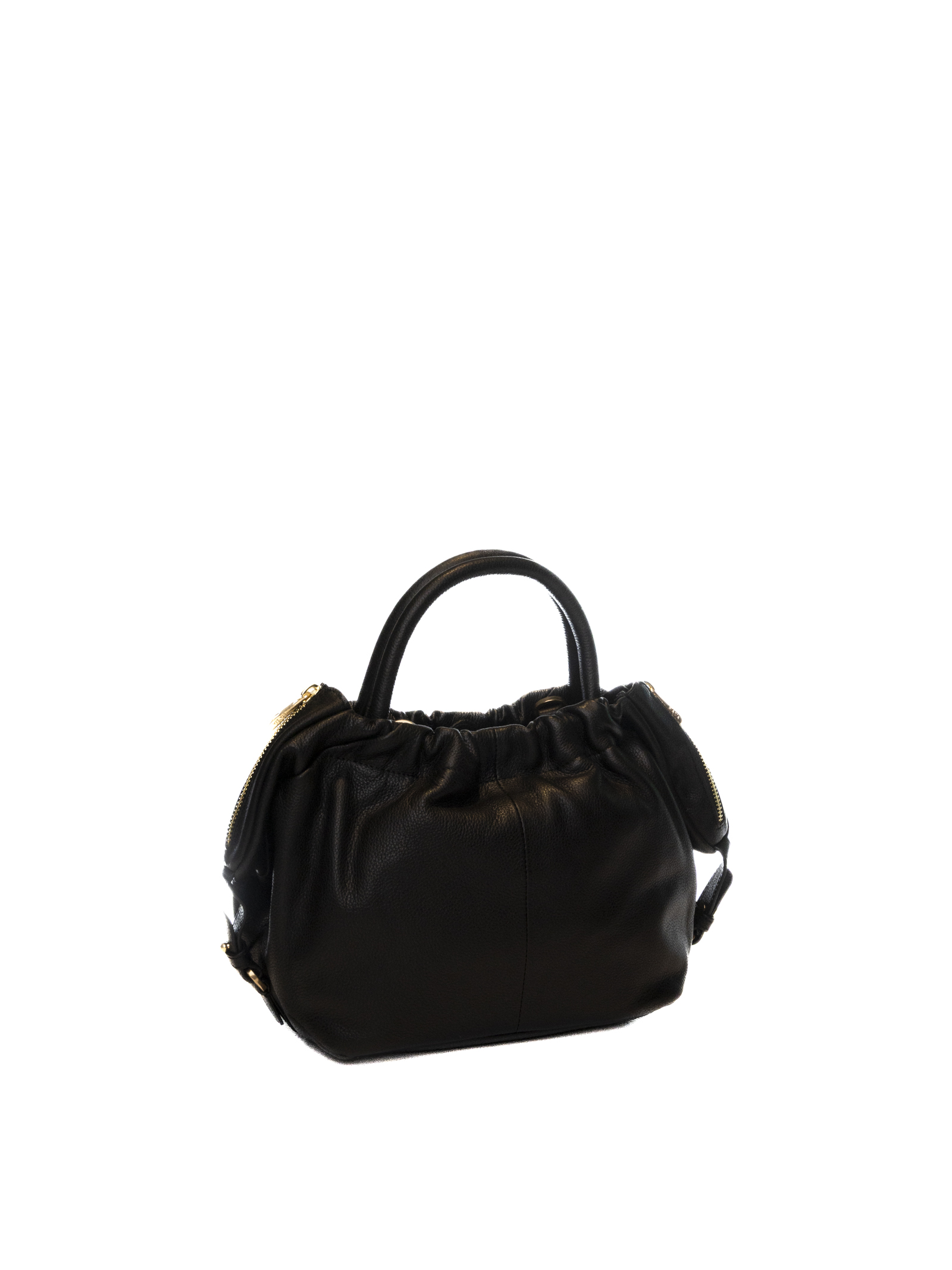 The soft, modern design, featuring a gathered-bag silhouette and gold-tone metal details, combines refined style and practicality, enhancing any outfit with a contemporary touch.