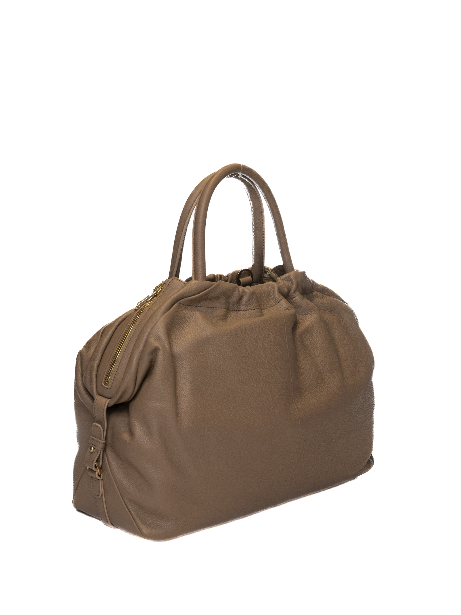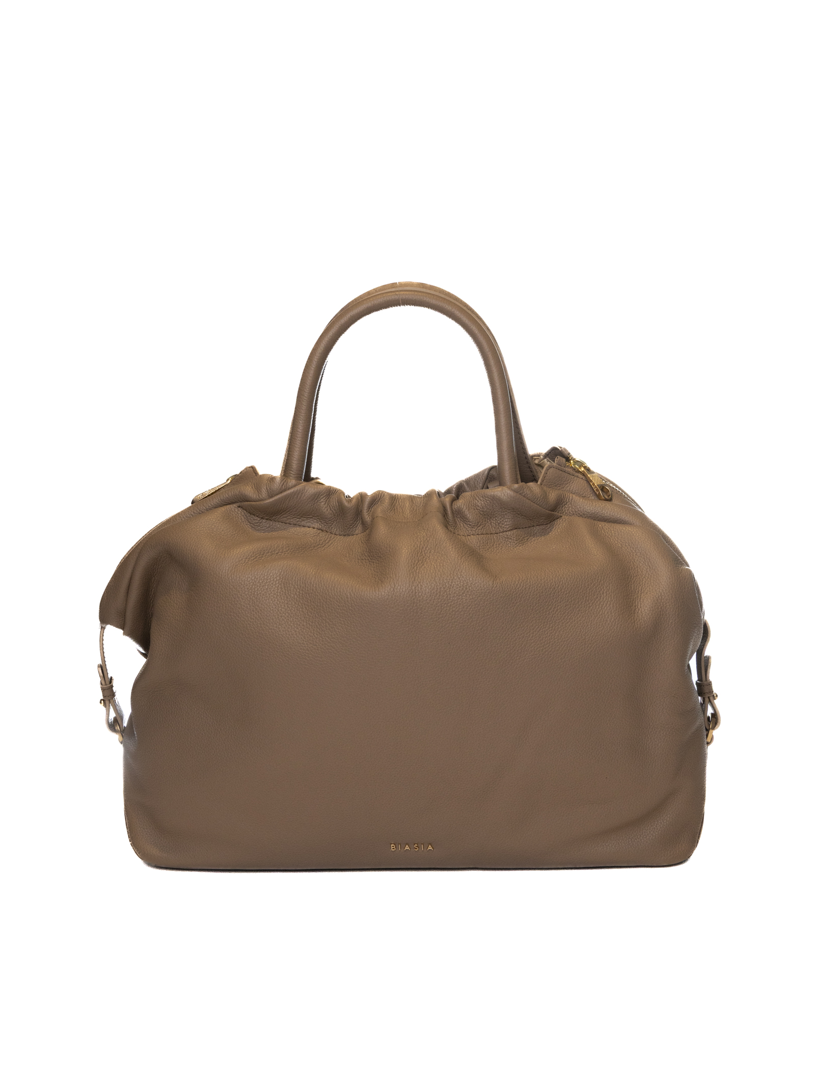 The soft and voluminous silhouette, enhanced by the gathered-bag design and gold hardware,