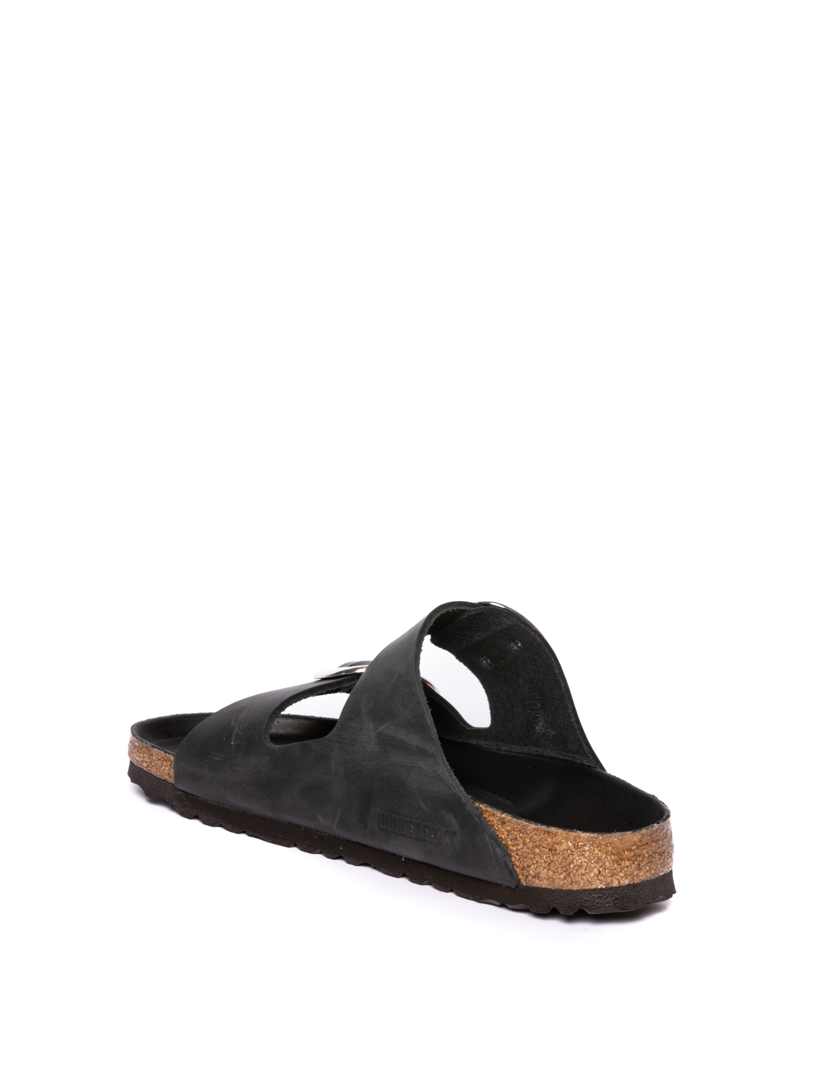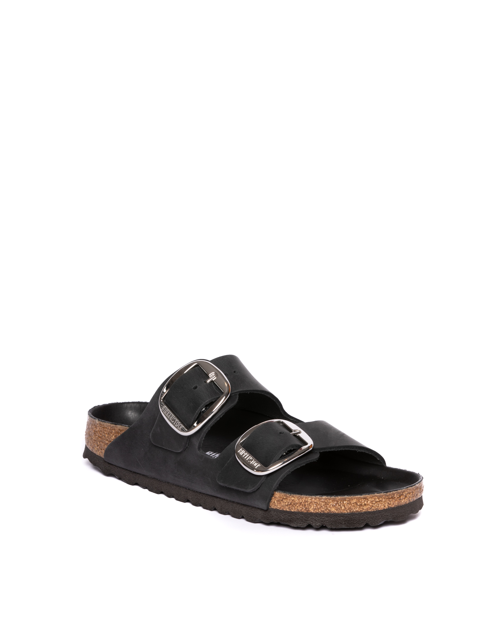 Birkenstock Arizona Big Buckle women's sandal in black, featuring a double-strap design and a more refined finish compared to the standard versions, distinguished by large metal pin buckles (Big Buckle), the signature element of this model.