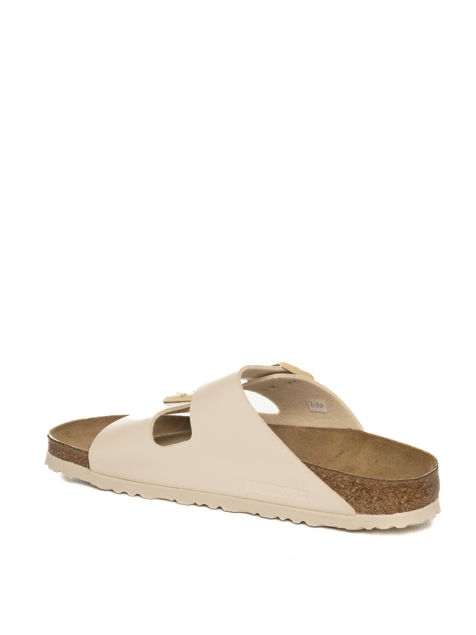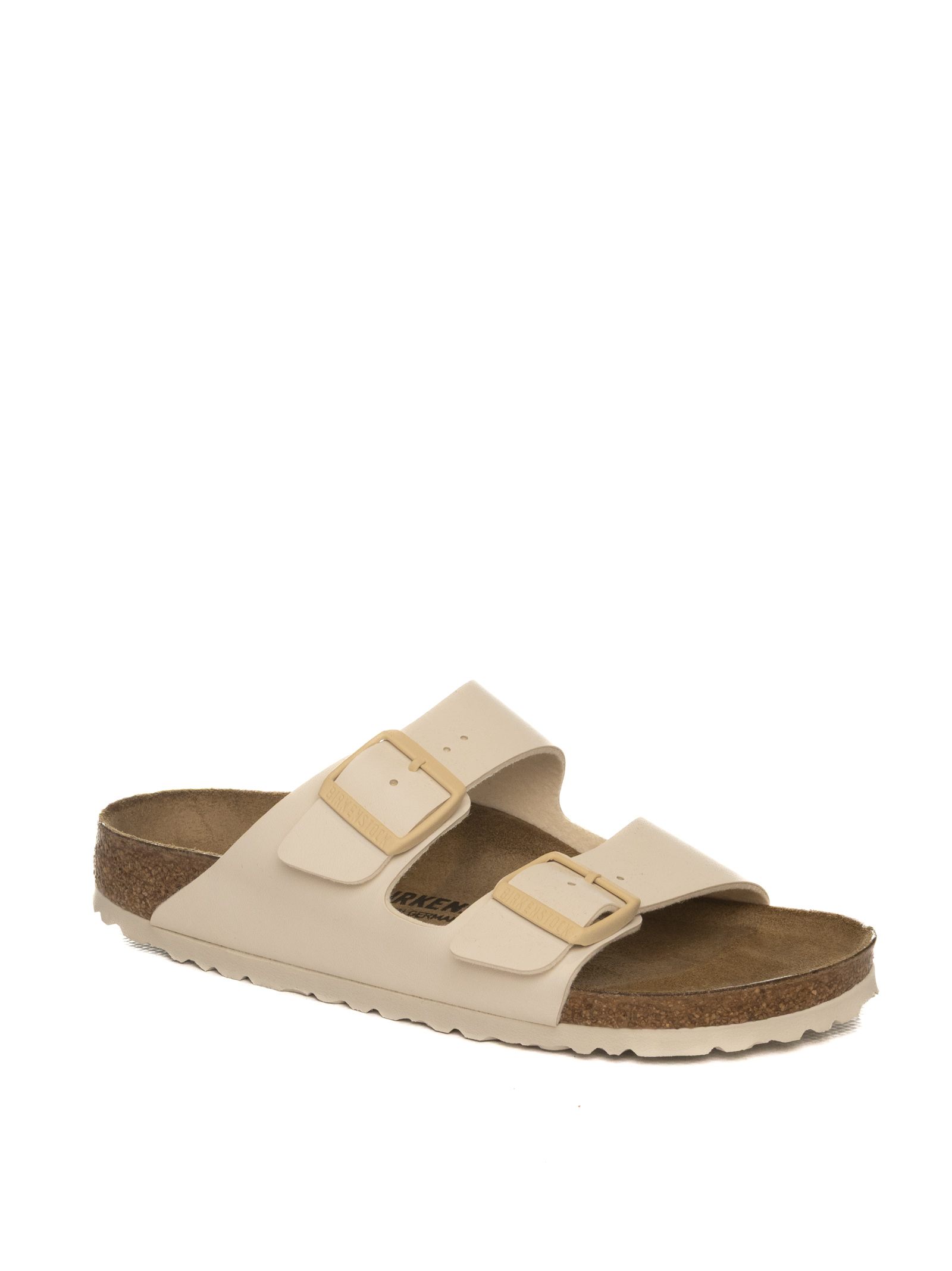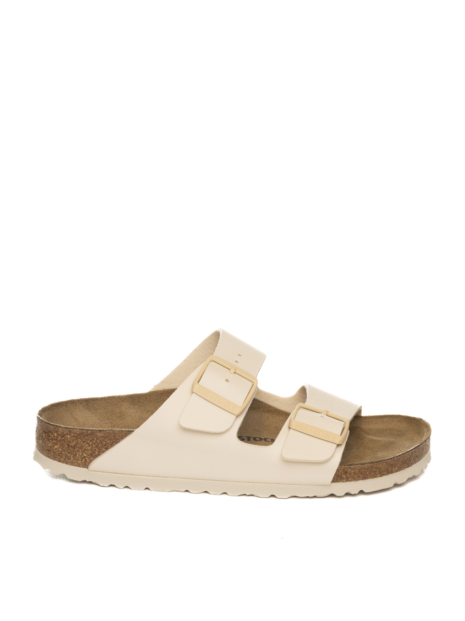 Birkenstock Arizona sandal in Eggshell Birkoflor, featuring the iconic double-strap design and an anatomical construction with unisex fit.
