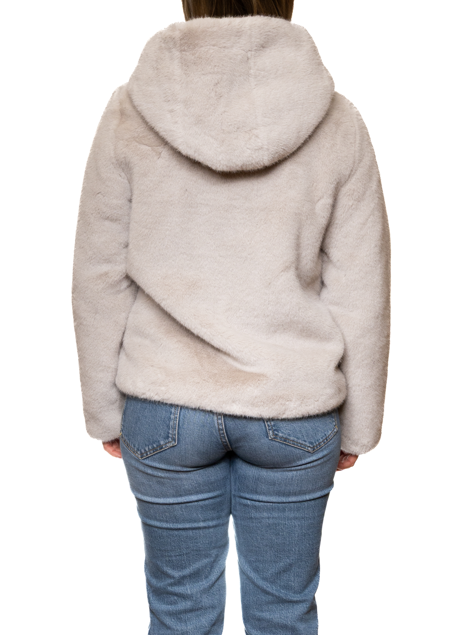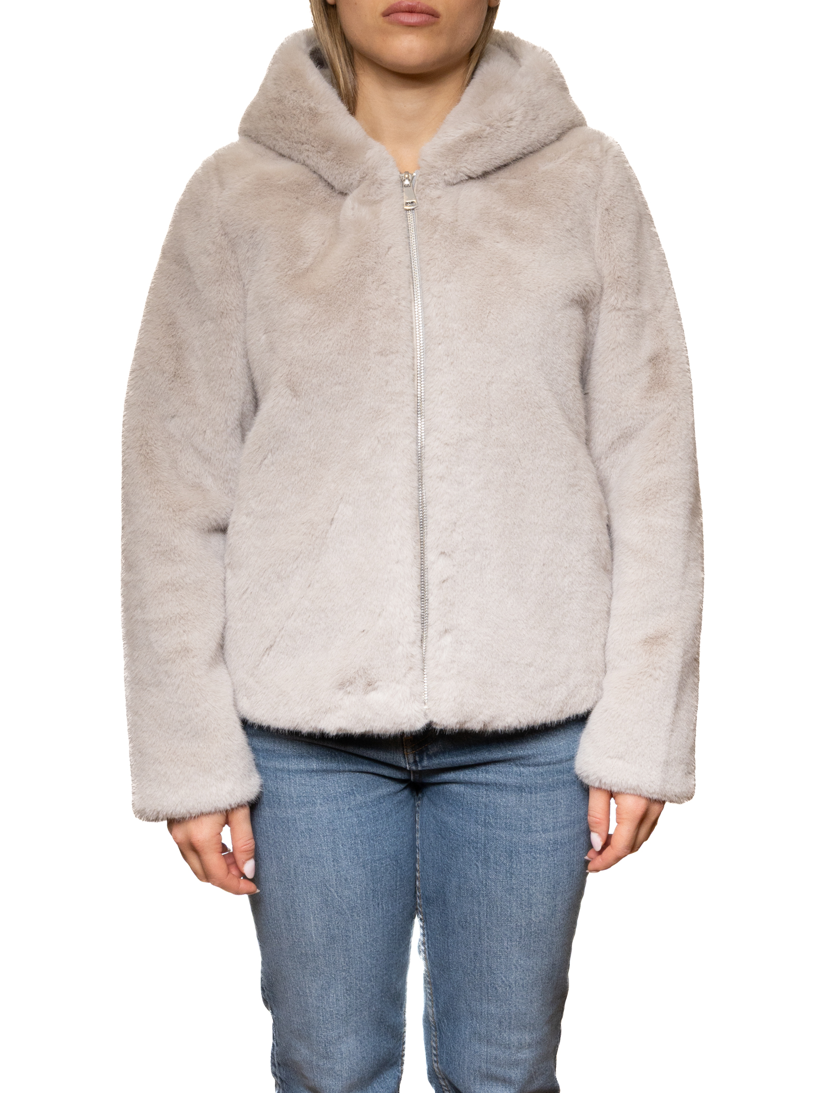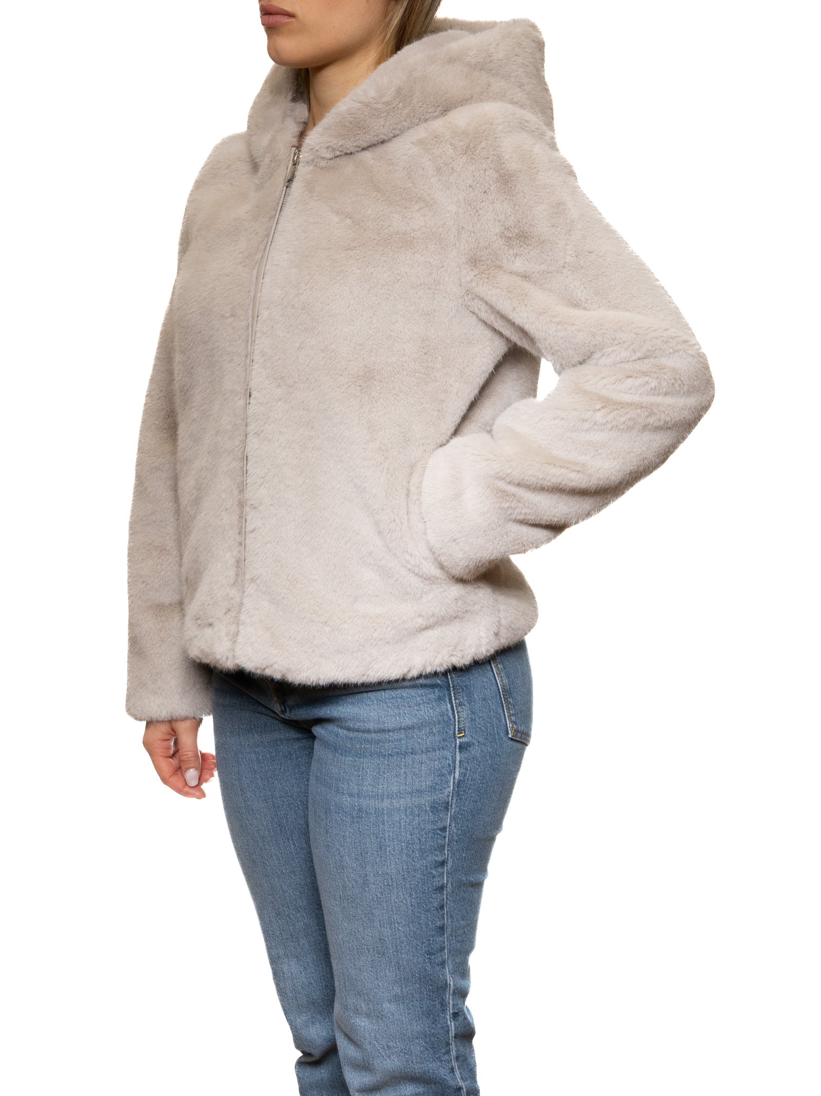 This women's faux fur jacket features a modern and enveloping design, perfect for facing the cold season in comfort and style. Crafted from a soft, velvety fur-effect fabric, it offers a pleasant feel and excellent thermal insulation without being heavy. Its simple, clean lines make it a versatile piece, ideal for casual and urban looks.