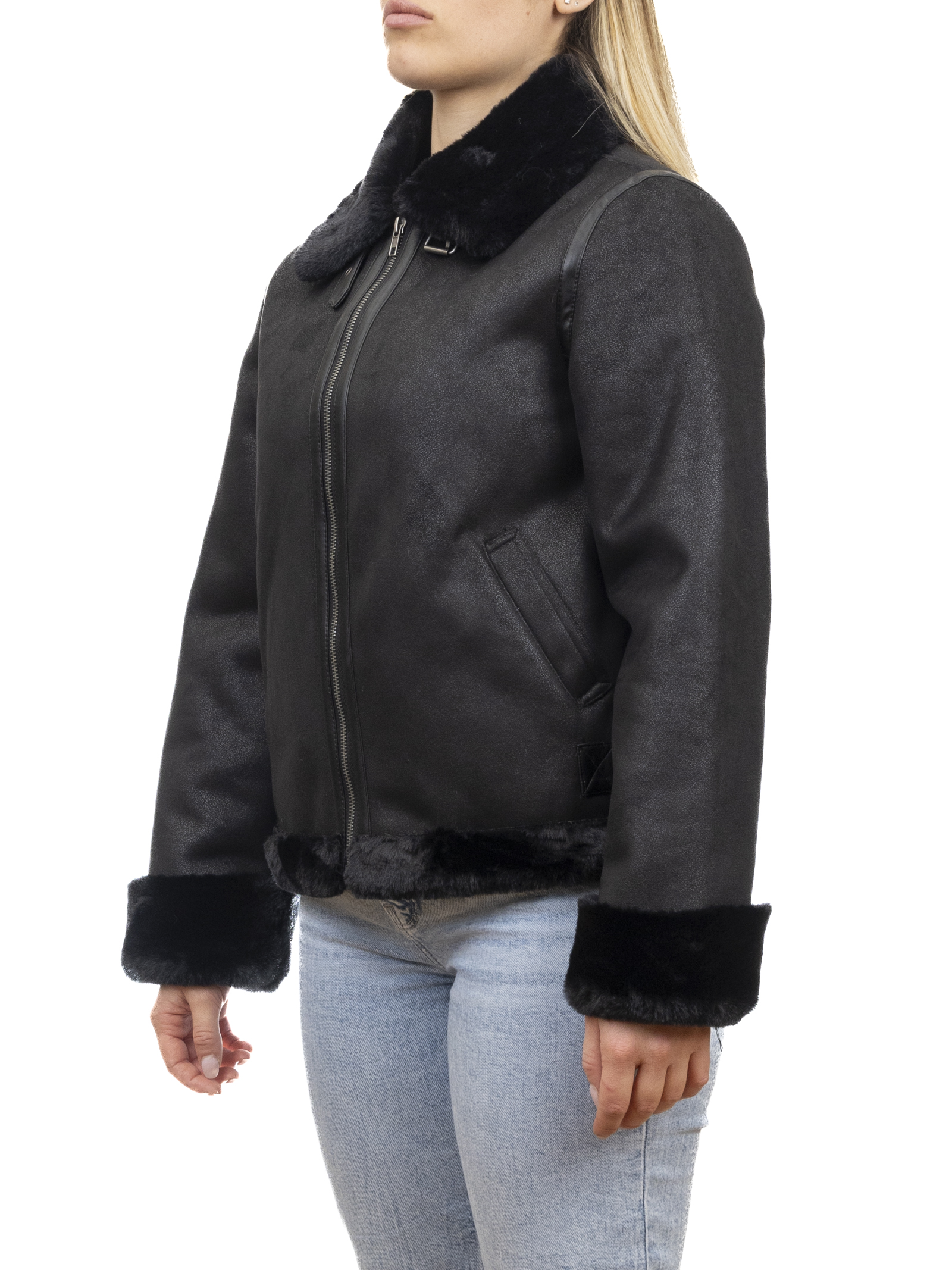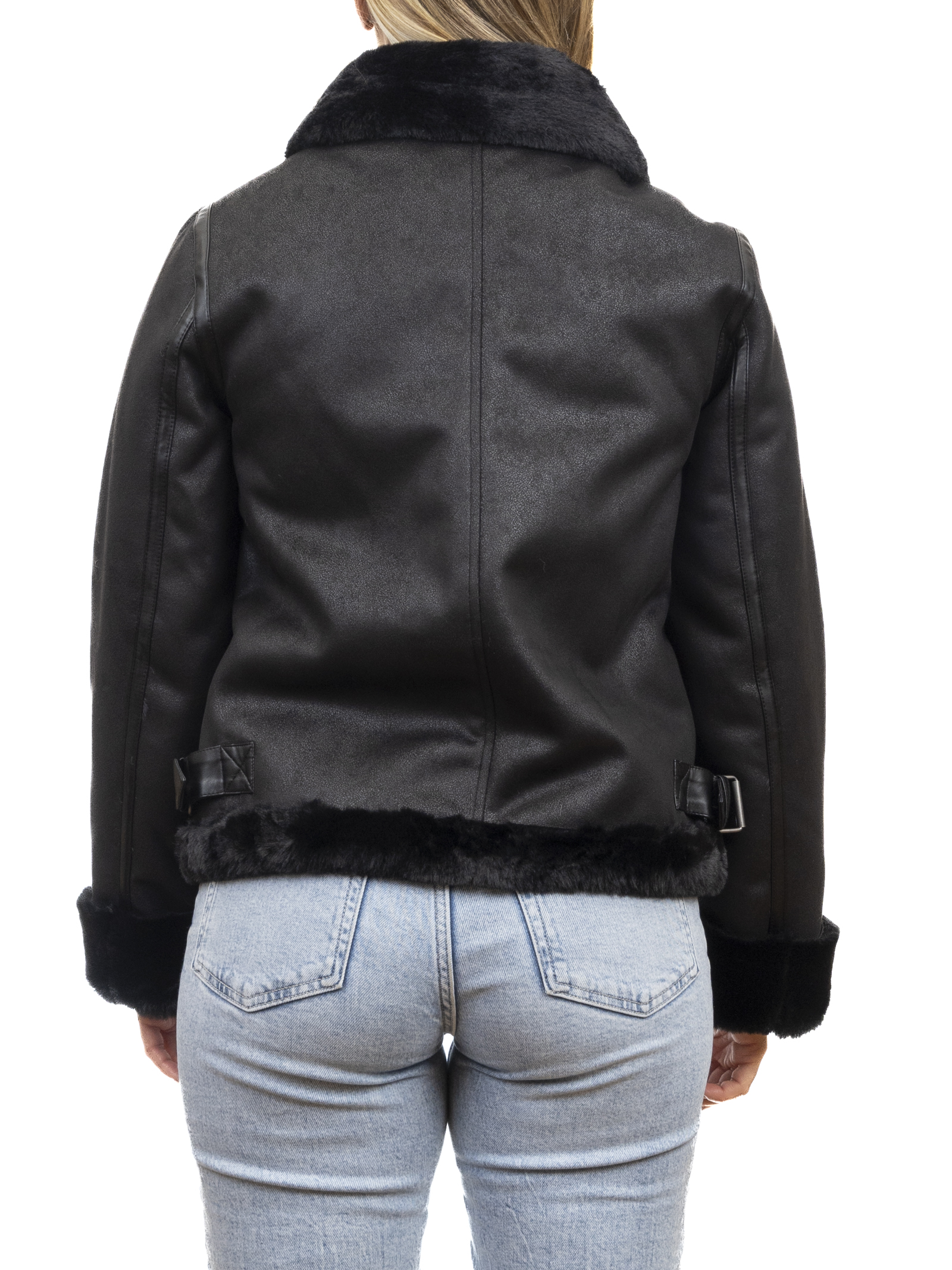 This women's shearling-effect jacket features a warm and sophisticated look, ideal for winter and for those seeking a garment that combines style and functionality. Crafted with a suede exterior and soft faux fur lining, it offers excellent thermal insulation while maintaining a modern and feminine silhouette. The contrast between the warm black of the outer fabric and the black of the fur trim adds a distinctive and sophisticated touch.