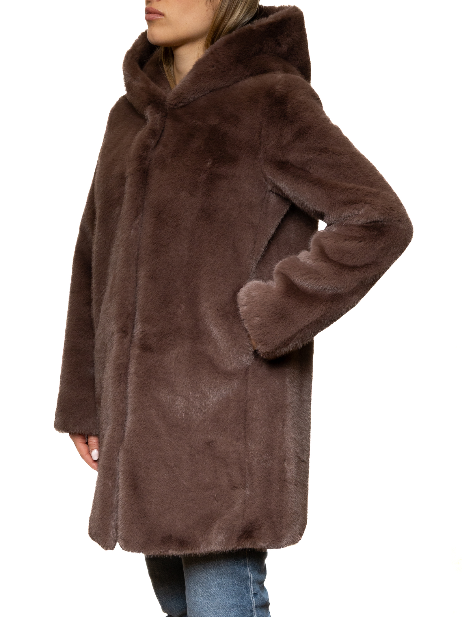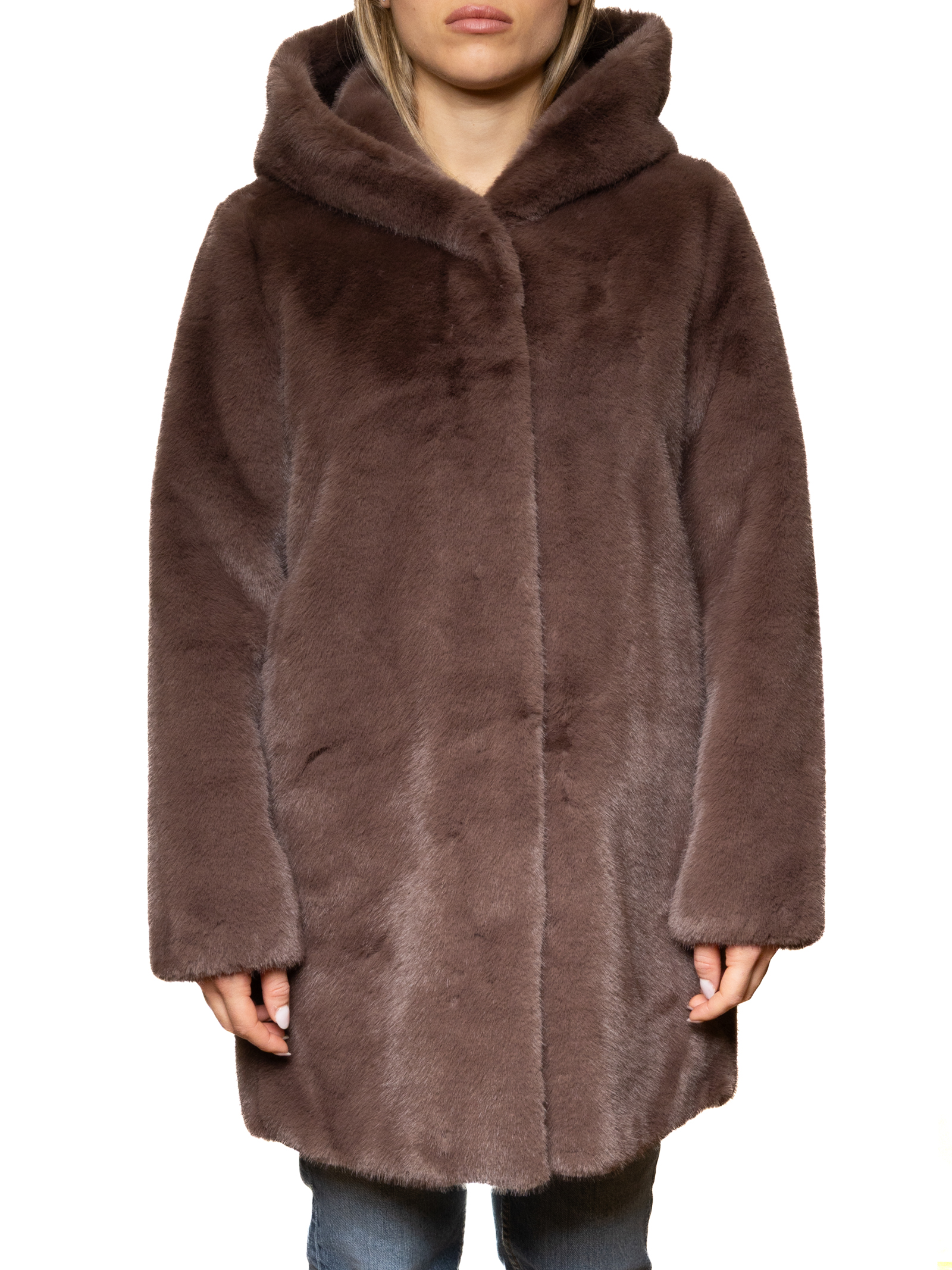 Women's faux fur coat with an elegant and modern design, ideal for those seeking a warm and cozy winter garment. Crafted from a soft, pleasantly smooth fabric, it provides comfort and warmth without being heavy. The fur-effect surface gives the garment a refined and contemporary look, perfect for completing casual, urban, or more sophisticated outfits.