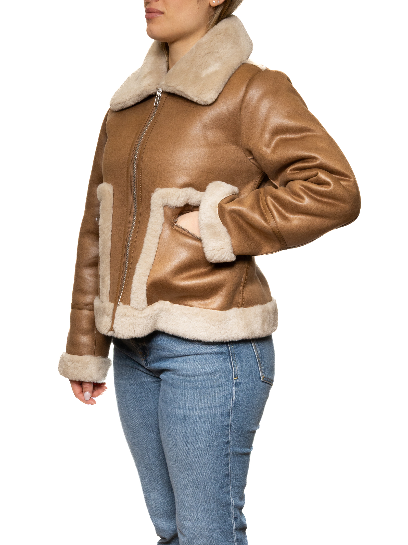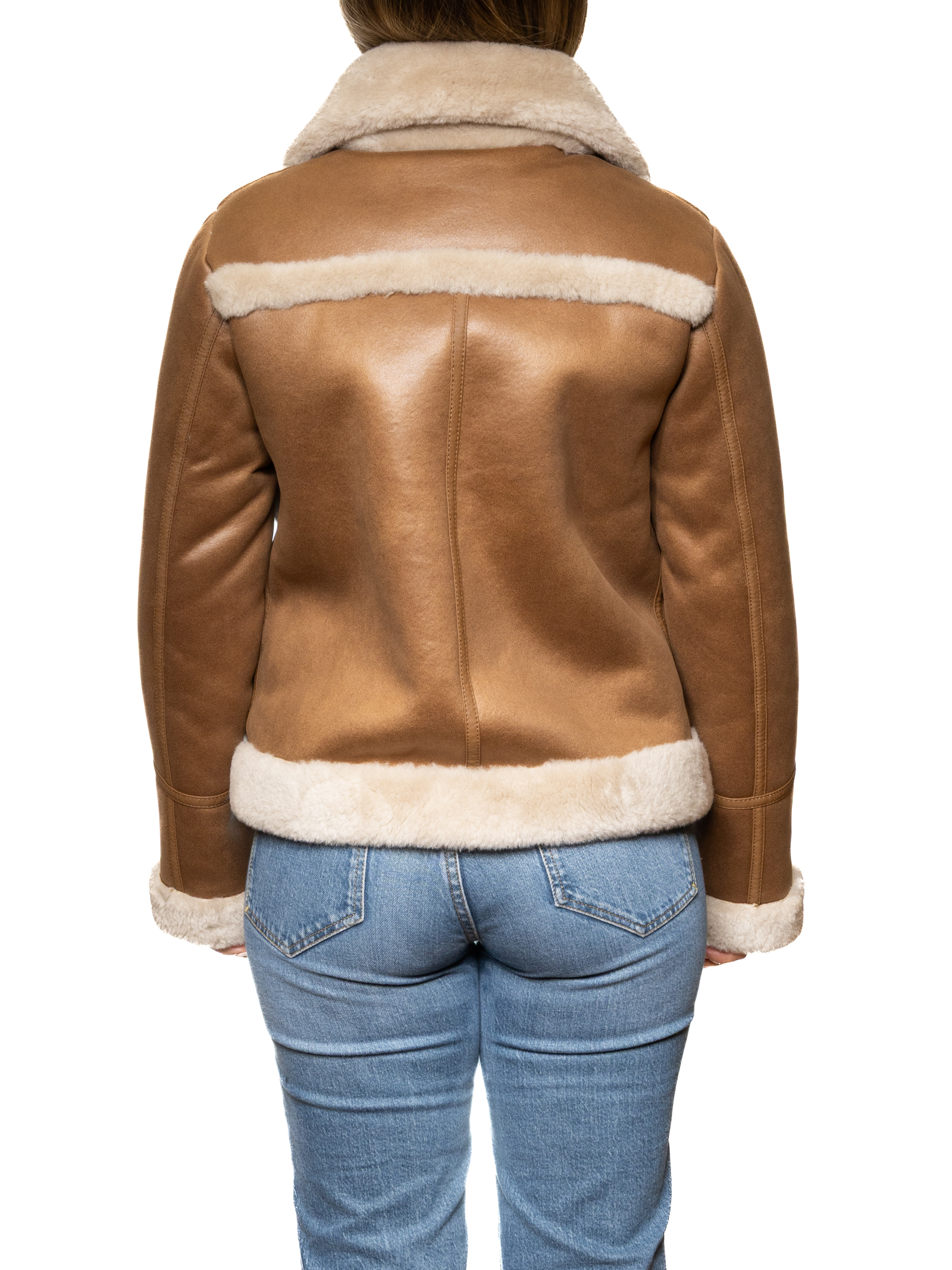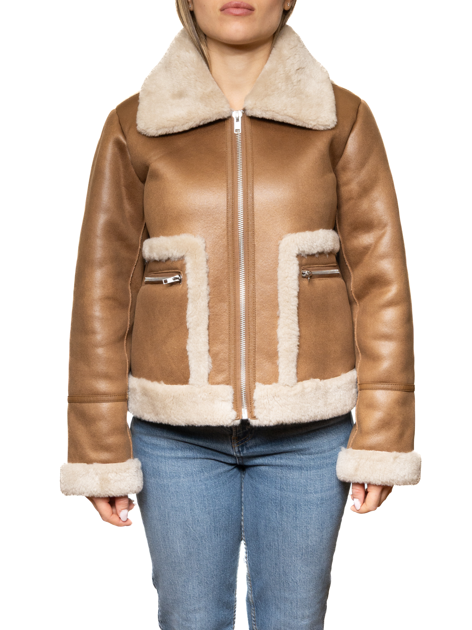 This women's faux shearling-style jacket, with a warm and sophisticated design, is perfect for facing the winter season with a trendy and sophisticated look. Crafted from soft and durable faux leather, it features a fully lined interior in cream-colored faux fur for excellent thermal insulation. Contrasting fur trims enhance the garment, creating a refined and captivating effect.