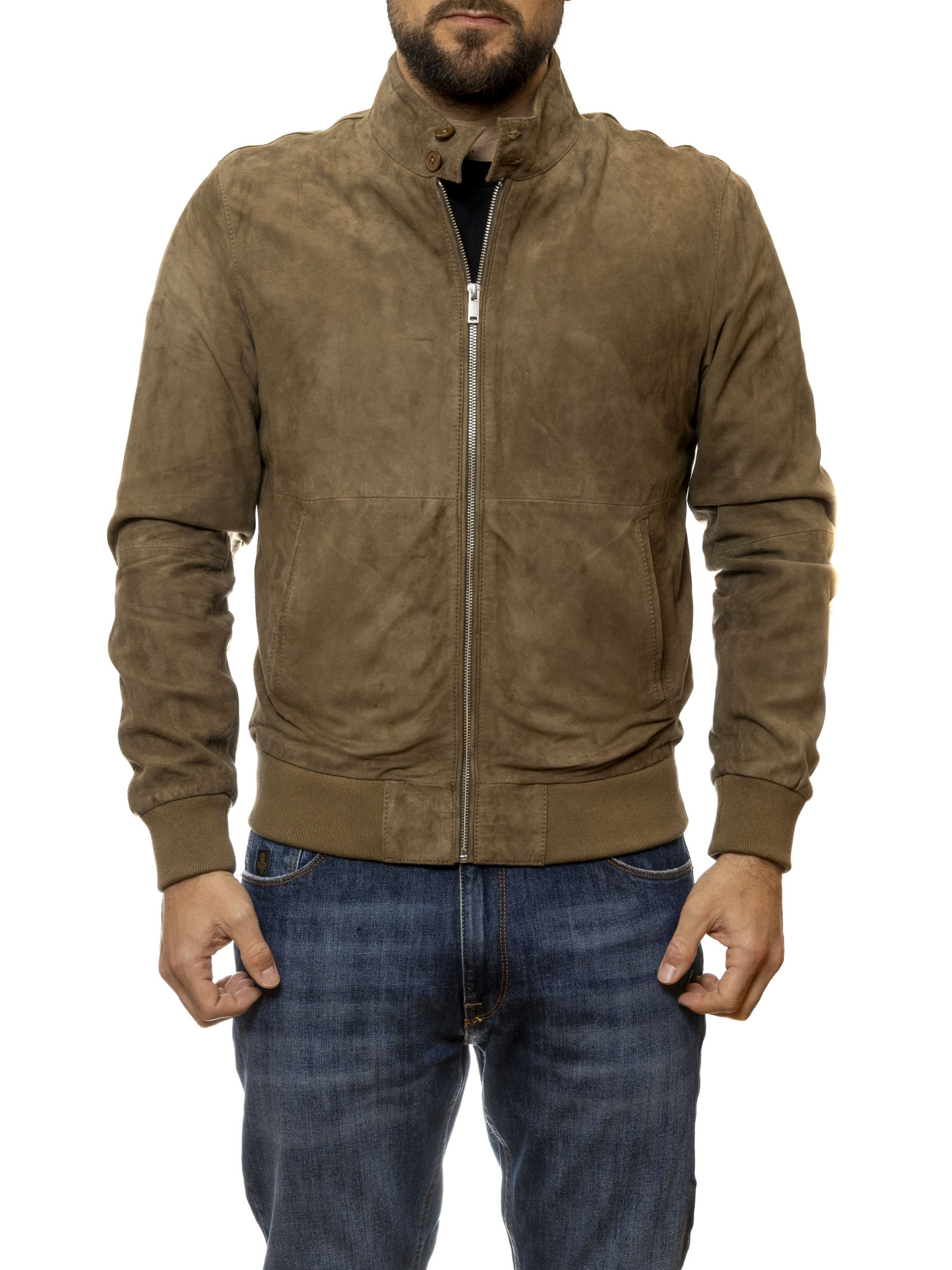 The design is defined by a bold yet functional aesthetic, featuring a mandarin collar with snap closure and a practical front closure with a contrasting silver full-length zip. It features elasticated knit trims at the cuffs and hem for a slim, dynamic fit, along with side welt pockets that maintain a clean, minimal look. The brown suede shade is extremely versatile: stunning when paired with blue denim for a bold everyday look, or with neutral and cream tones for a brighter, more sophisticated smart-casual outfit. It's the ideal outerwear for those seeking a distinctive, high-quality piece for the transitional season.