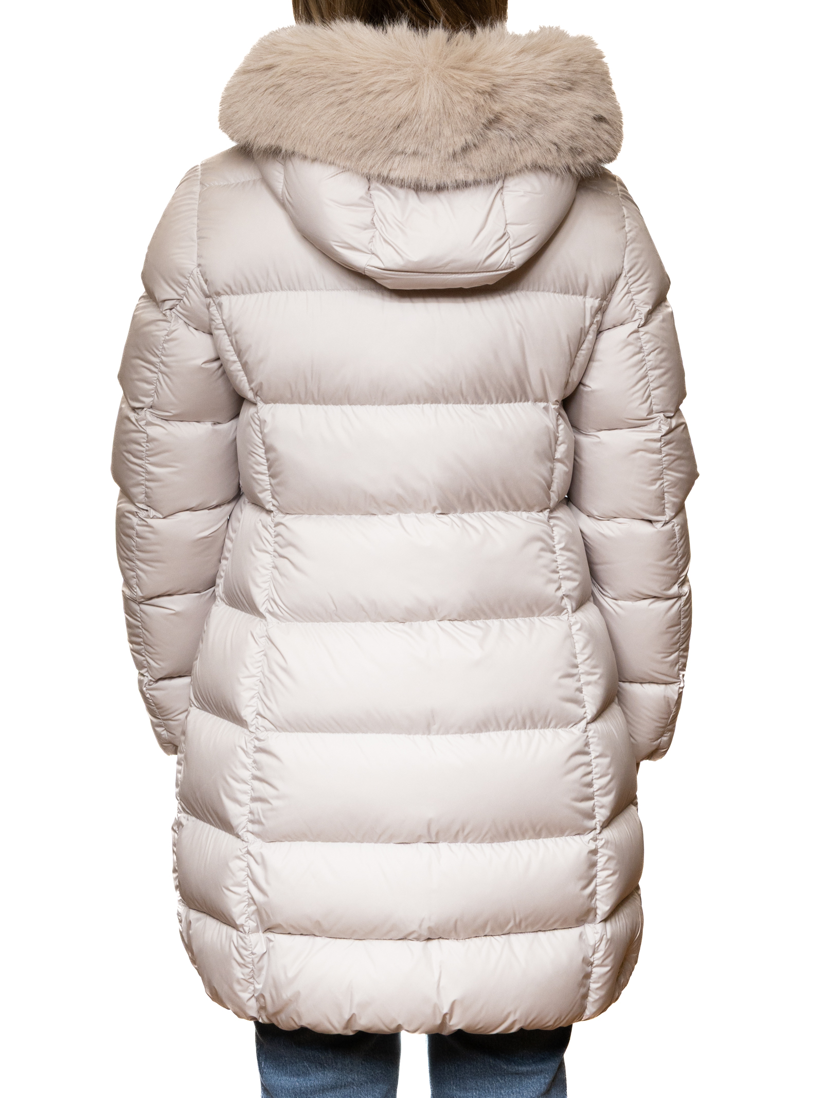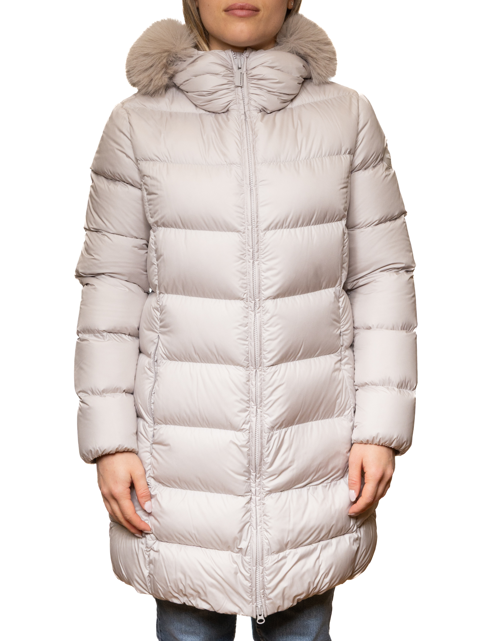 The front zip closure offers practicality and protection, while the integrated hood with soft faux fur adds an elegant touch and provides extra protection on windy or rainy days. The sleeves and comfortable fit allow for freedom of movement, while maintaining a clean and refined look.