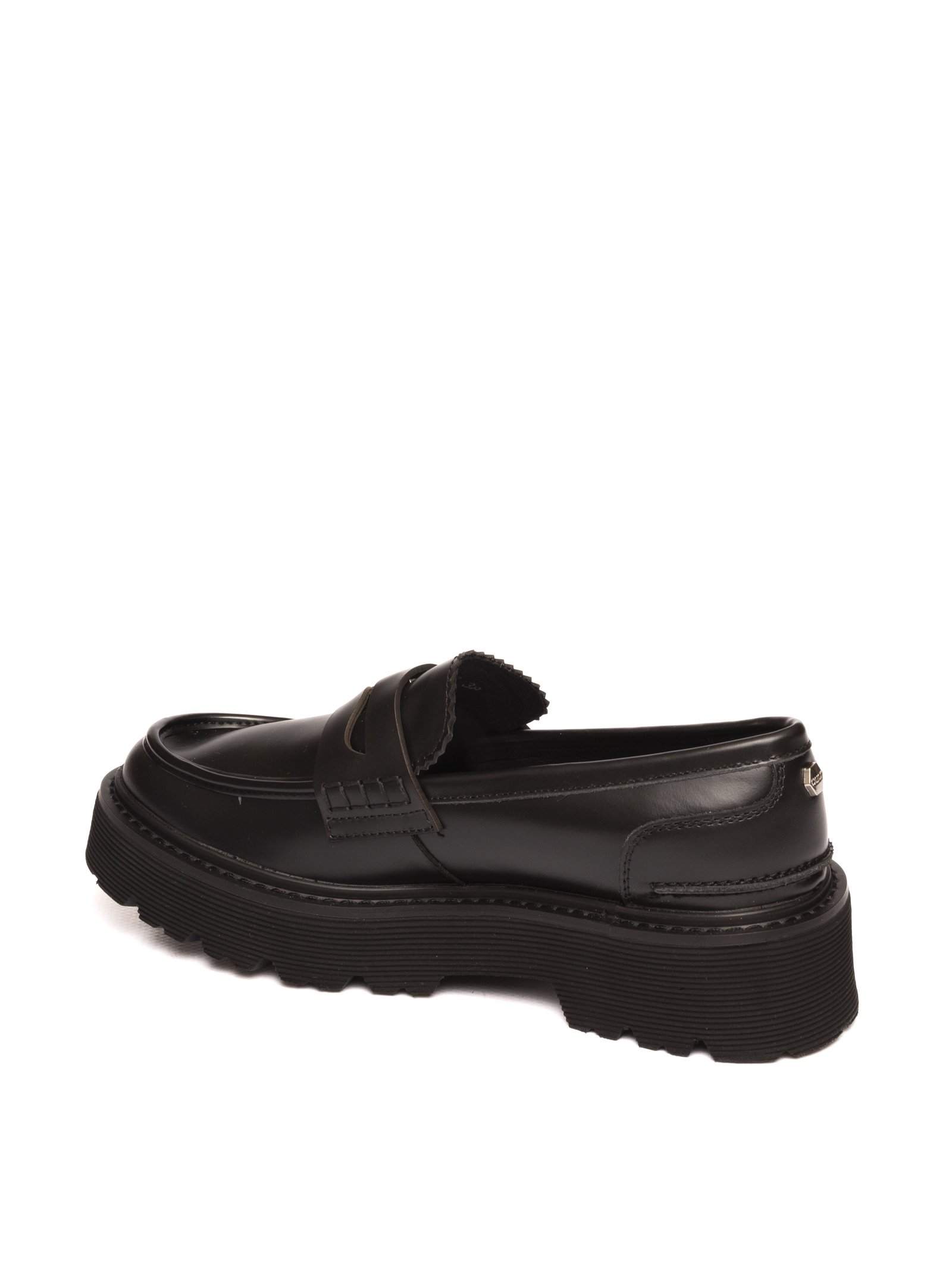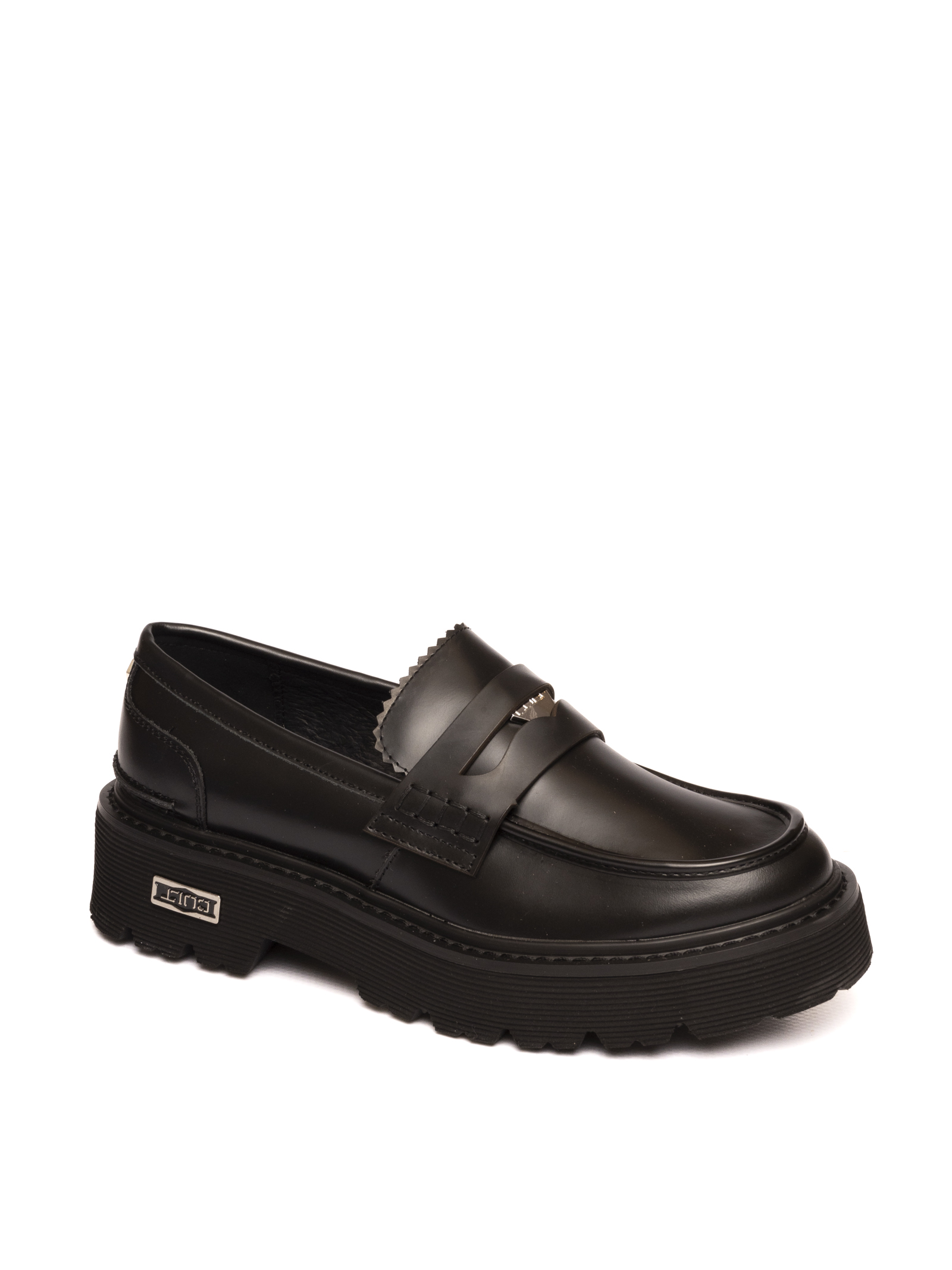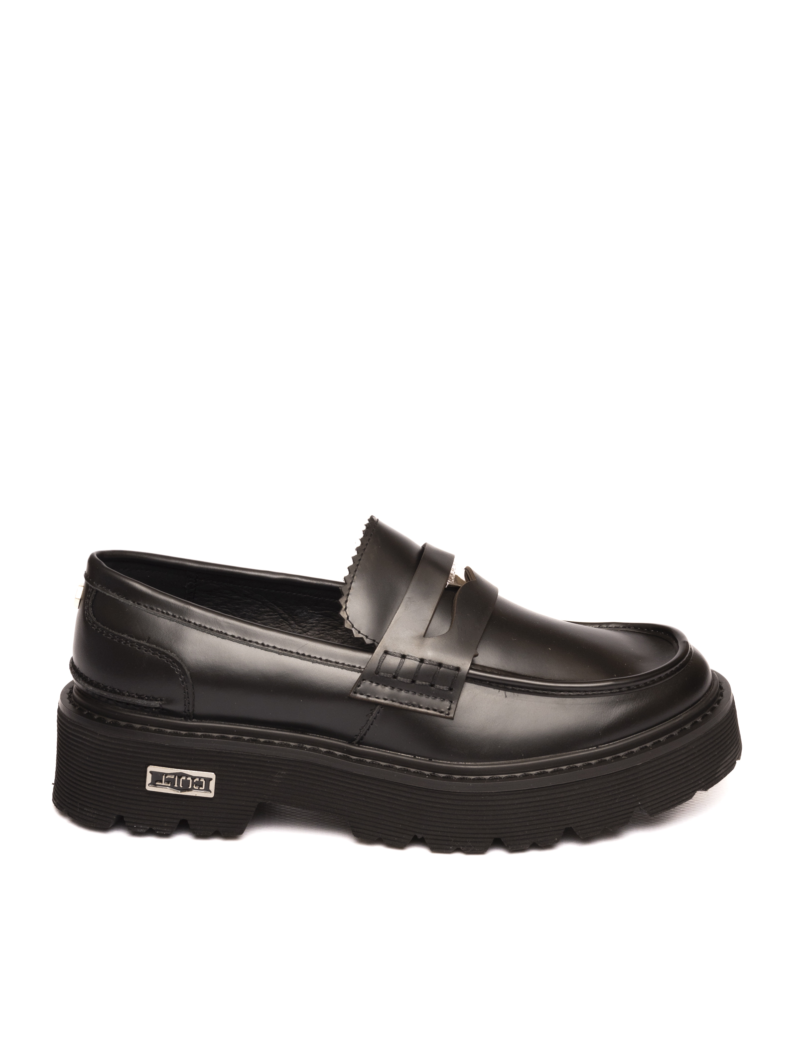 The black Slash loafer by CULT combines classic elegance and urban style. Crafted from premium smooth leather, it features raised stitching and a lightweight yet durable EVA lug sole. The metallic logo on the non-slip rubber sole adds a distinctive detail.
