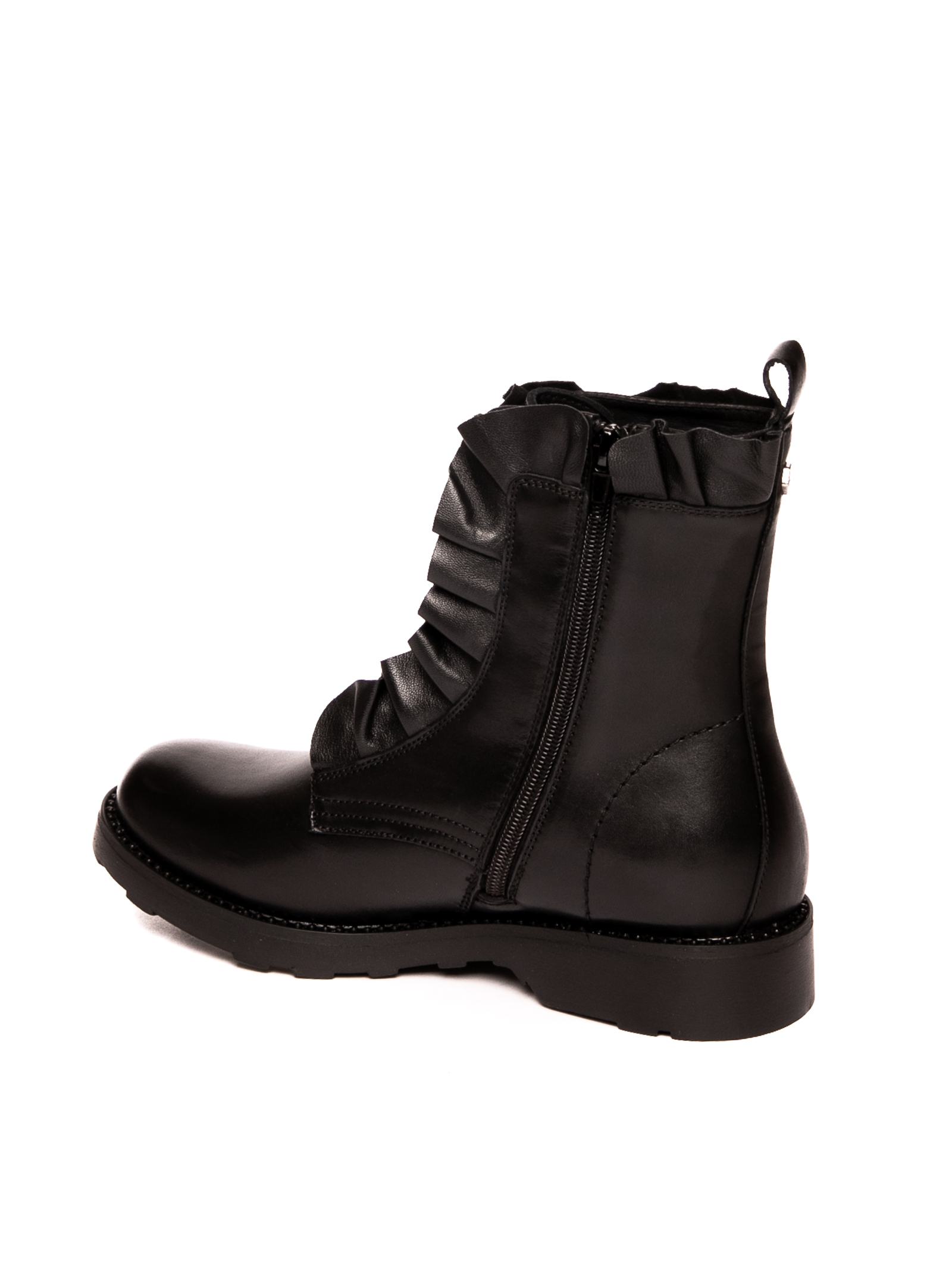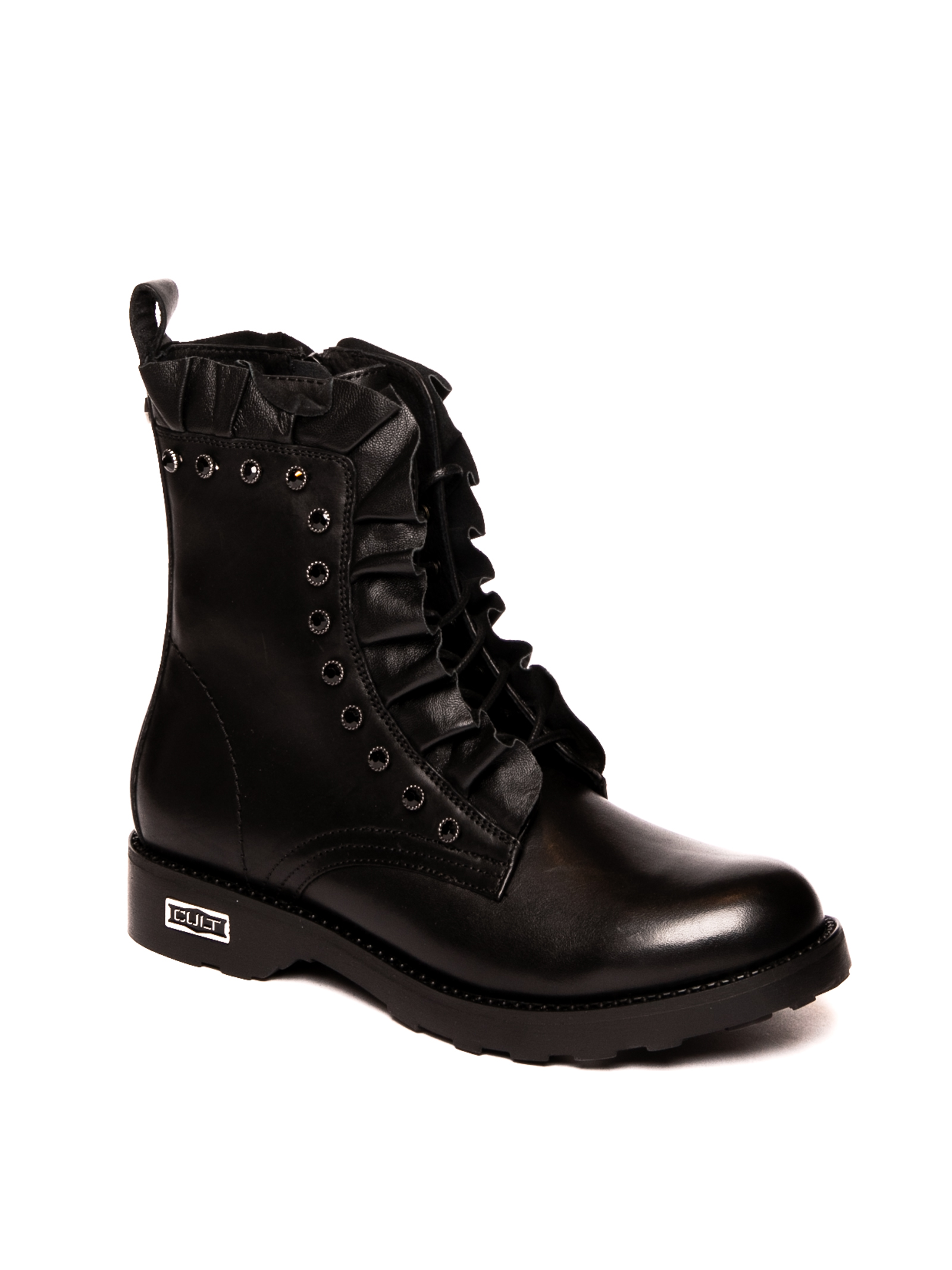 The black Zeppelin combat boot by CULT combines femininity and rock spirit. Crafted from high-quality soft leather, it features a lace-up front closure, ruffled details, a logo on the tongue, and a pull tab at the back. The double-sided rubber sole with a metallic logo adds character and comfort, while the non-slip tread ensures stability.
