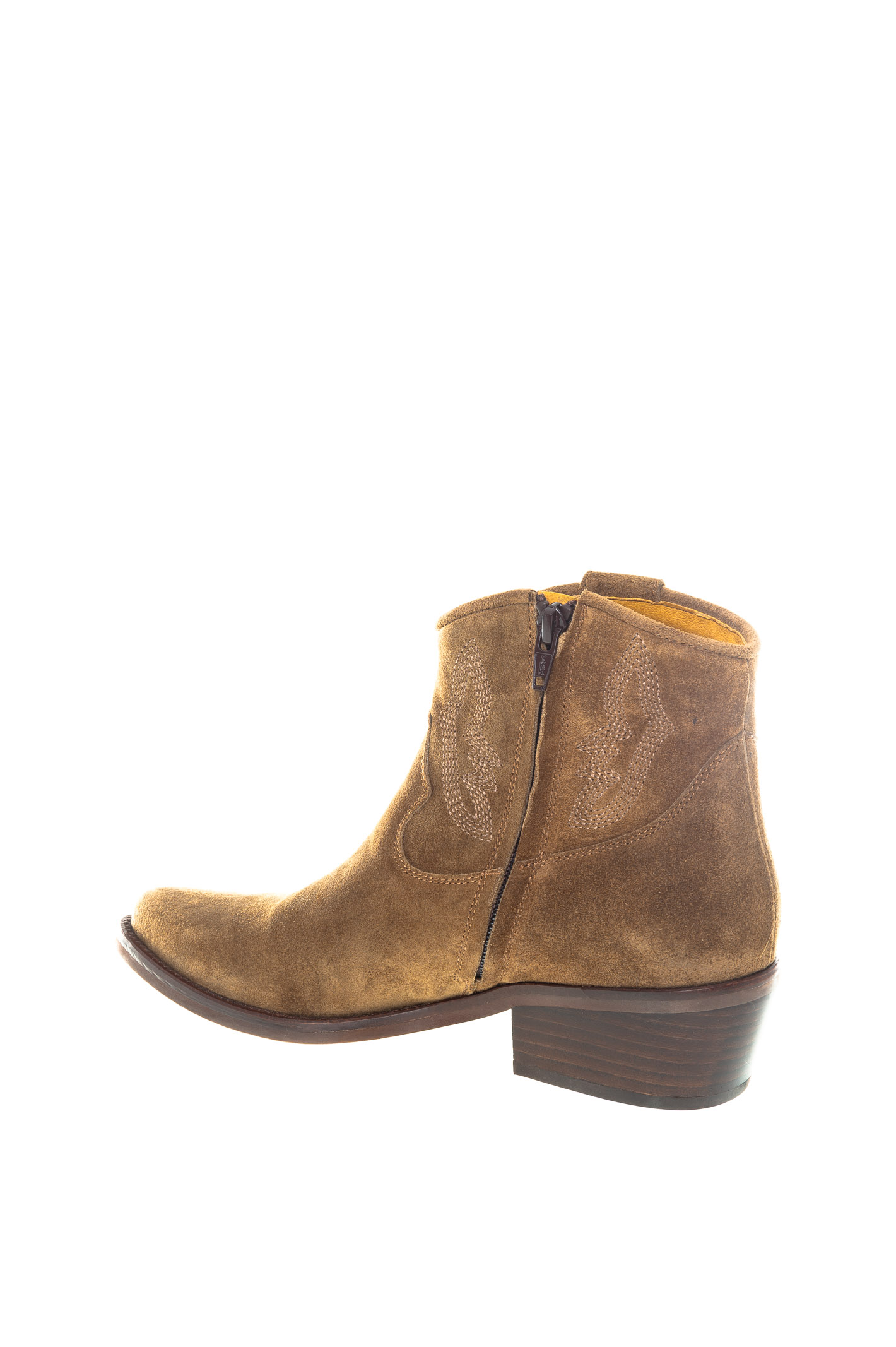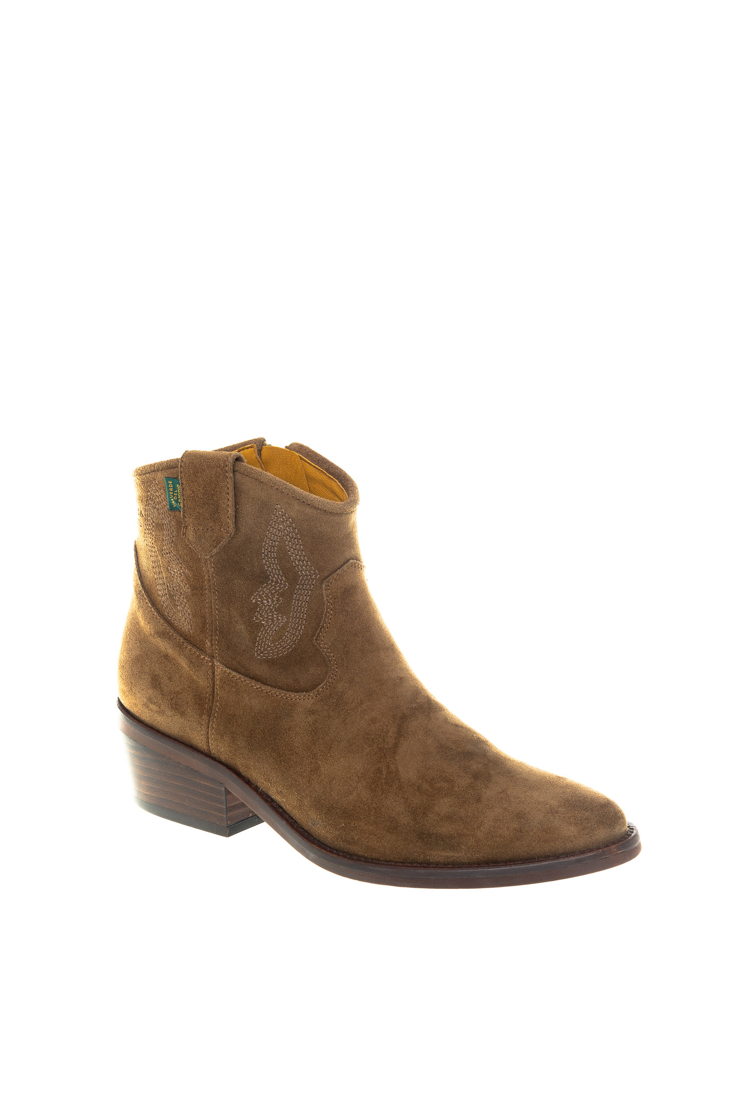 Artisan pointed ankle boot in greased suede. Dakota Boots lettering logo engraved on the upper upper. Internal side zip that facilitates the fit. Texan embossed seams decorate the upper on both sides. External side puller in suede that facilitates the fit. Square heel 50 mm. Made in Spain.