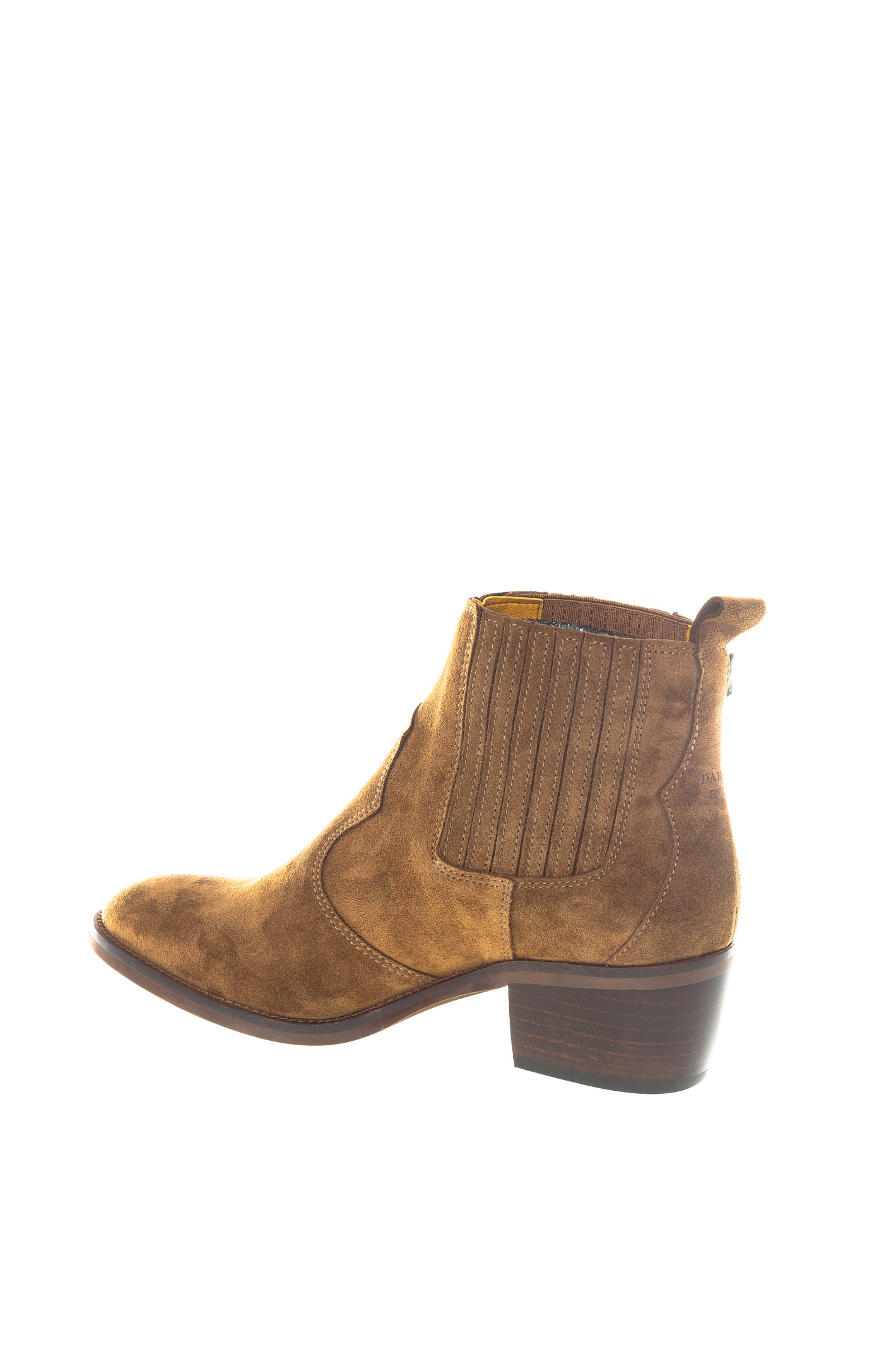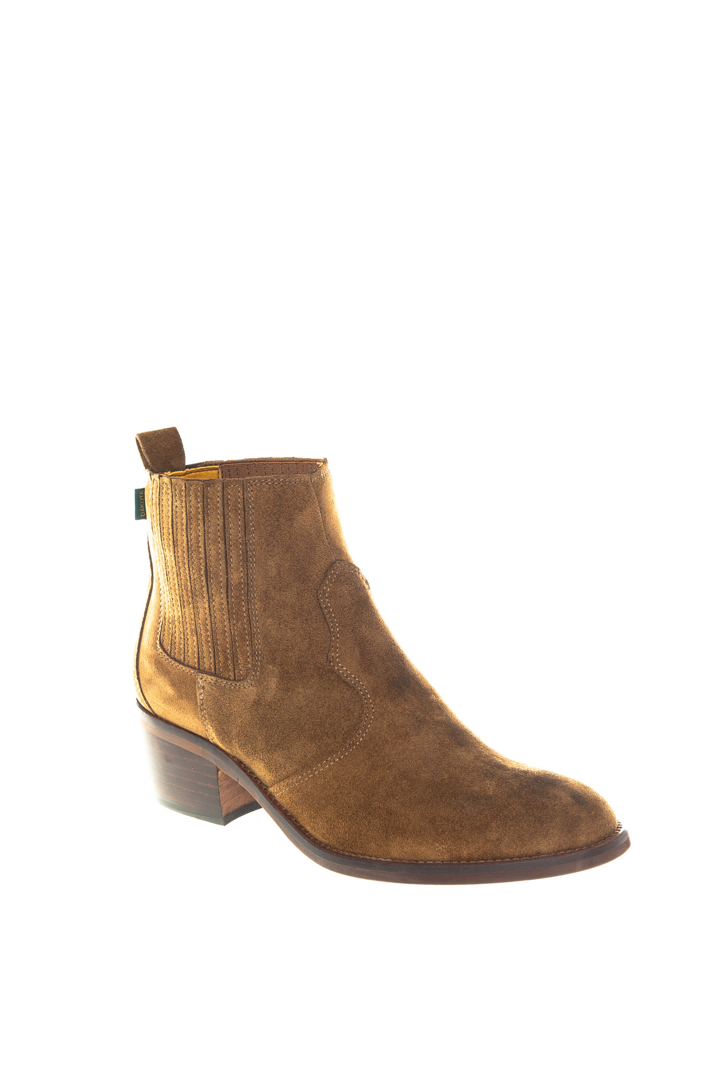 Handcrafted pointed ankle boot in greased suede. Dakota Boots lettering logo on the upper upper. Side elastic band. Square heel 50 mm. Made in Spain