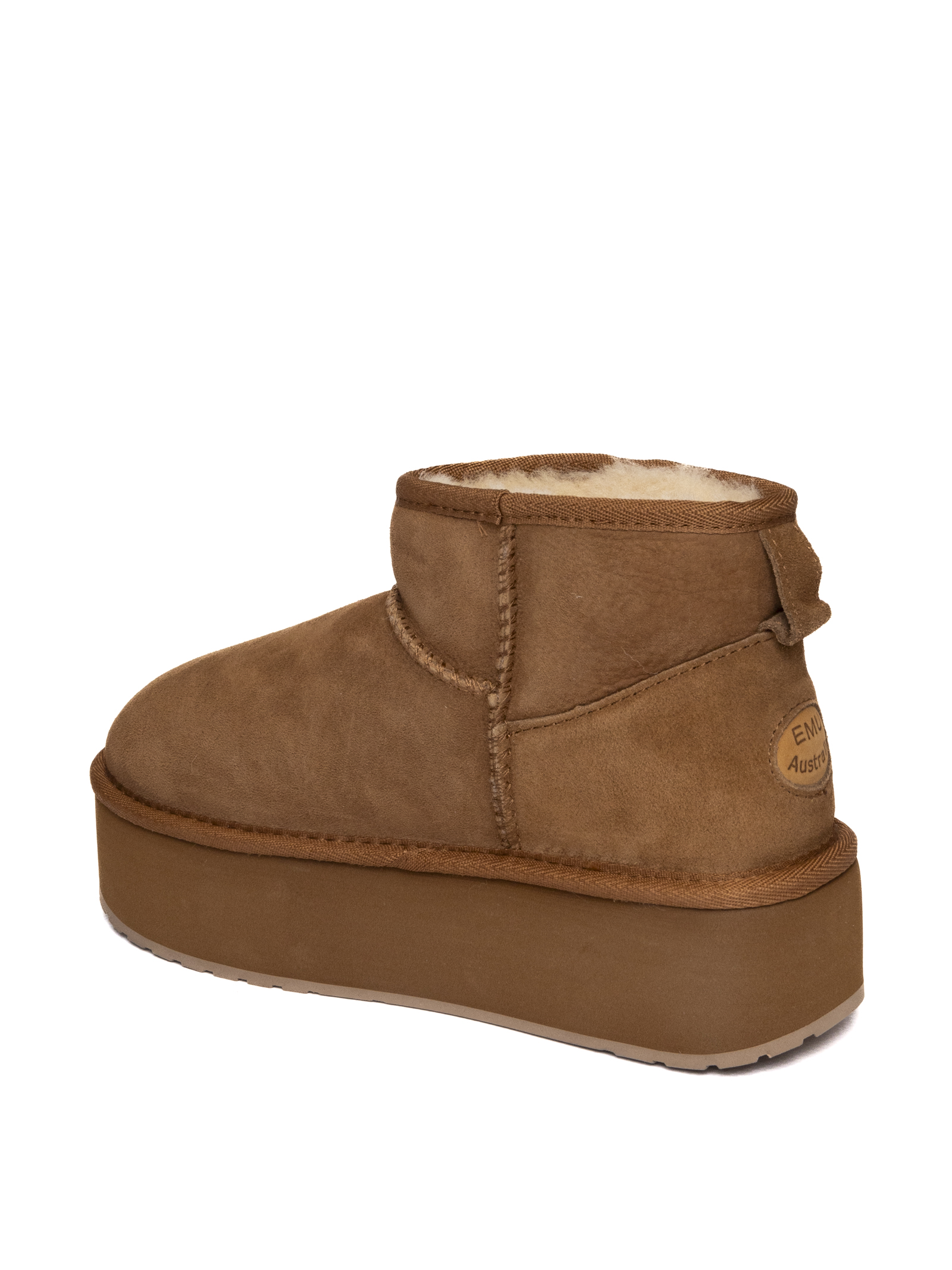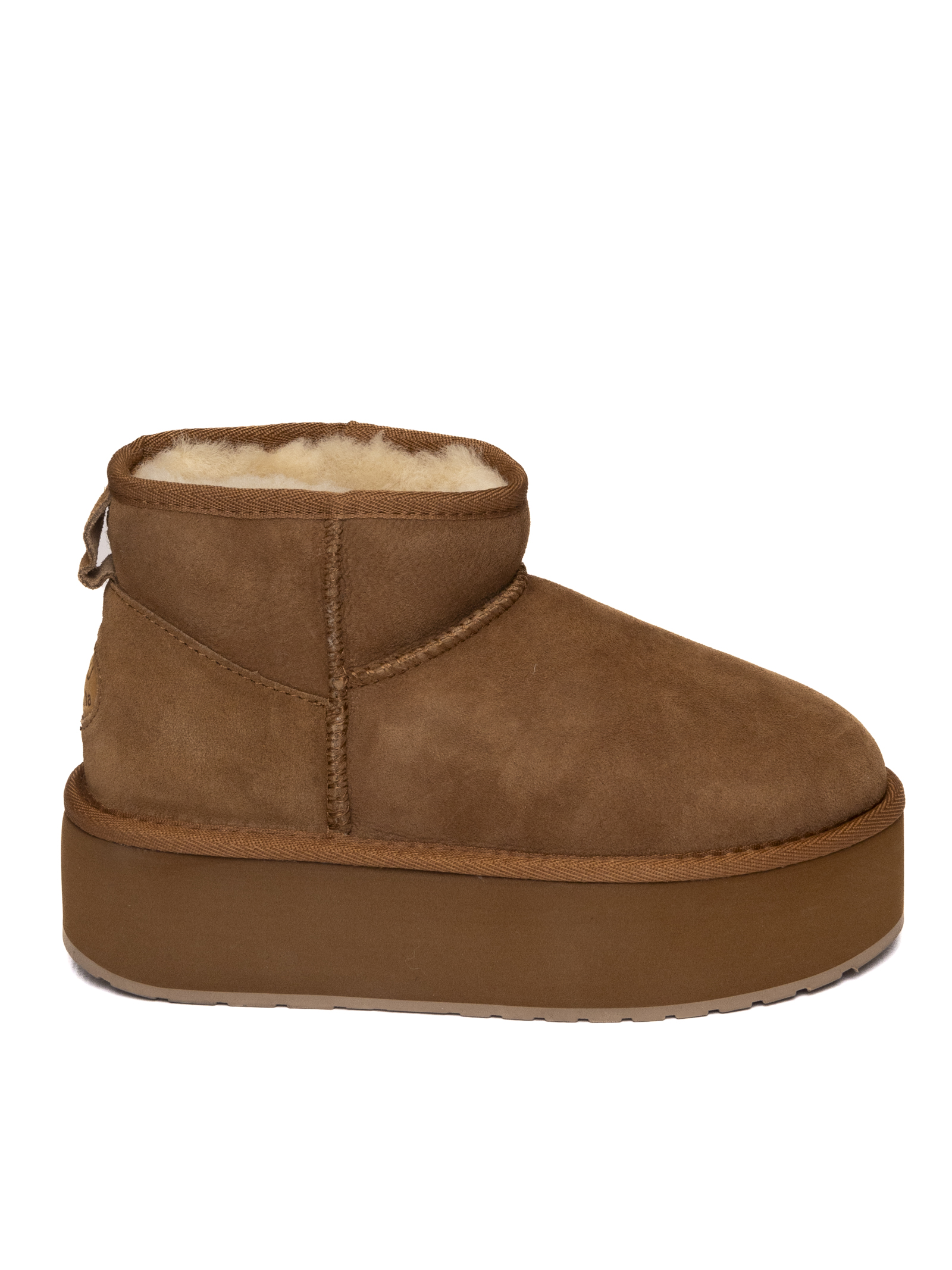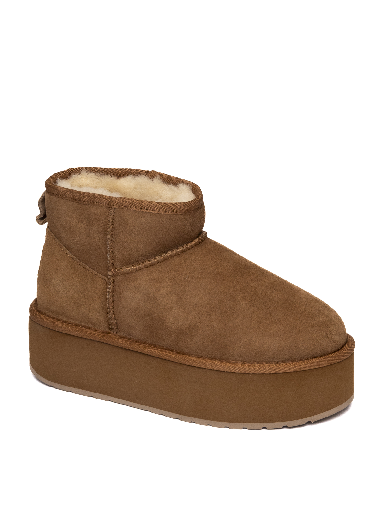 Sheepskin ankle boot. Rear tie rod. Water and stain resistant. Platform rubber sole. Rubber height 50mm.