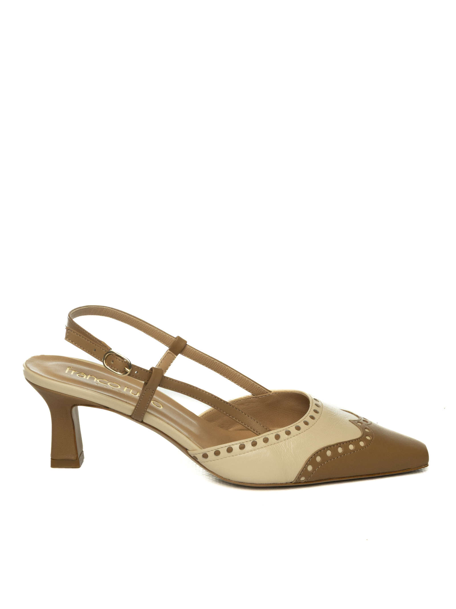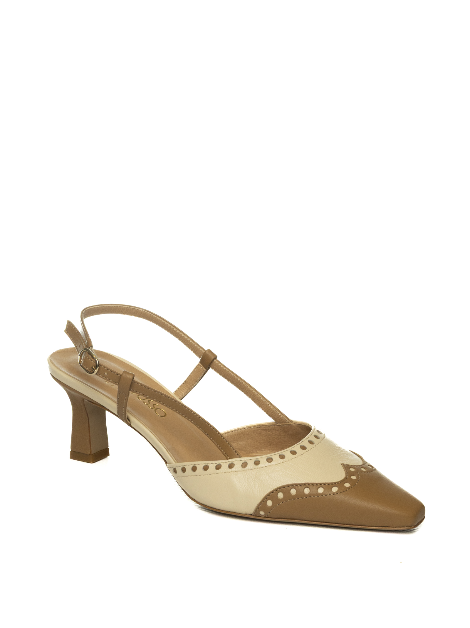 Leather slingback. Adjustable side strap closure. Leather insole and lining. Semi-square toe. Heel height 50mm. Made in Italy