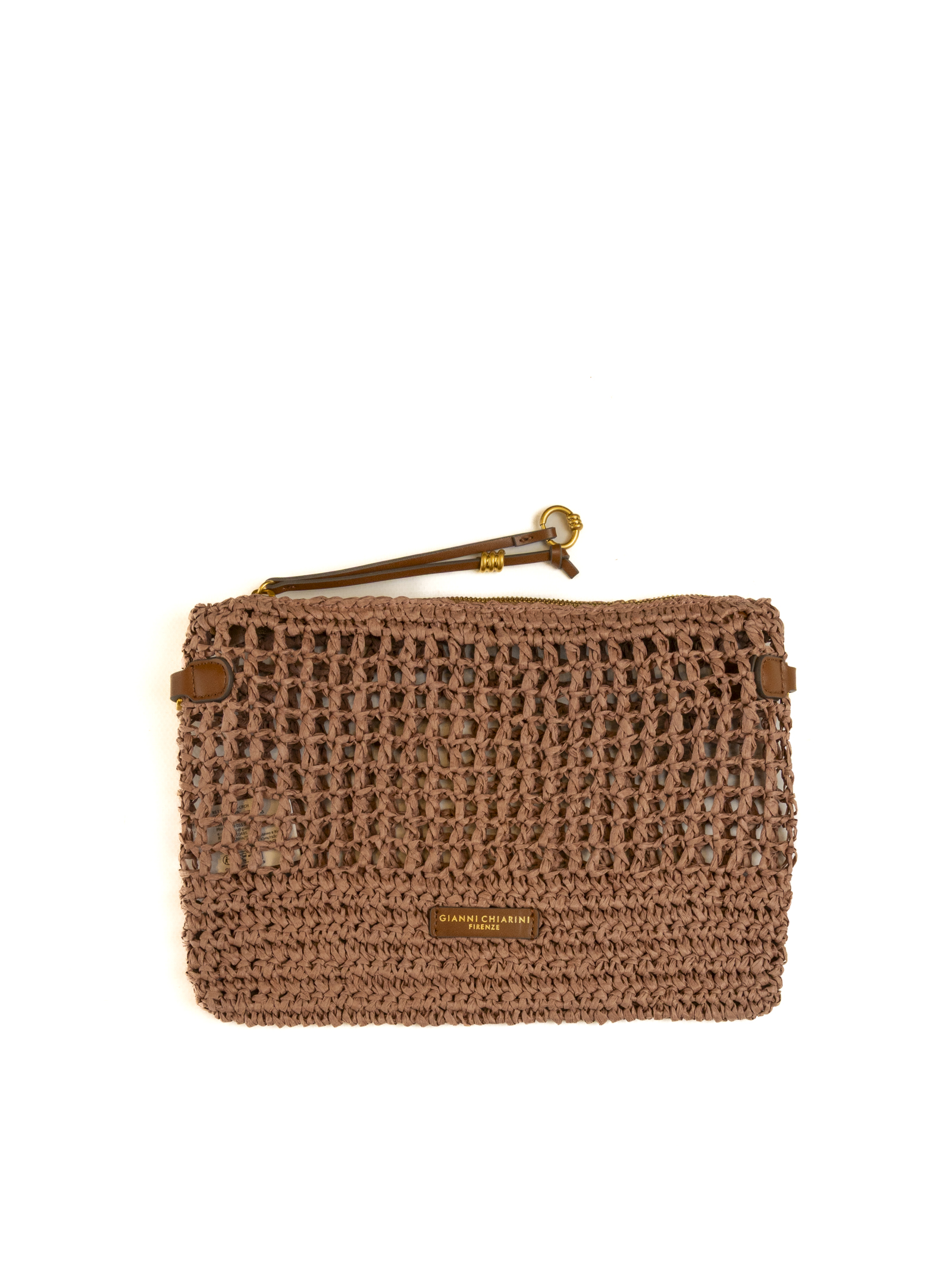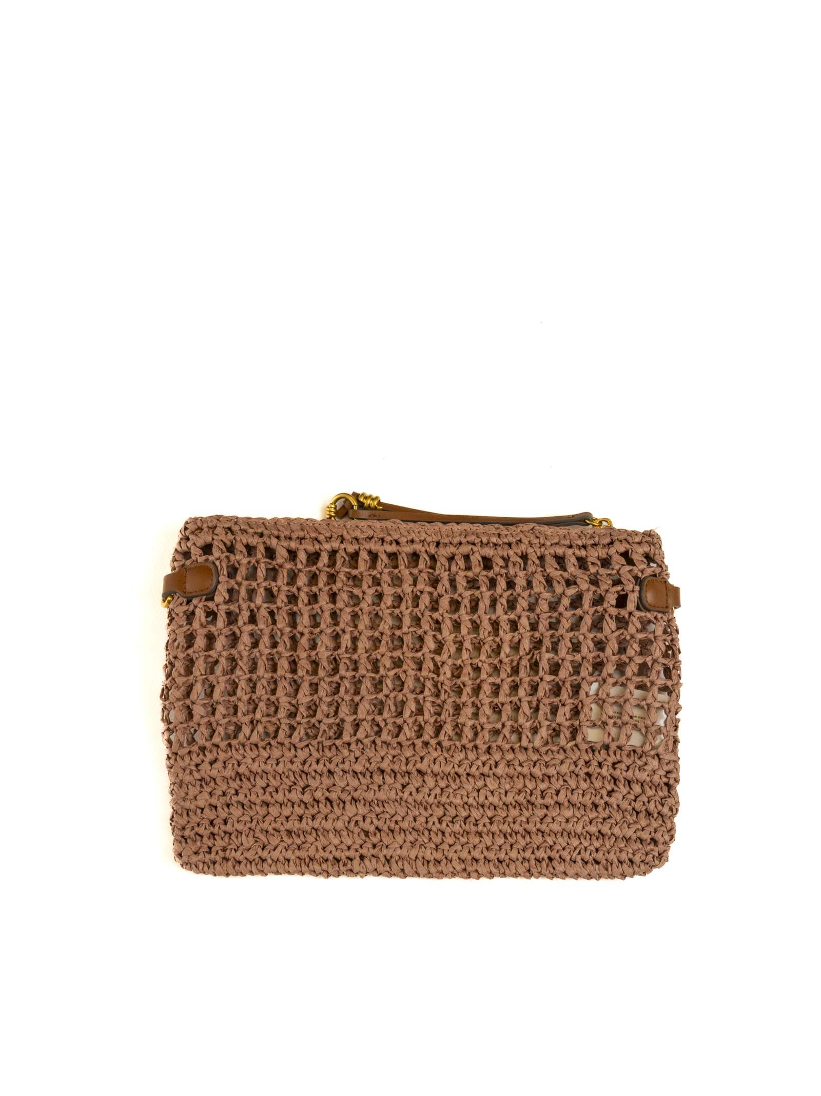 The slim, rectangular silhouette is embellished with a dense crochet weave that creates a captivating interplay of textures and transparencies. The design is balanced by tan leather details, including the front logo patch and refined side supports, which, combined with gold-tone metallic finishes, lend the piece a sophisticated allure.