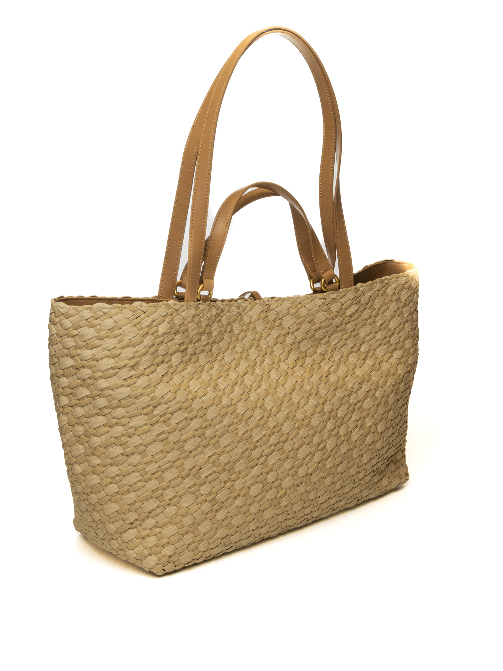 The wide, structured trapezoid silhouette offers unparalleled practicality, ideal for days in the city or vacations. The warmth of the natural texture is elegantly balanced by the double tan leather handles, designed for maximum comfort whether carried by hand or over the shoulder. Gold-tone metal details and a thin leather drawstring closure add a touch of sparkle and a secure feel to the design.