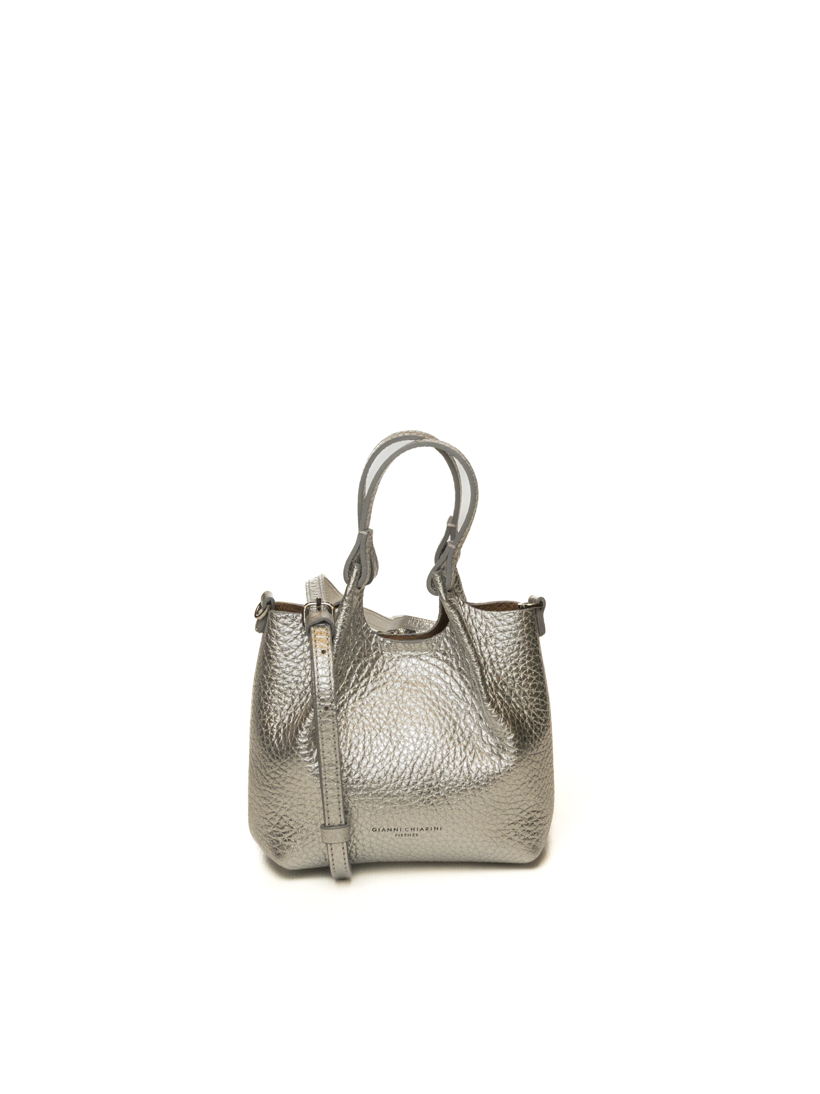 The brand's icon, the Dua bag by Gianni Chiarini Firenze, is presented here in an eye-catching silver leather version (City Noir/Castoro or Silver) with a maxi-grain hammered finish. This accessory stands out for its simple yet profoundly contemporary design, ideal for adding a touch of sophisticated sparkle to both everyday looks and more sophisticated outfits.