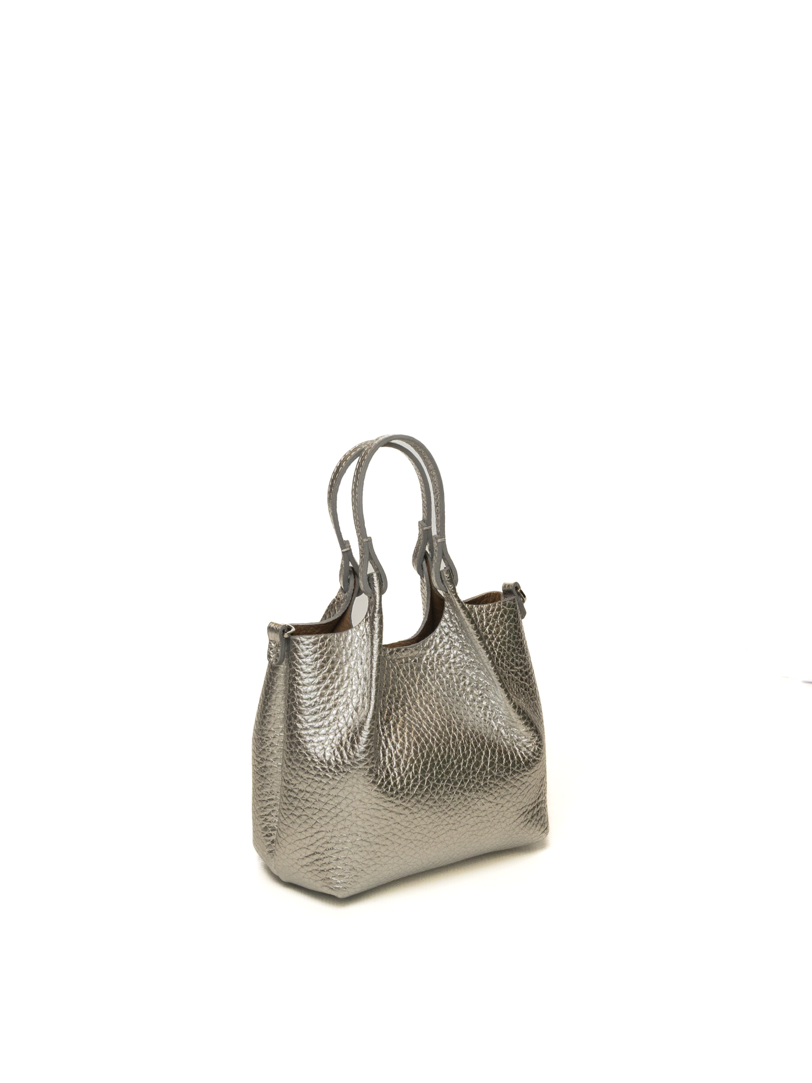 The bag features a single, unlined compartment that enhances its lightness and softness. Featuring hammered leather trim and matching double handles, it offers three carry options: it can be elegantly carried by hand, over the shoulder, or crossbody, thanks to the adjustable and removable shoulder strap included.