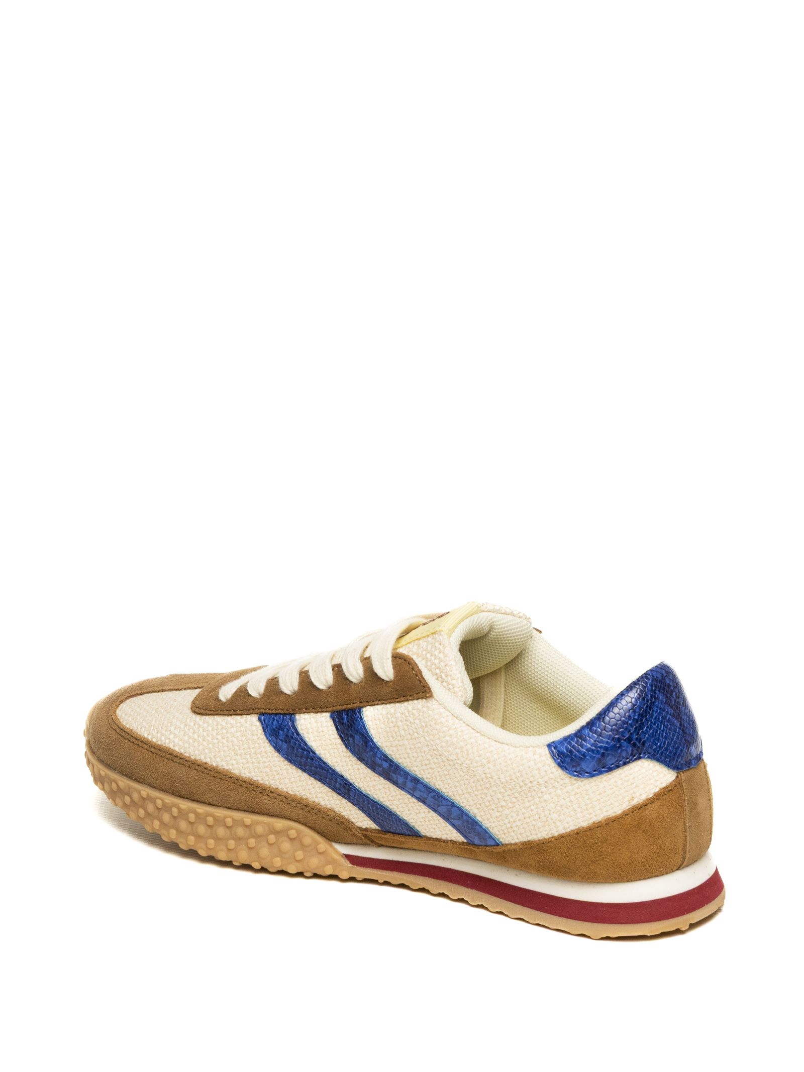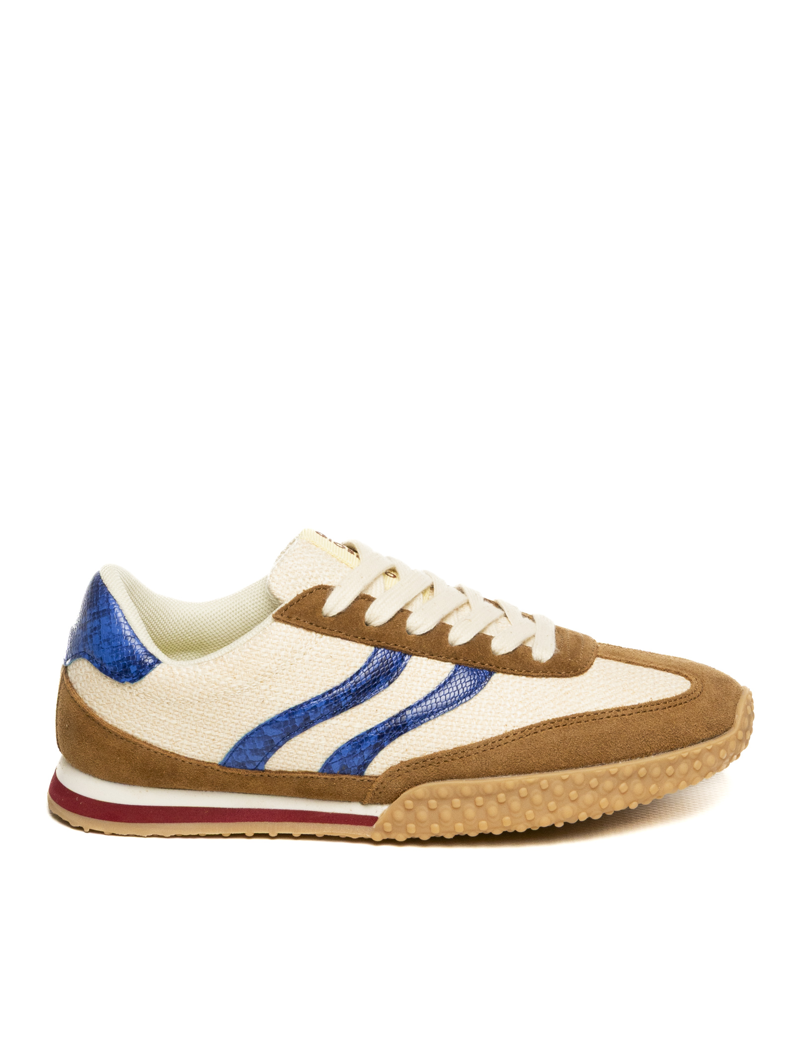 The upper is crafted from a premium material blend: a breathable technical fabric base in cream is enriched with brown suede leather inserts on the toe and profiles. The design is made unique by the iconic lateral stripes and heel tab in blue laminated leather with an animalier effect, giving the shoe a glamorous and eclectic touch. The flat cotton lace closure ensures a precise and comfortable fit.