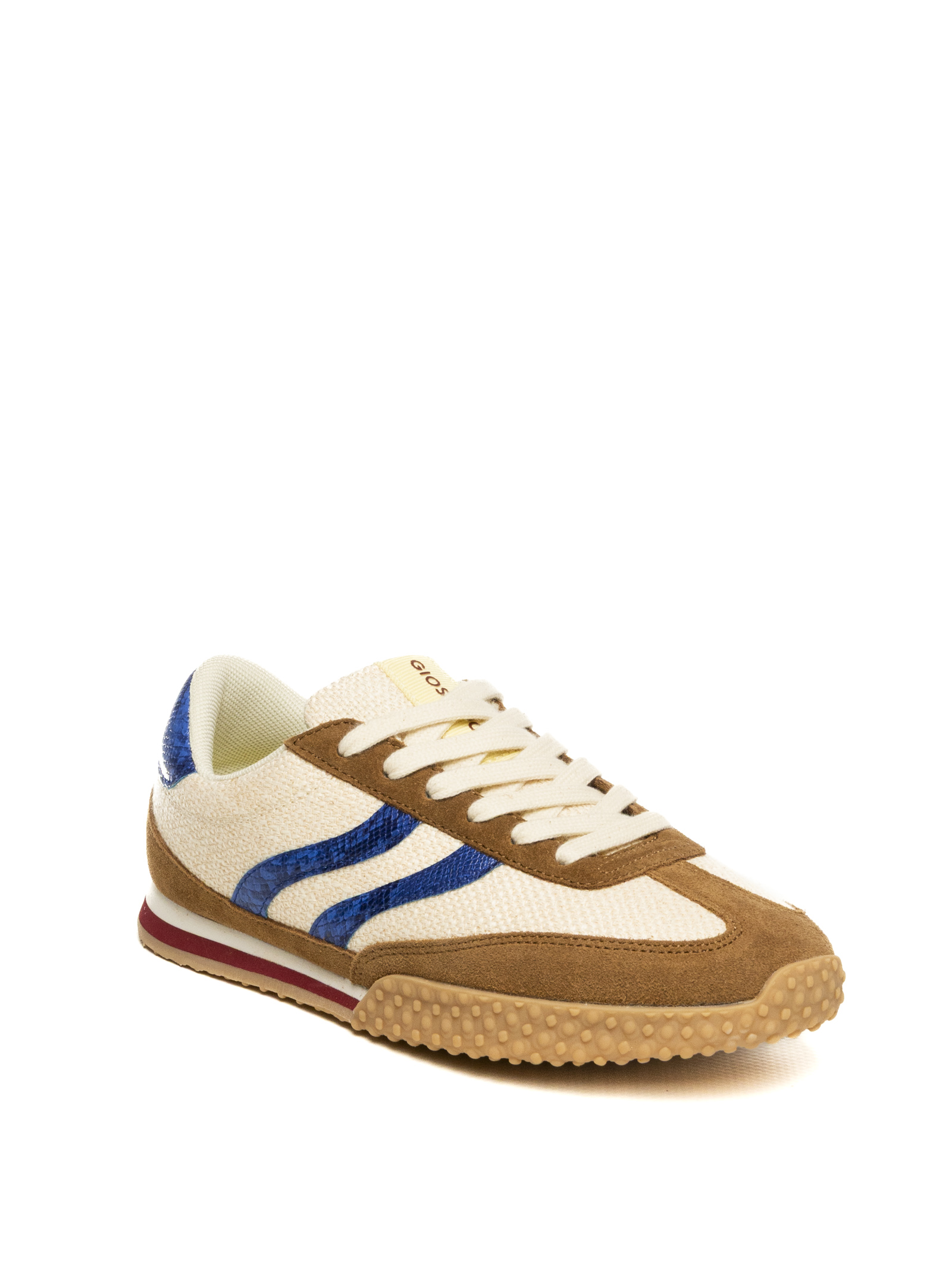 Gioseppo women's sneaker, Blomkest model in Beige colorway, a retro-running inspired footwear piece that reinterprets 1970s style with a high-personality mix of materials and colors.