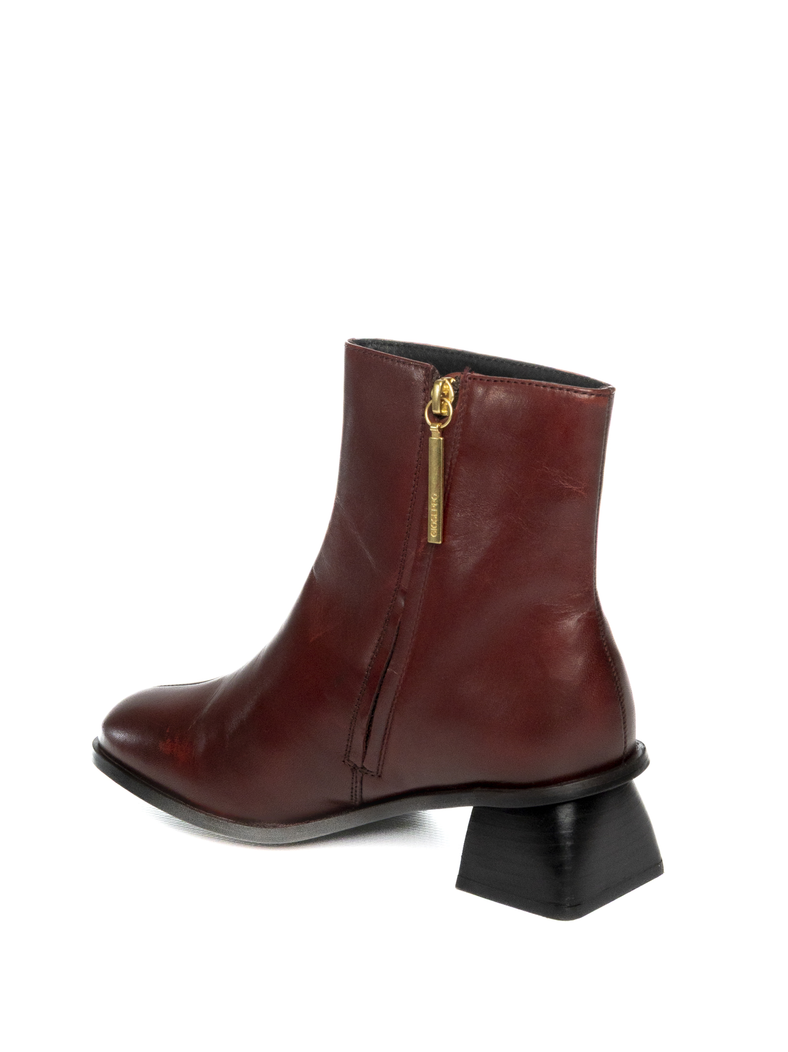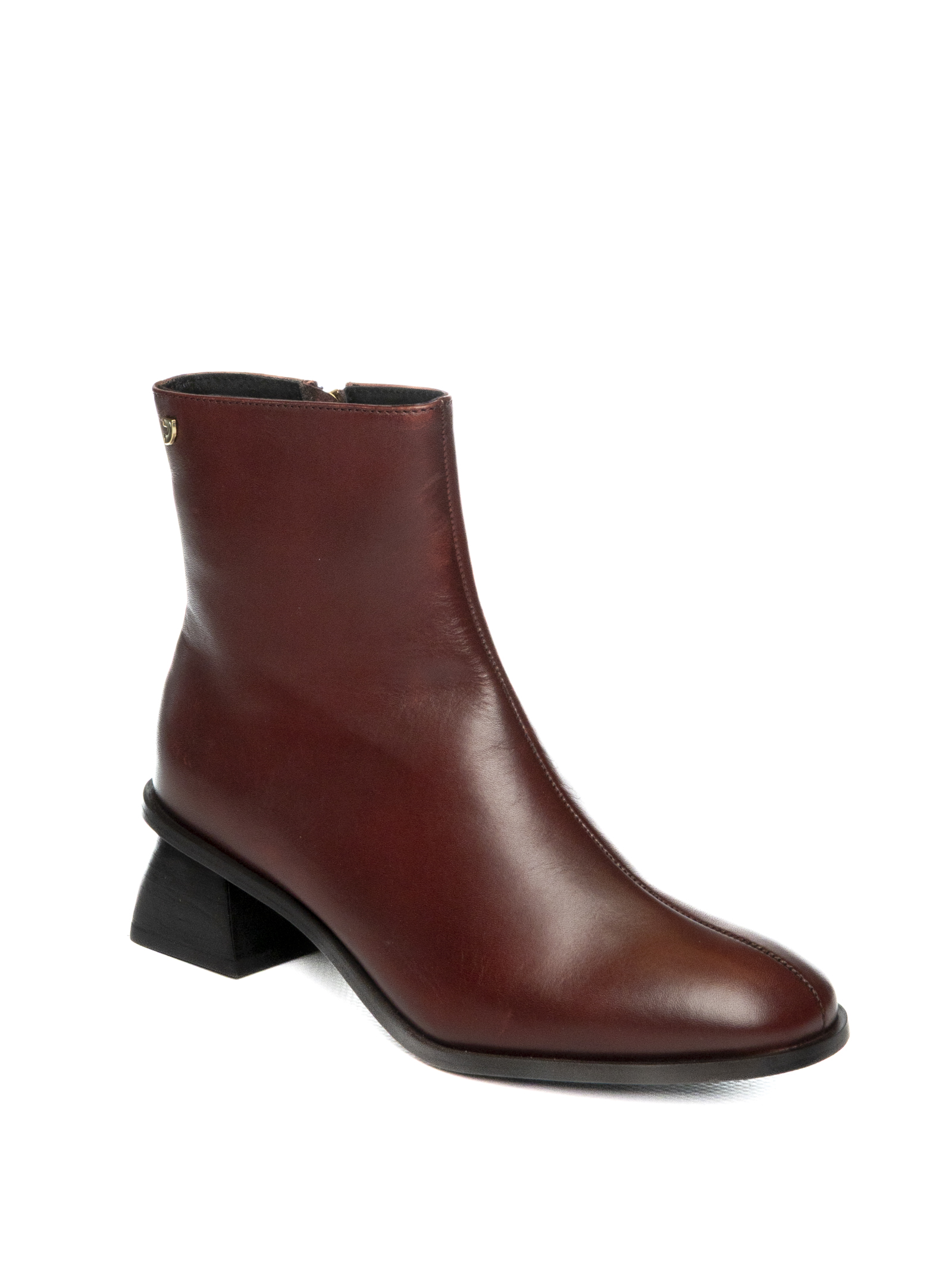 Leather ankle boot. Internal zip closure. Metal logo on the side. Leather and Lycra lining. Padded insole. Round toe. 15cm shaft height. Wide heel. 45mm heel height. Made in Spain