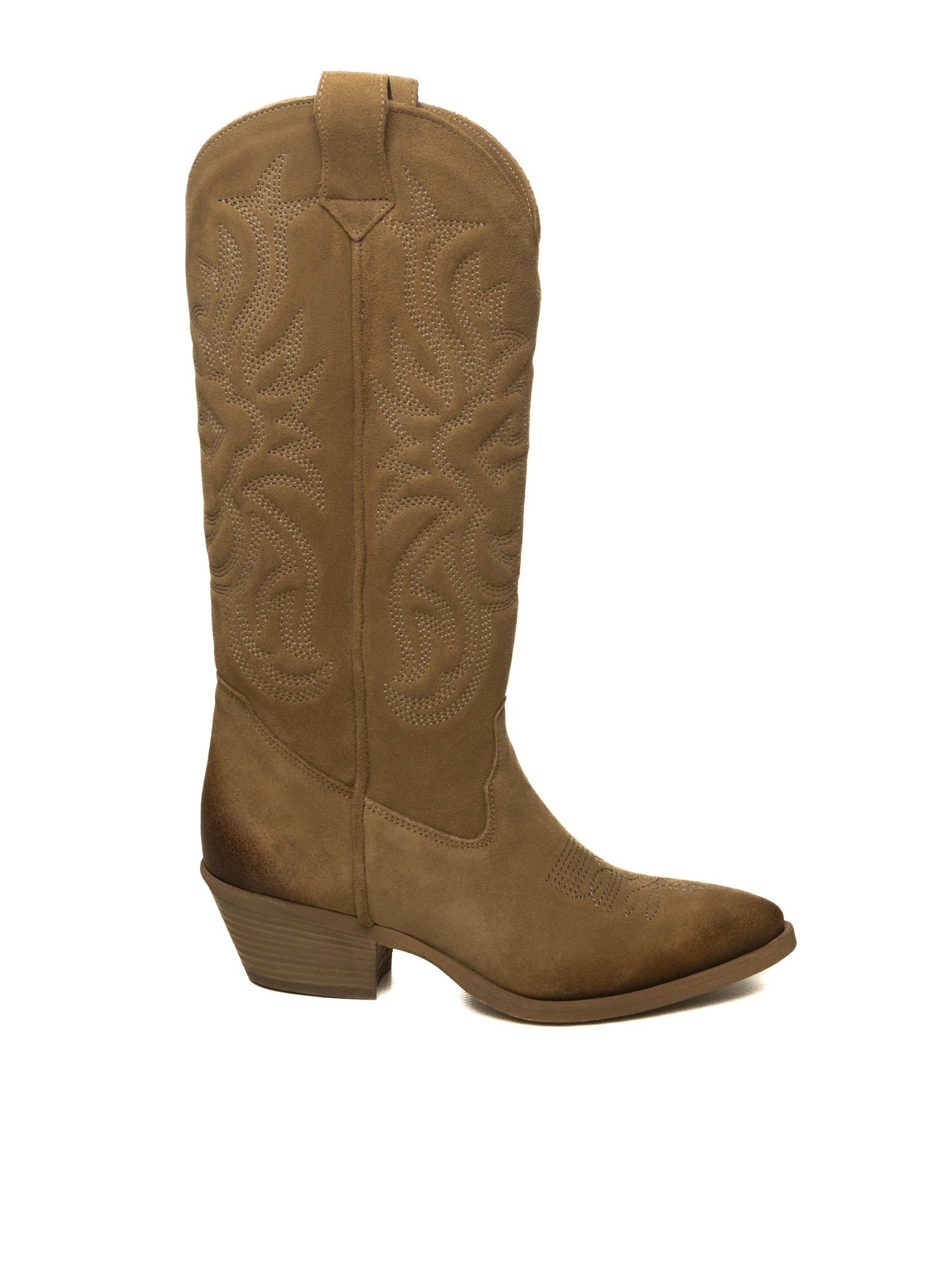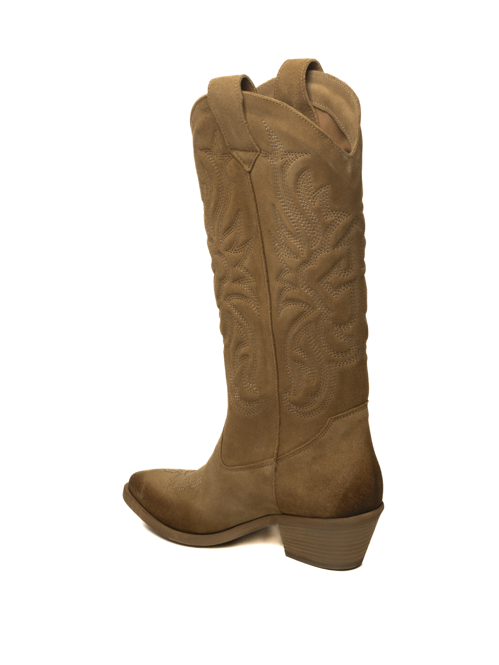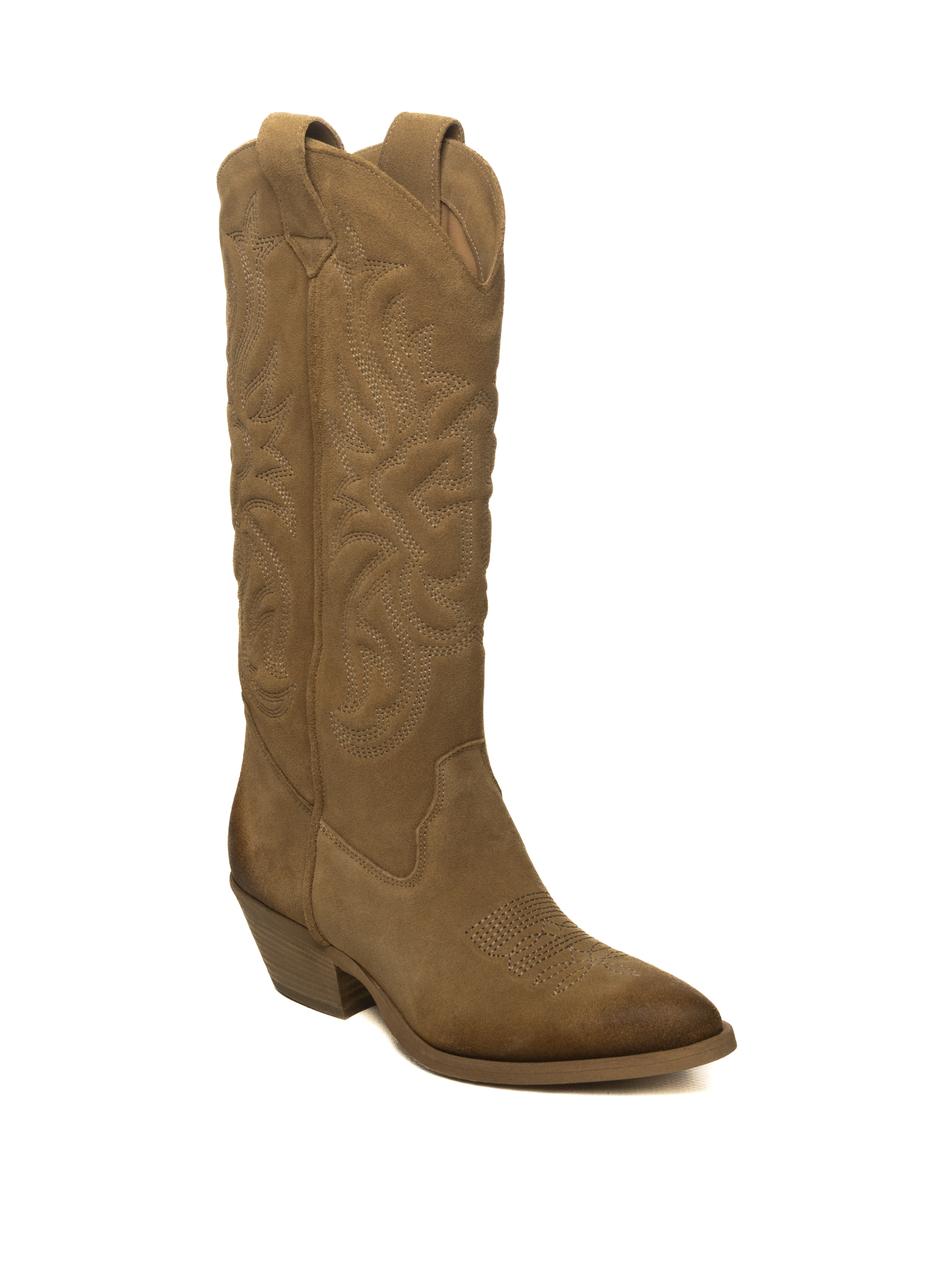 The pointed toe and angled western heel enhance its shape, while the leather sole with anti-slip inserts ensures comfort and stability.