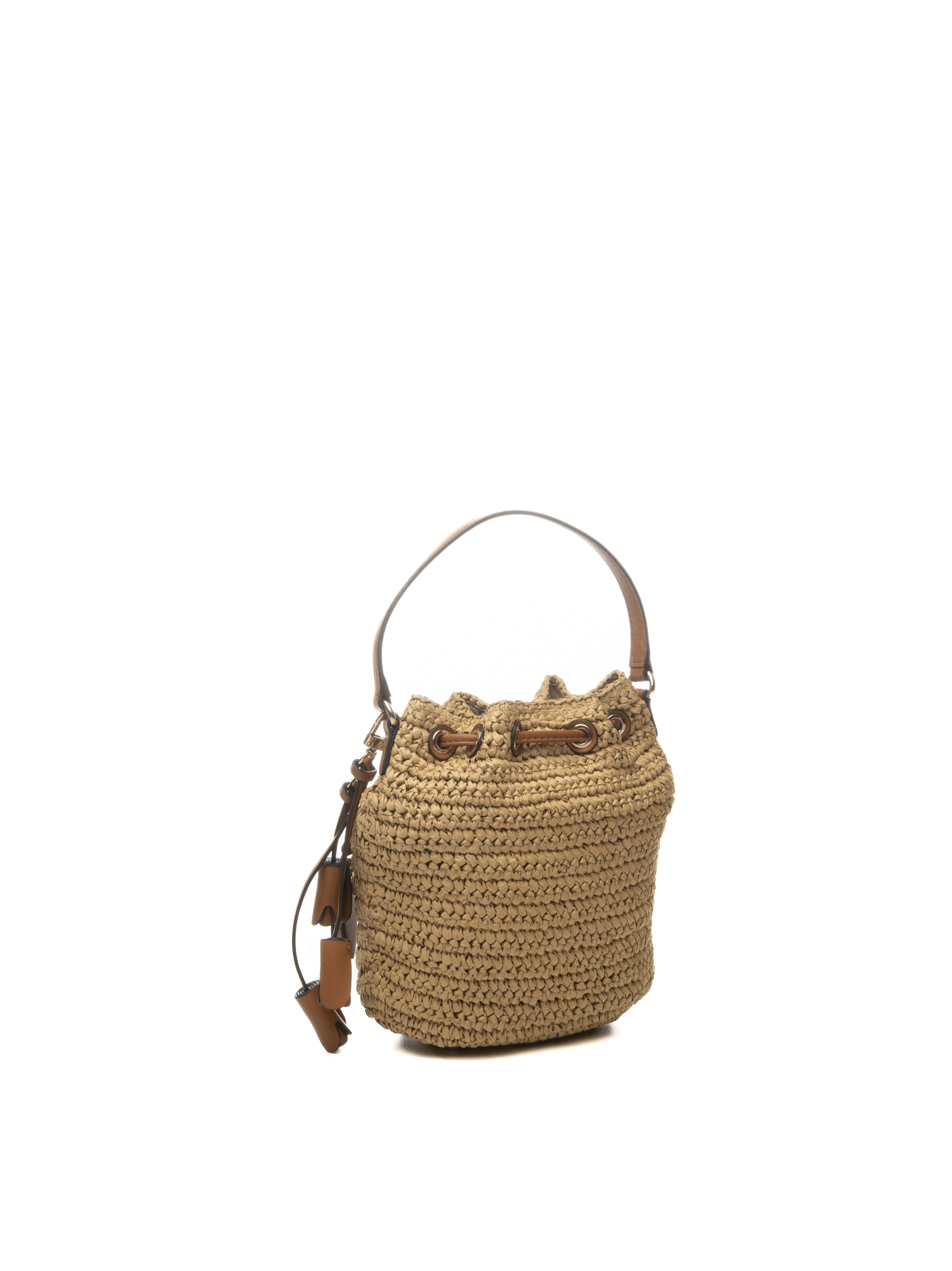 Crafted from woven raffia-effect fabric (100% raffia or textured paper) in Natural/Cognac, the bag features a soft yet defined bucket structure. The design features the iconic metallic triangular logo on the front and a drawstring closure with brown leather laces.