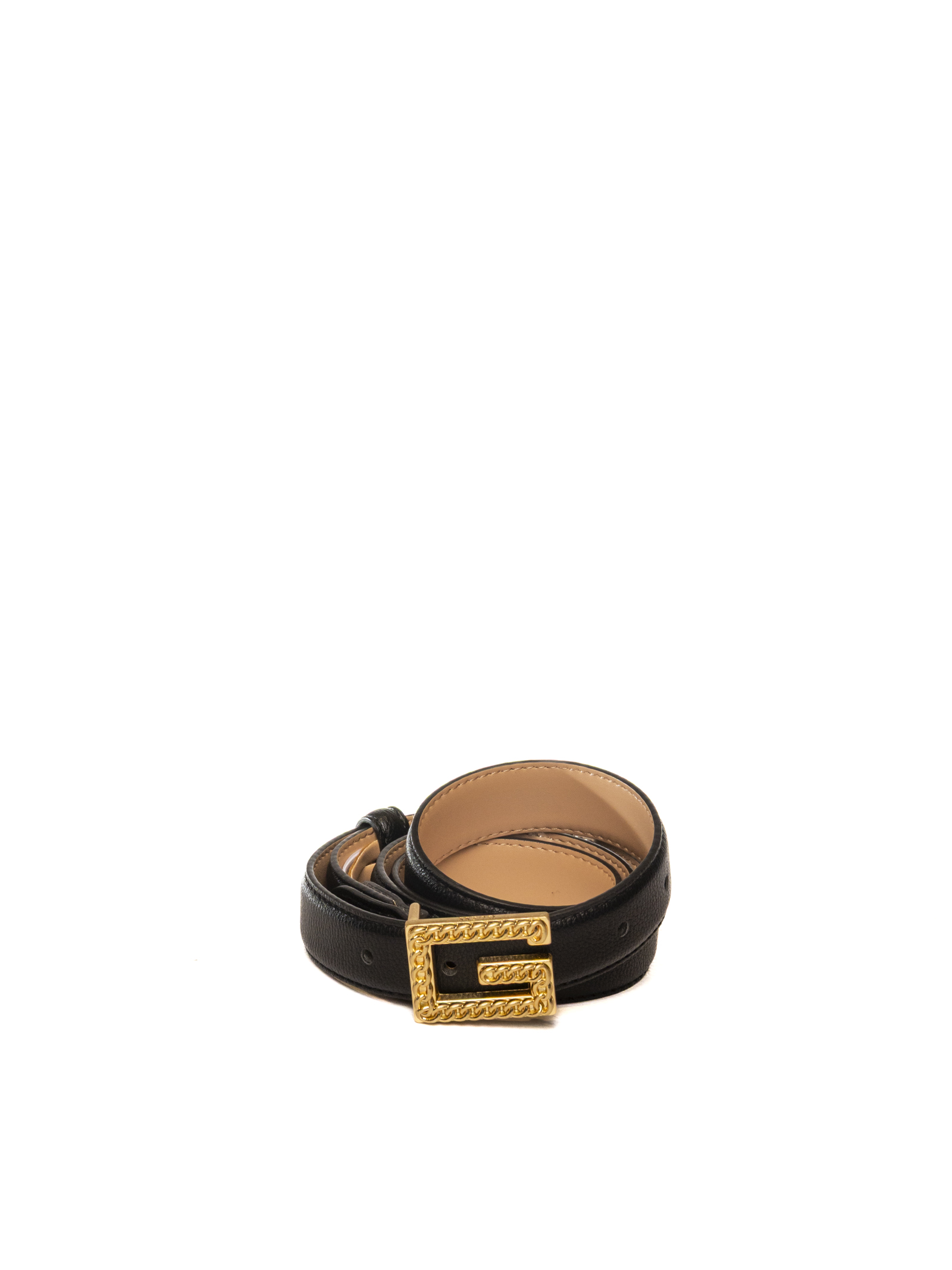 Crafted from smooth black faux leather, it features a gold-tone metal buckle in the shape of the letter "G" embellished with an elegant chain decoration, a symbol of the brand's glamorous style.