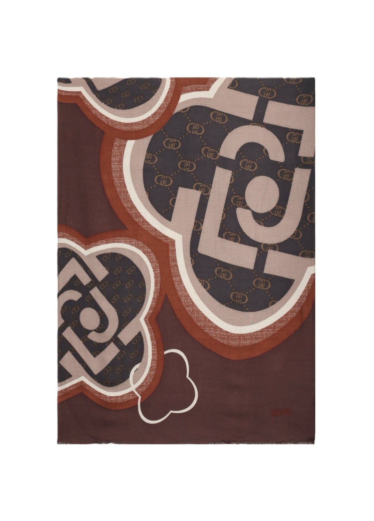 An elegant and contemporary scarf, characterized by a refined interplay of soft shapes and interwoven geometric patterns. The warm brown base provides the backdrop for a maxi pattern that combines shades of hazelnut, beige, and brown, creating a bold yet harmonious design.