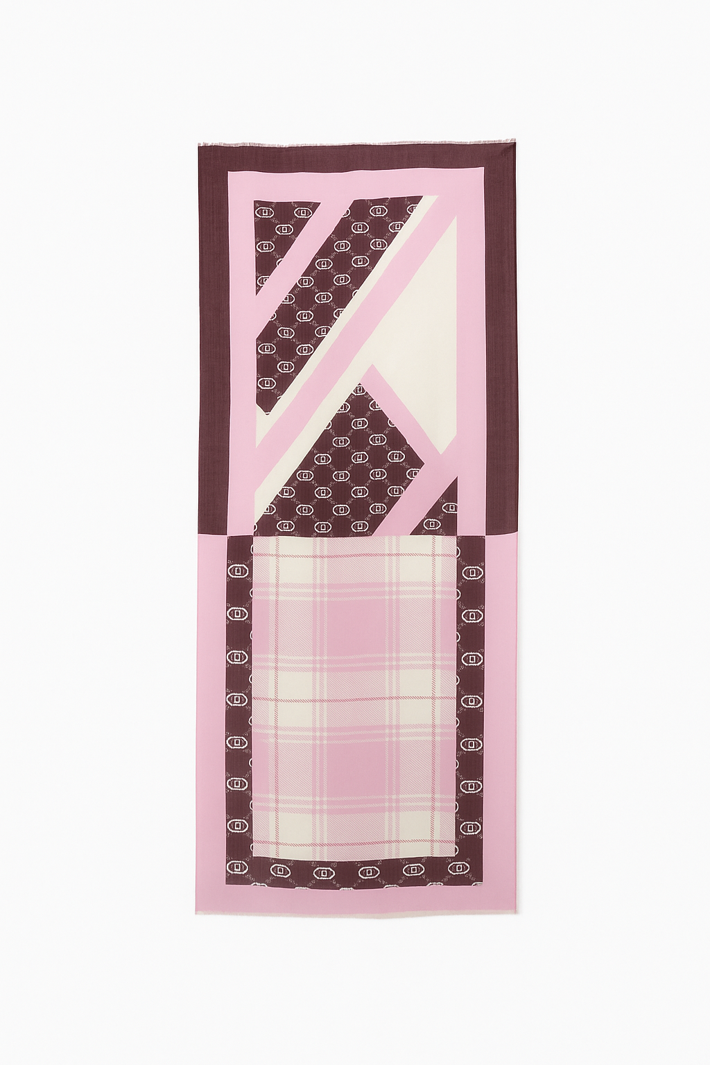 This scarf combines elegance and originality thanks to a refined mix of geometric patterns, monogram inserts, and checked details.