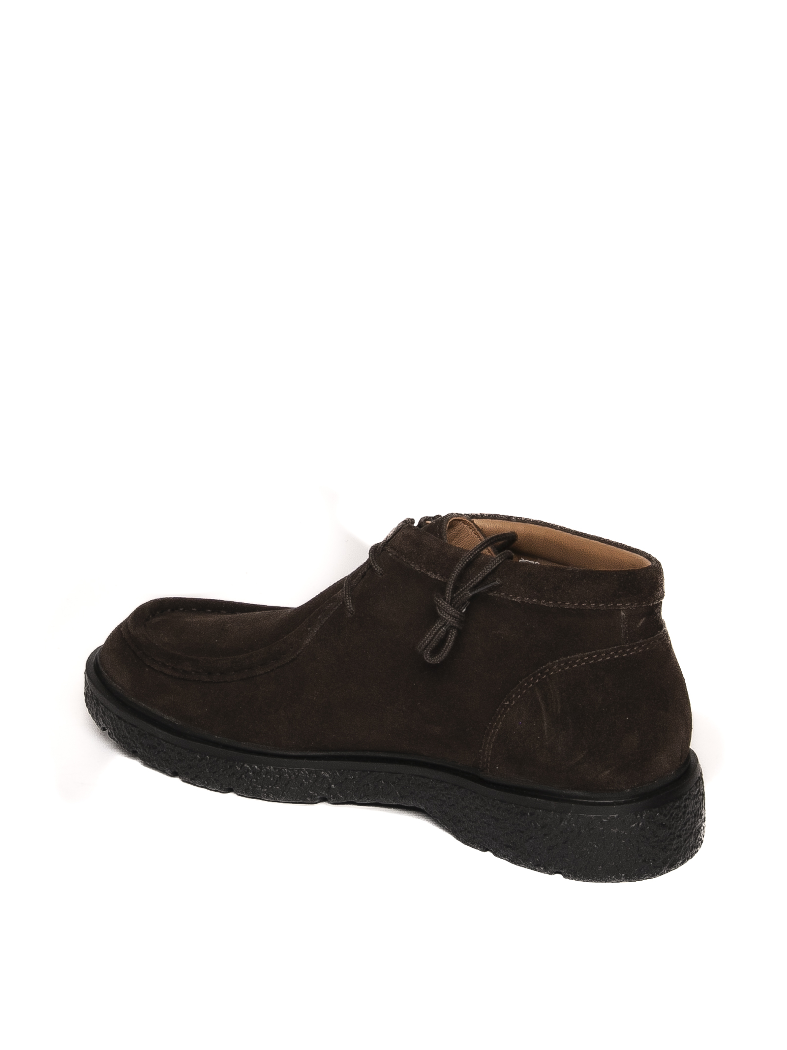 Suede ankle boot. Lace-up closure. Visible stitching. Side logo. Rubber sole. Removable insole.