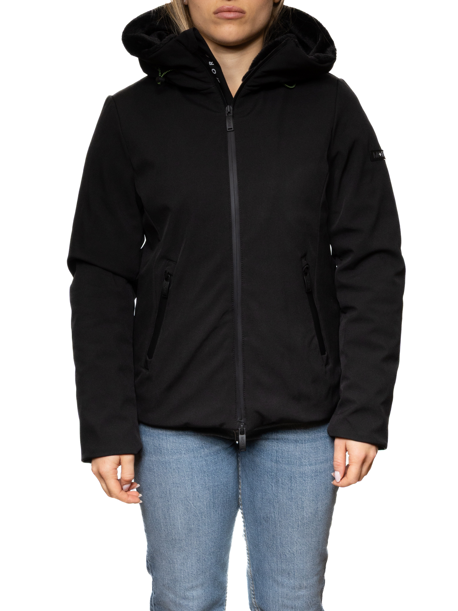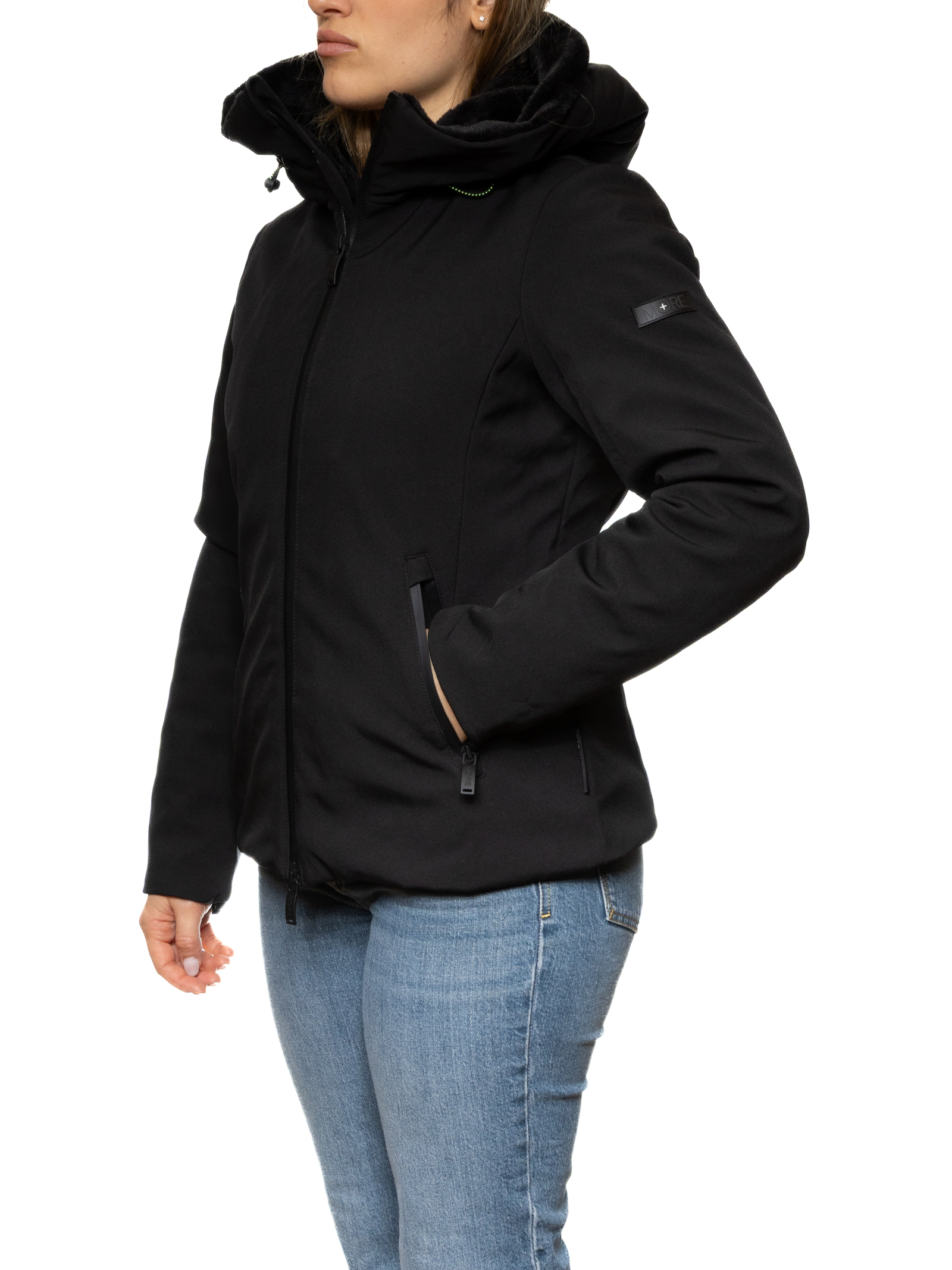 The MORE women's down jacket in black combines contemporary style and functionality in a simple and sophisticated piece.