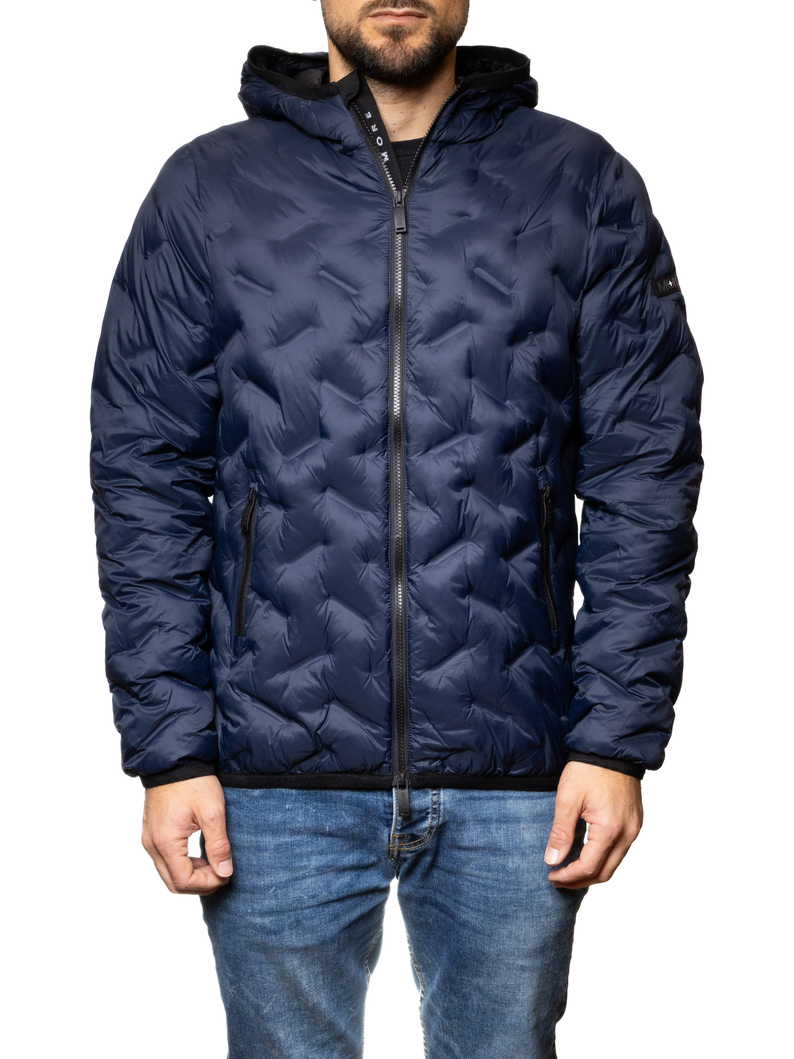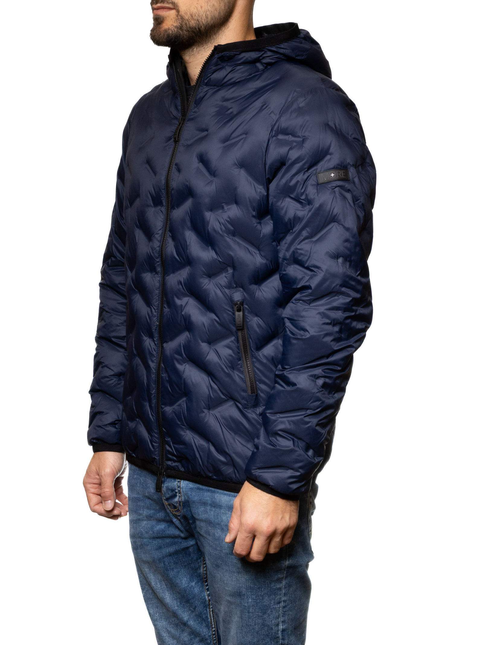 The MORE men's down jacket in blue offers a contemporary and versatile look, perfect for facing the winter season in style.