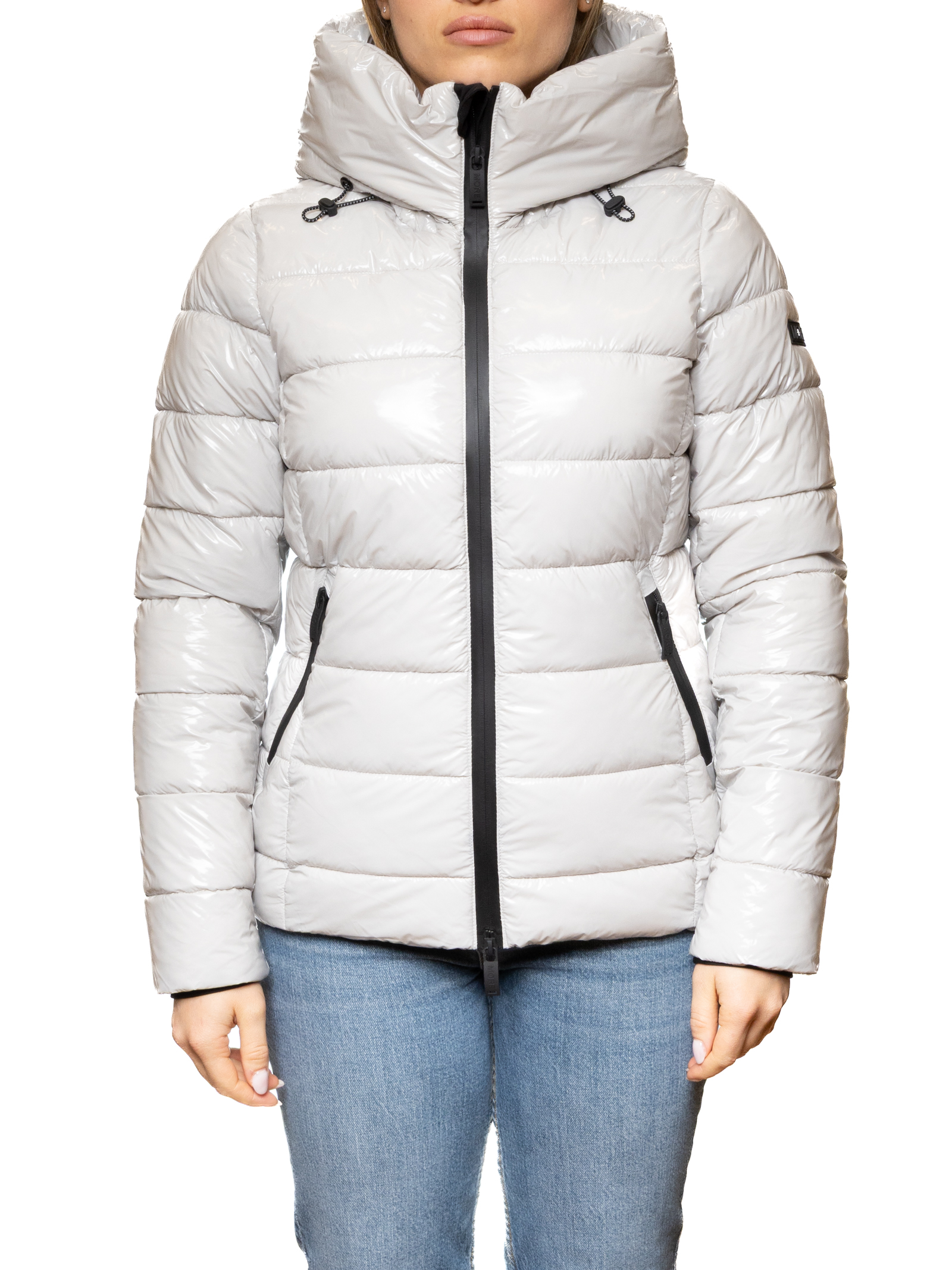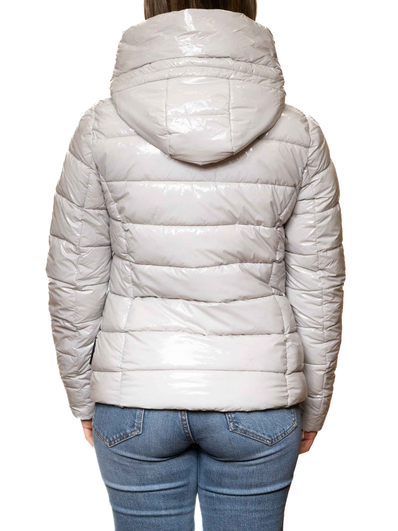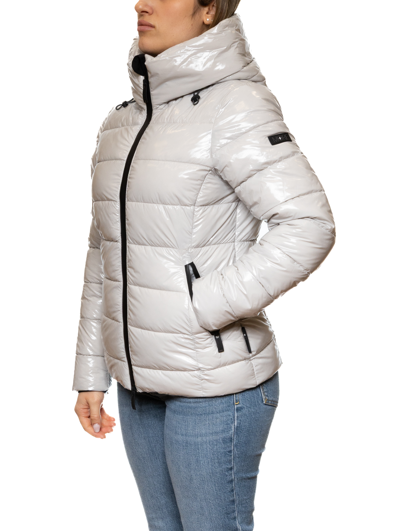 The MORE women's down jacket in pearl gray combines modernity and functionality in a clean, contemporary design.