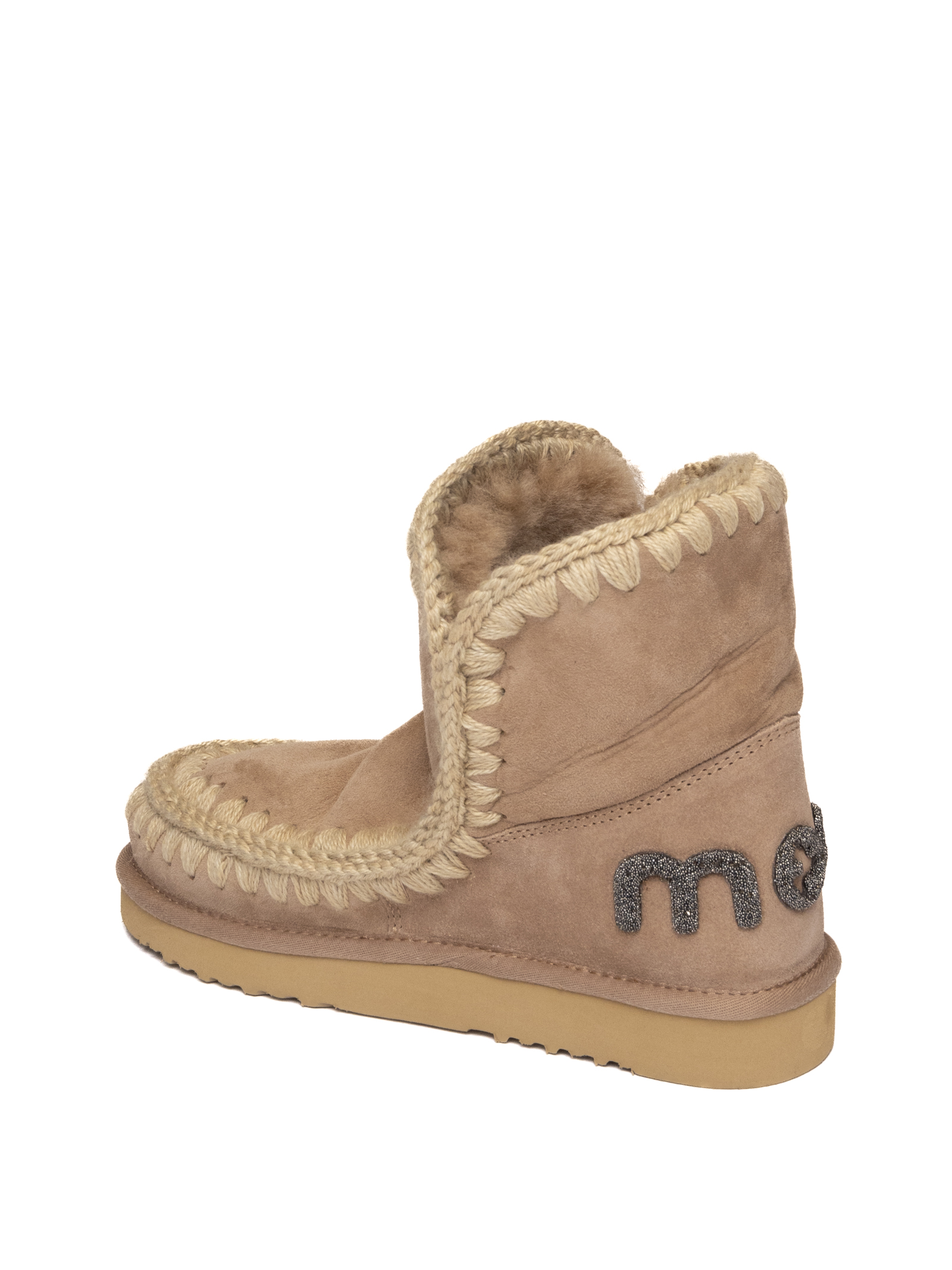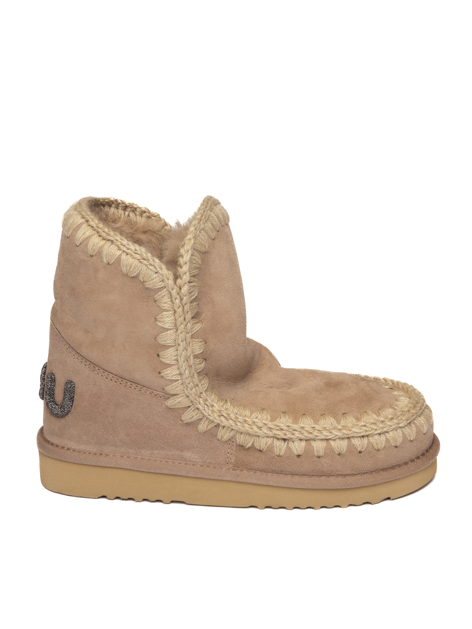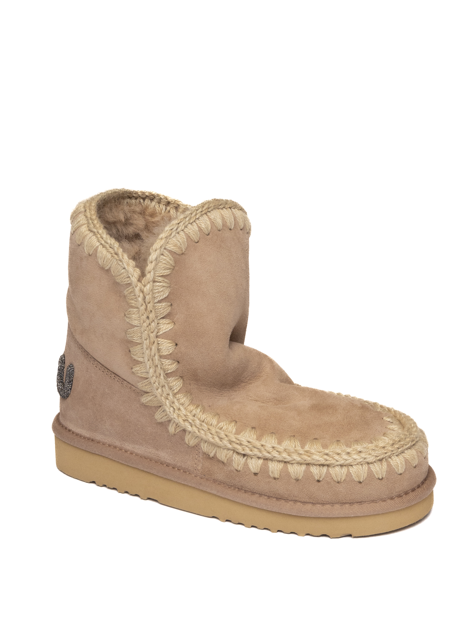 Ankle boot made of real sheepskin. Crochet wool stitching detail. Lettering logo in glitter. Reinforced heel with logo. EVA and rubber bottom. 18cm high leg. Clean with a soft, dry cloth.