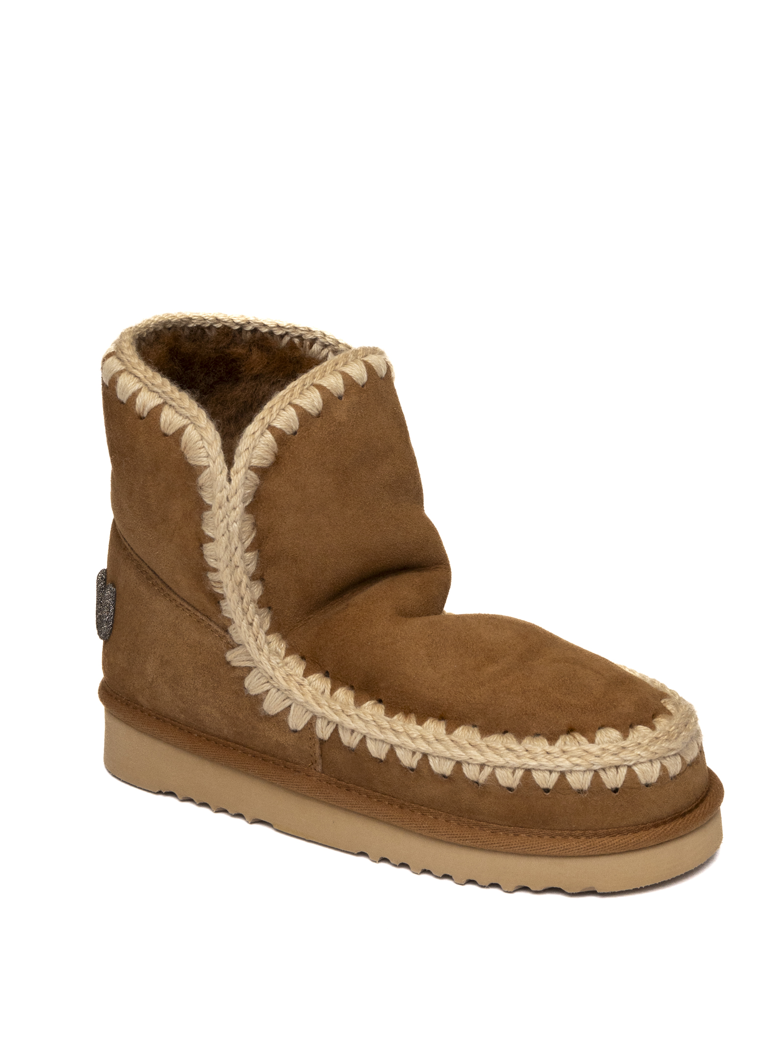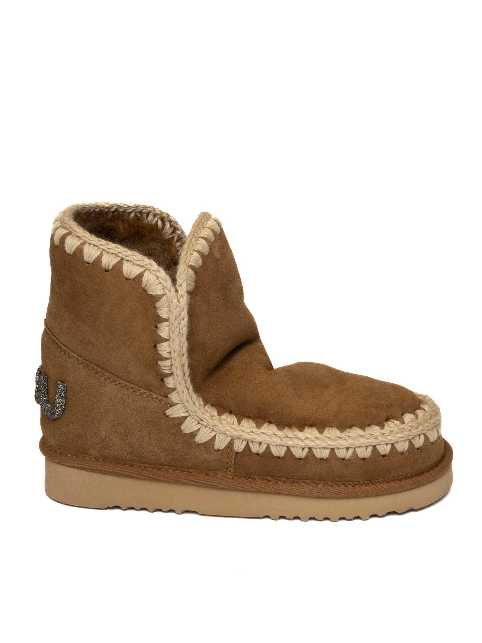 Ankle boot made of real sheepskin. Crochet wool stitching detail. Lettering logo in glitter. Reinforced heel with logo. EVA and rubber bottom. 18cm high leg. Clean with a soft, dry cloth.