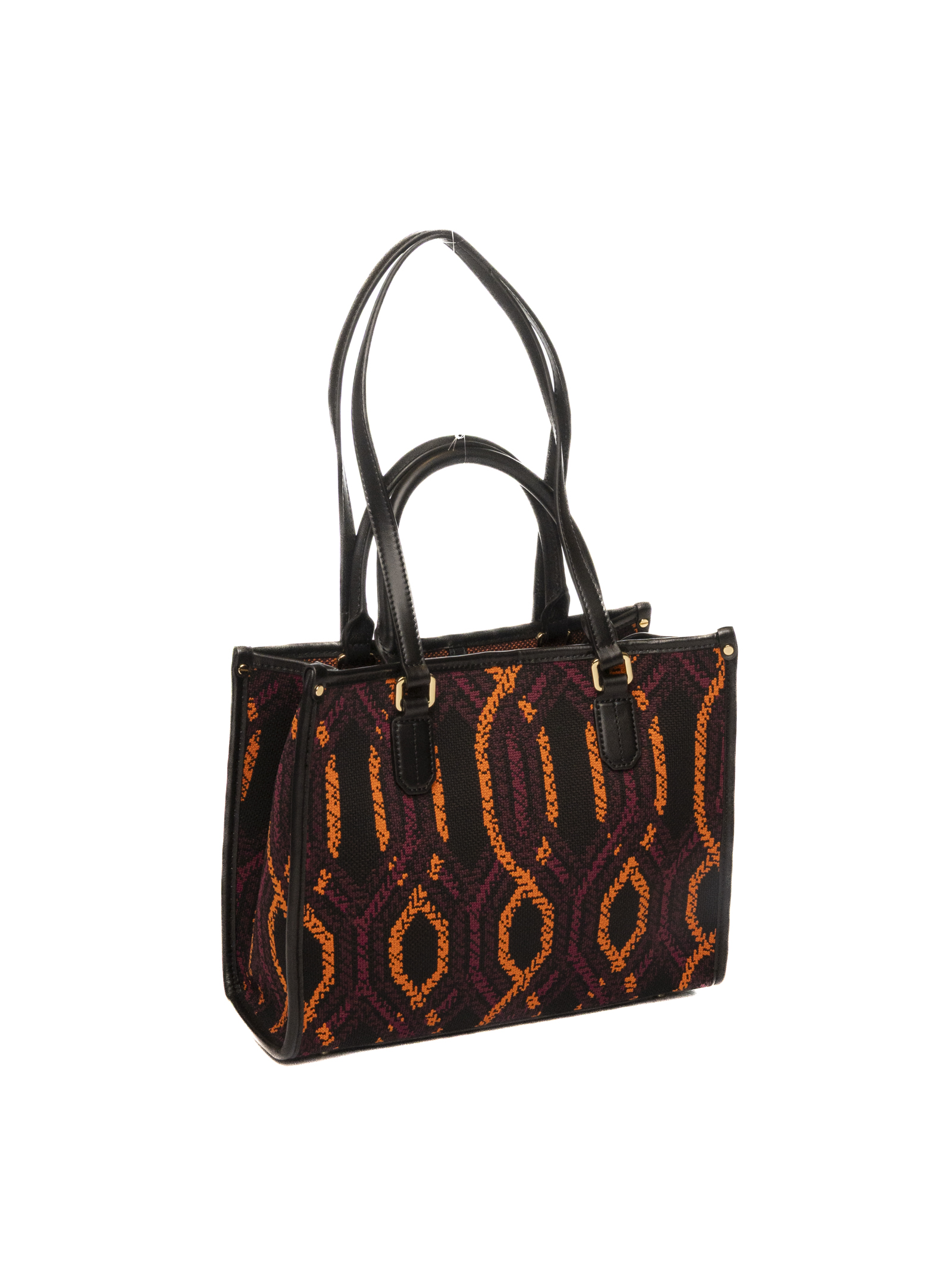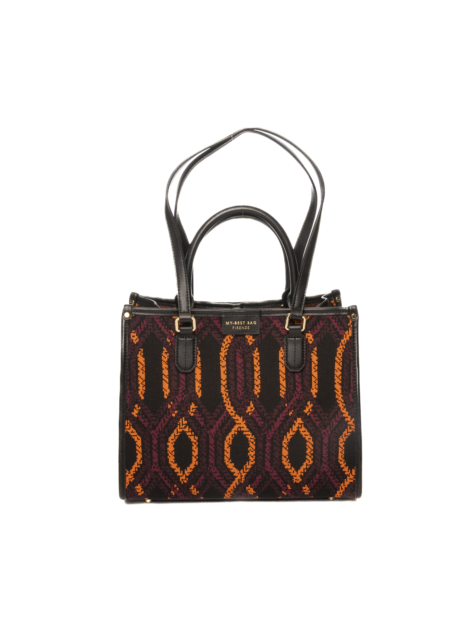 The My-Best Bag tote bag in jacquard fabric with an orange and burgundy geometric pattern is the perfect accessory for those who love to stand out with style and personality.