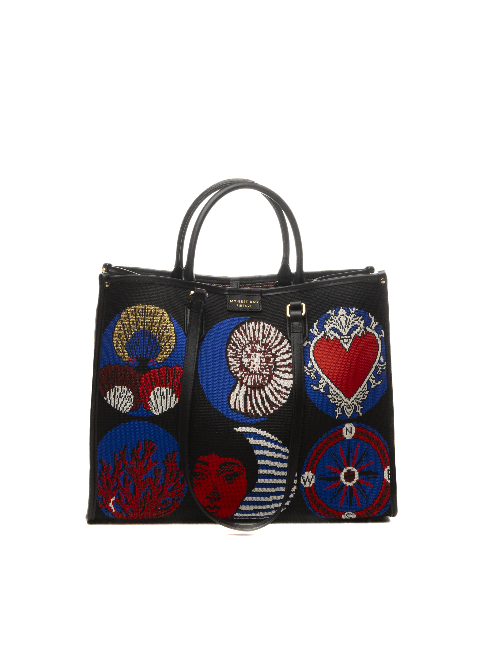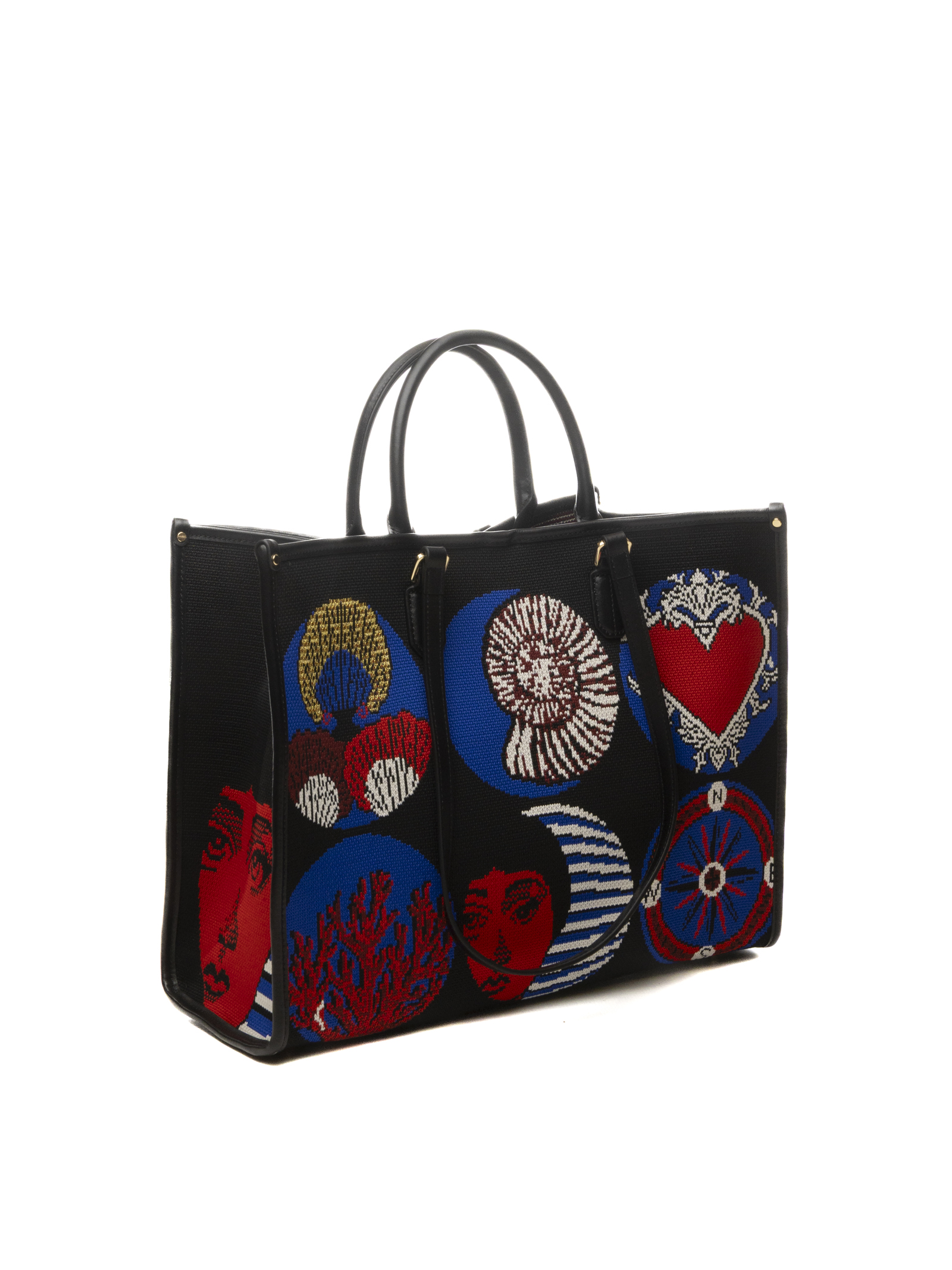 Crafted from a sophisticated blend of textured fabric and premium leather, this version of the Atena line stands out for its circular square pattern enclosing iconic marine symbols. The design features vibrant graphics in shades of red, blue, and white against a black background: a shell, coral, a compass, a female lunar face, and a Sacred Heart stand out, creating a "microcosm" of meanings and colors.