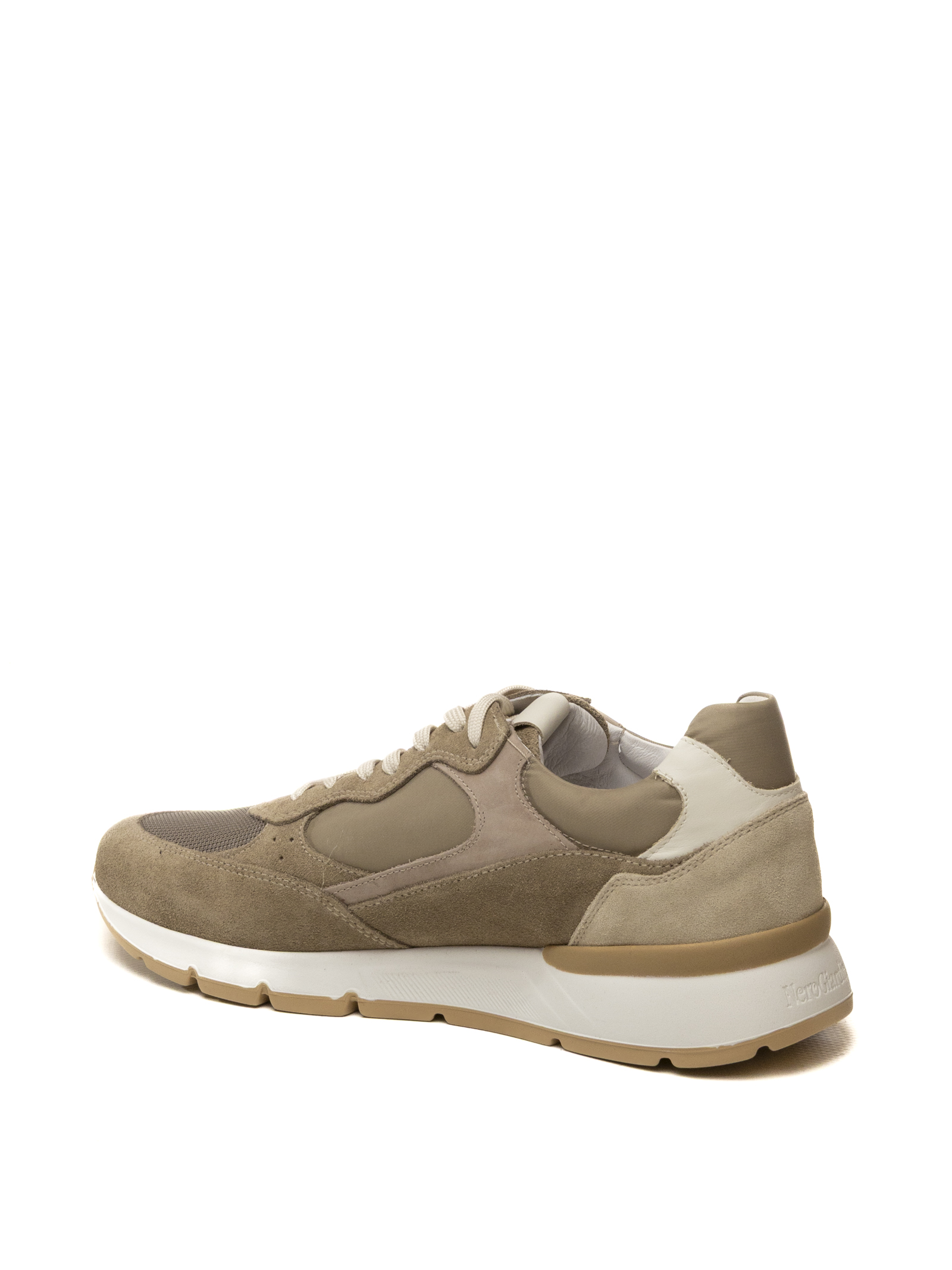 The upper is crafted from a premium mix of materials: a breathable technical fabric base blends with premium suede leather and smooth leather inserts in various shades of beige and mud green. The silhouette is inspired by classic running styles, reinterpreted with a paneled construction that provides structure and a sophisticated urban aesthetic. The contrasting heel details and the lateral metal logo insert highlight the artisanal care and attention to detail typical of the brand.