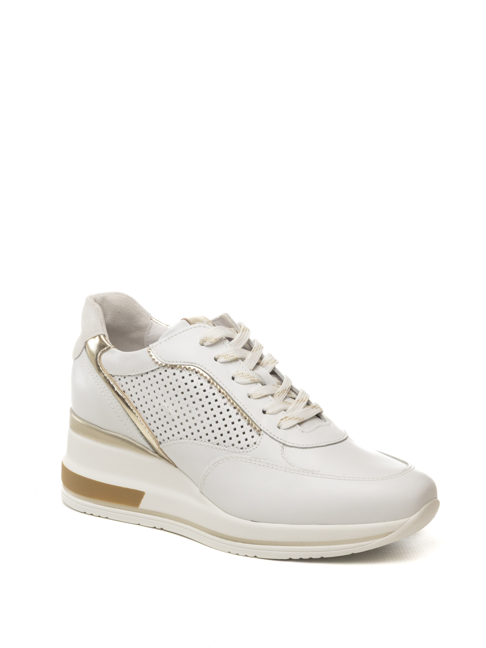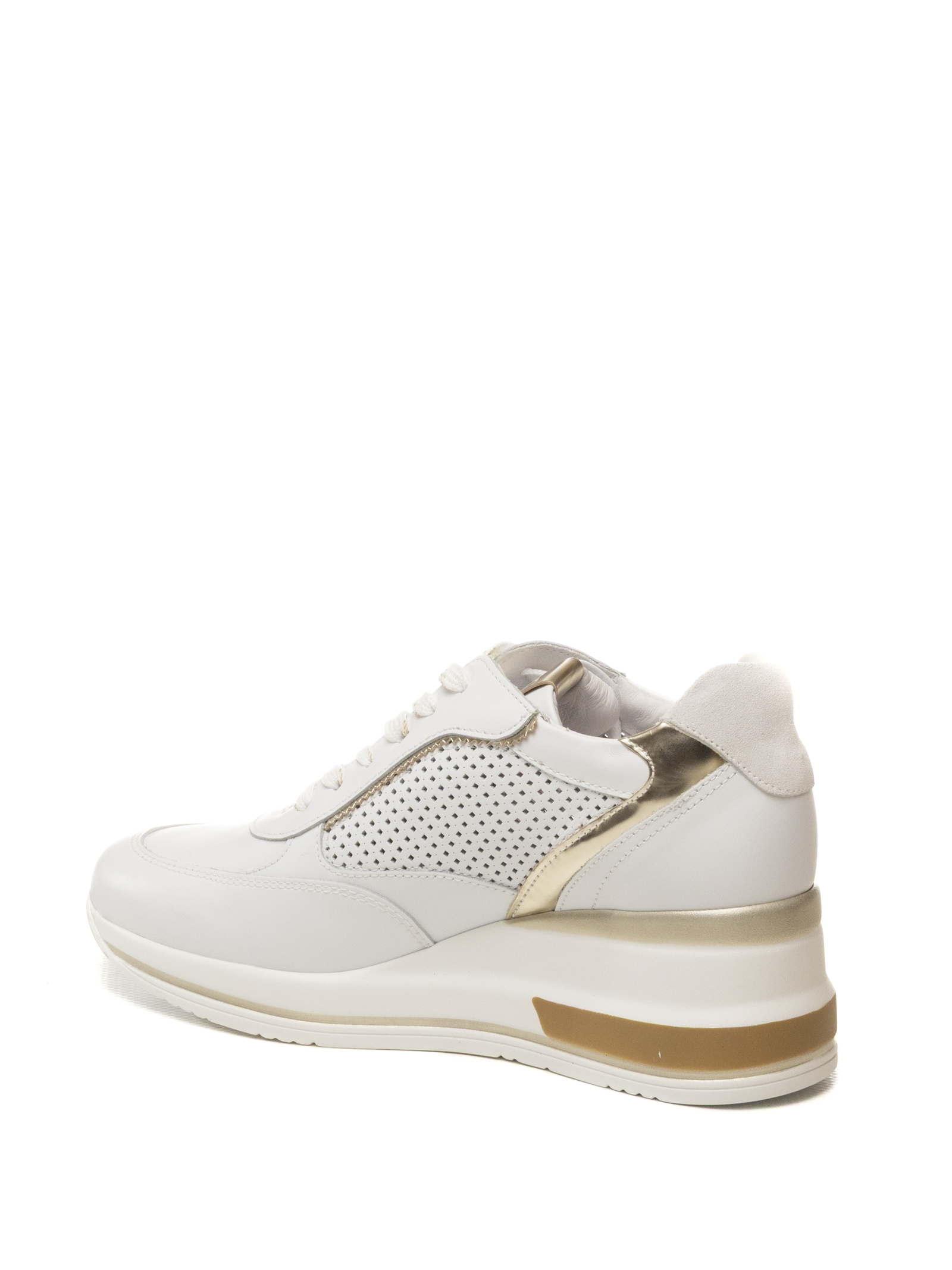 The upper is crafted from premium genuine leather in white, featuring a refined combination of textures: smooth panels alternate with micro-perforated lateral areas that ensure excellent breathability. The design is enhanced by elegant gold-laminated inserts outlining the silhouette and heel, providing a touch of light and modernity. The practical external side zipper allows for an easy fit, making the shoe functional as well as stylistically refined.