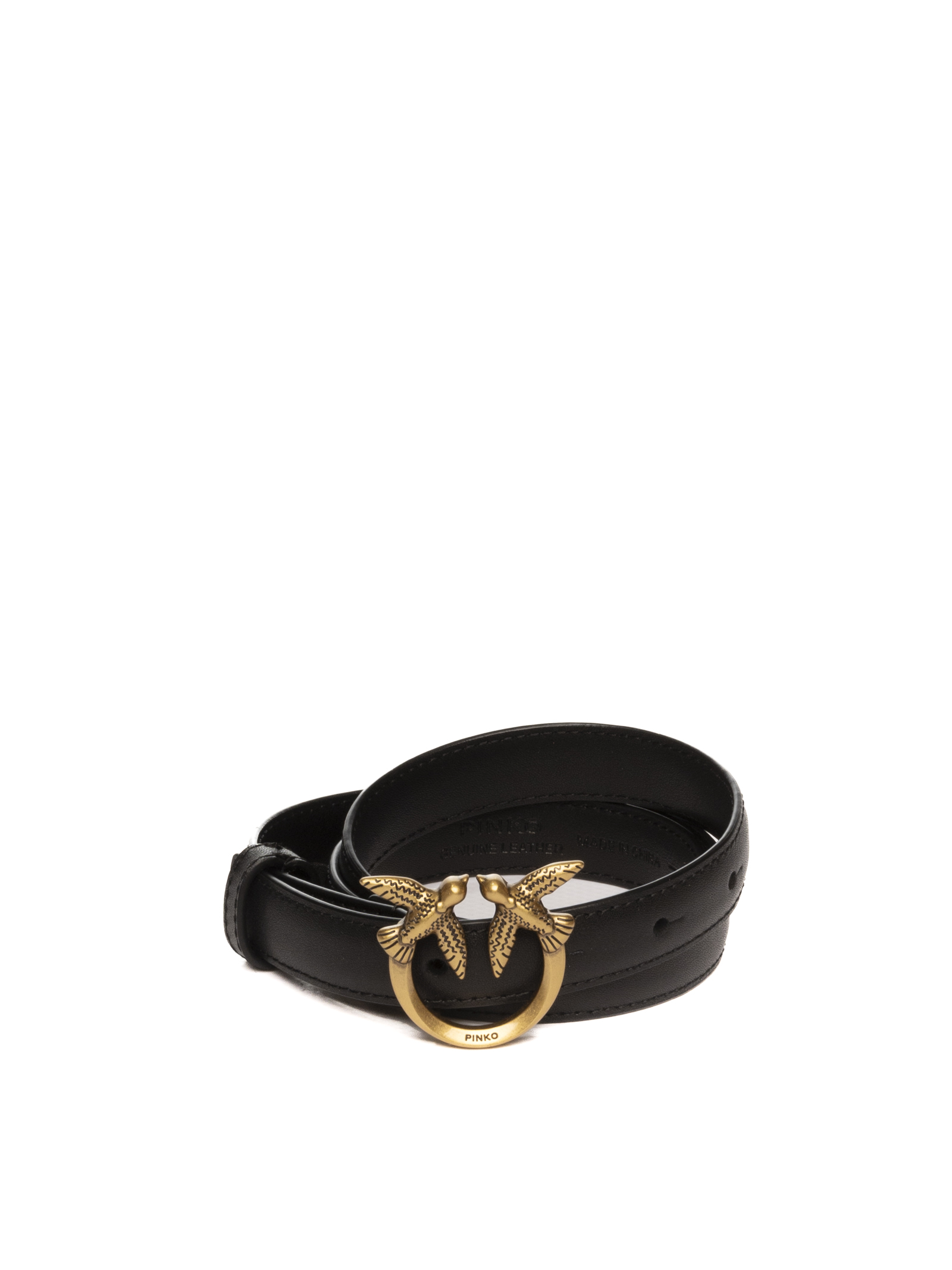 The focal point of the piece is the unmistakable circular metal buckle, embellished with the Love Birds Diamond Cut emblem in an Antique Gold finish. This jeweled detail, positioned on the front, embodies the distinctive Pinko identity, making it a versatile piece capable of elevating both casual and more formal outfits.