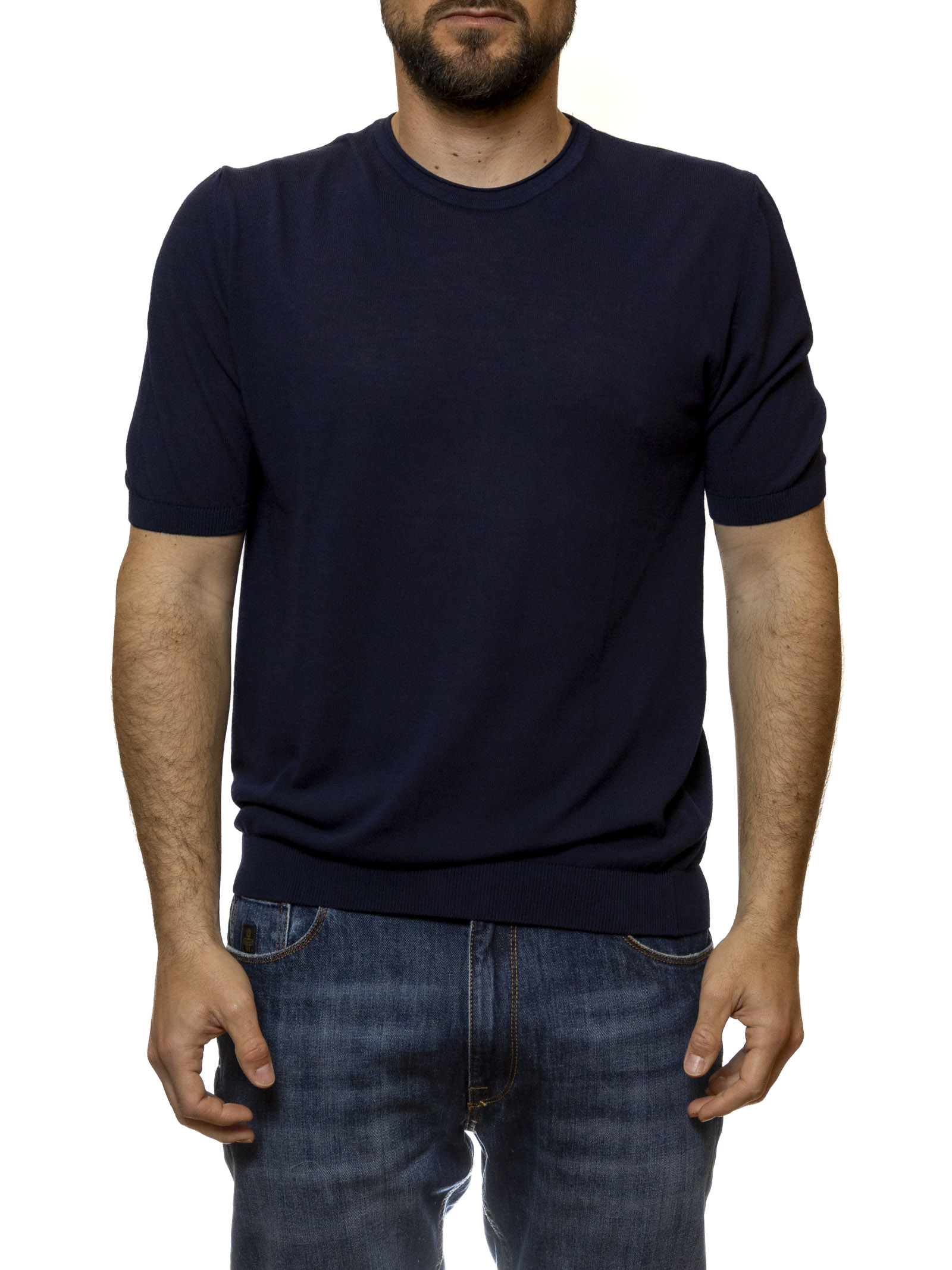This QB24 knit T-shirt, available in a deep navy blue, is a staple of the contemporary men's wardrobe. Crafted from a luxurious 100% fine-knit cotton, this piece stands out for its silky texture and subtle sheen that only high-quality yarns can provide. It's the ideal choice for those who want to elevate their everyday look, swapping the classic jersey T-shirt for a more structured, refined, and incredibly comfortable piece.