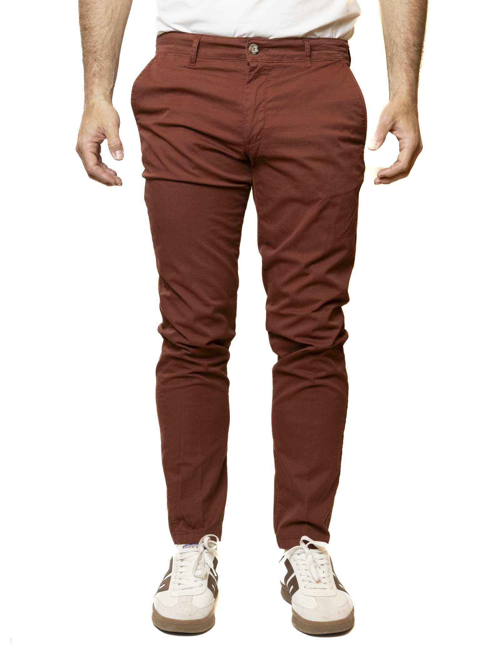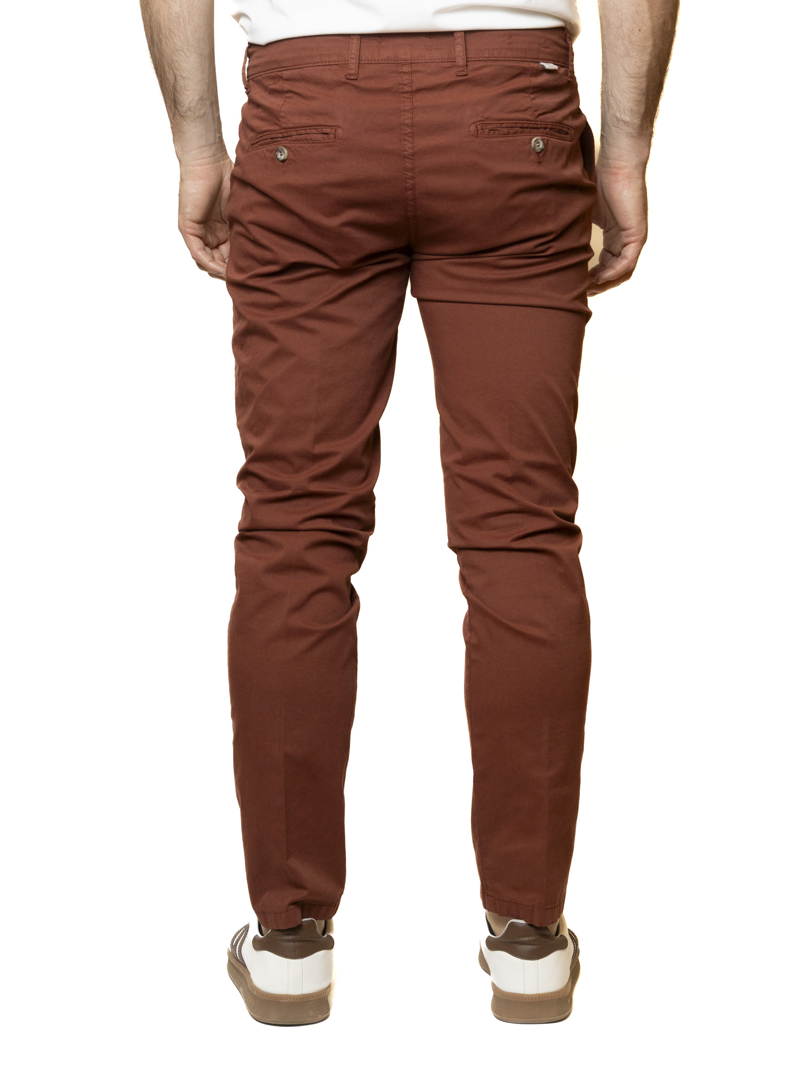 The design stands out for its clean lines and Slim Fit, designed to slim the figure in a modern and dynamic way. Featuring classic front "Side pockets" and back welt pockets with button closures, these trousers are enriched with refined interior details that highlight their quality construction. The burnt orange color is designed for the man who wants to stand out with elegance, ideal for creating sophisticated contrasts with a white linen shirt or paired with neutral tones like beige and navy blue. It's the ultimate versatile piece, capable of transitioning effortlessly from a casual business meeting to an evening event.
