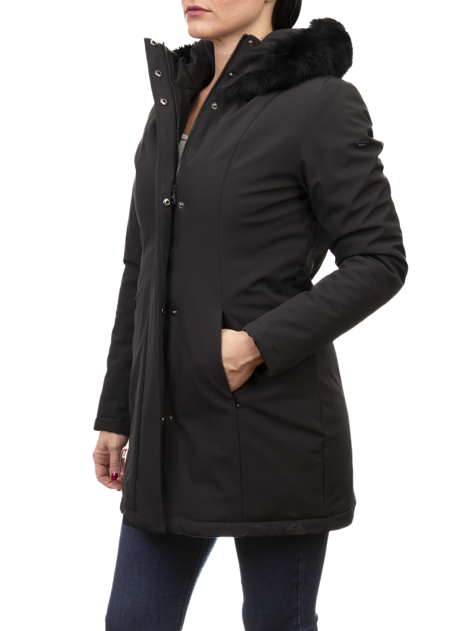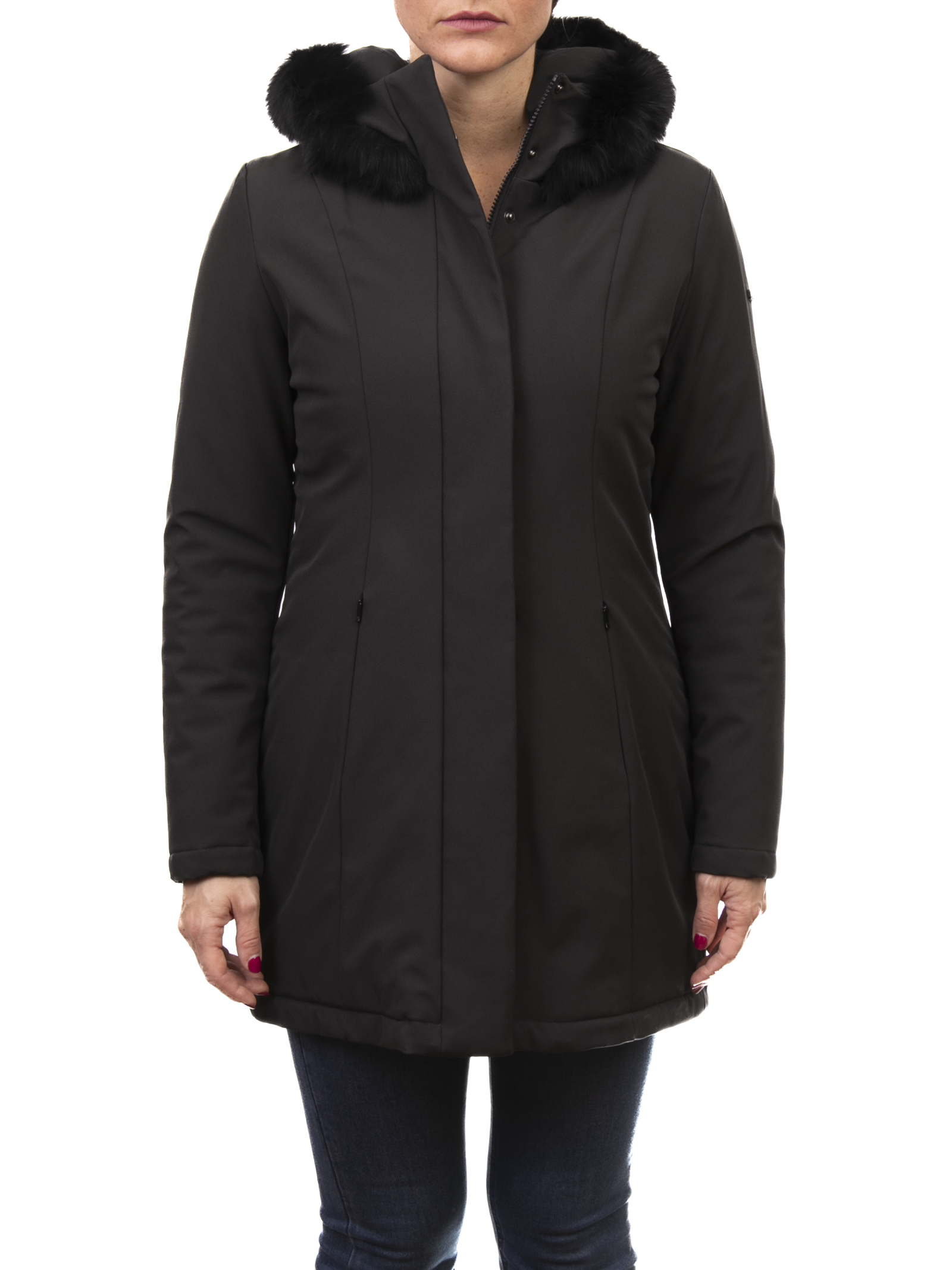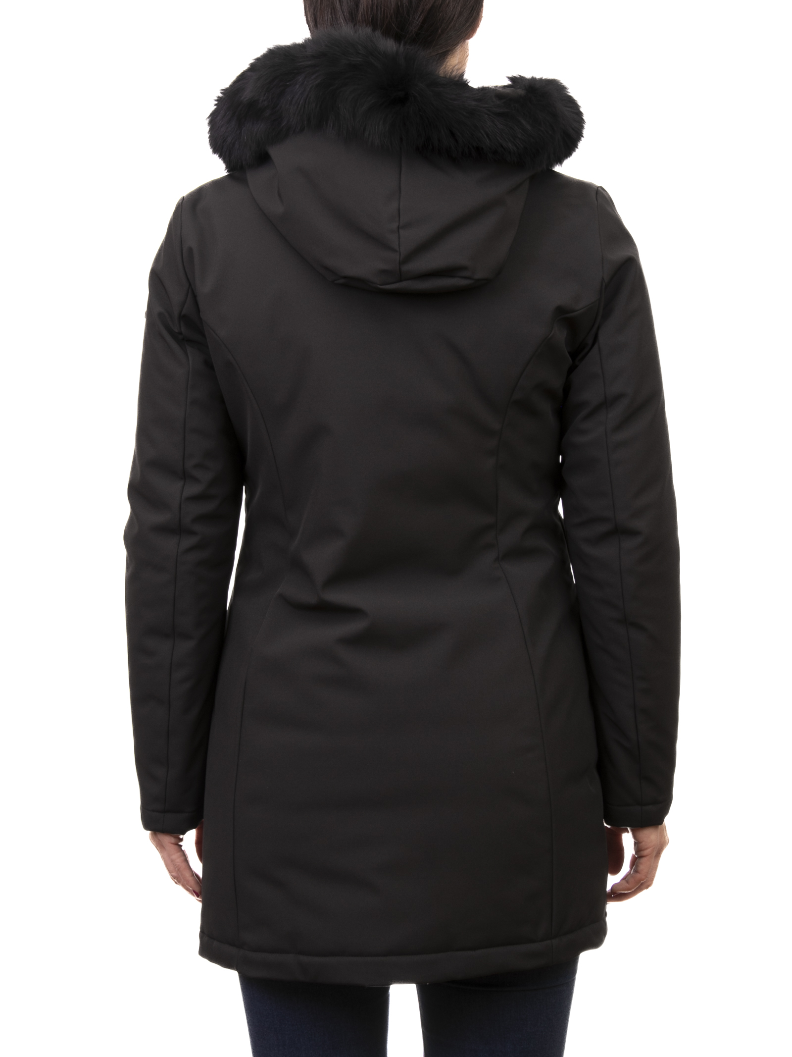 The model features a hood with soft, tone-on-tone fur, ideal for adding a touch of sophistication to colder days. The front closure combines a zip and hidden snaps, ensuring a minimalist yet protective design.