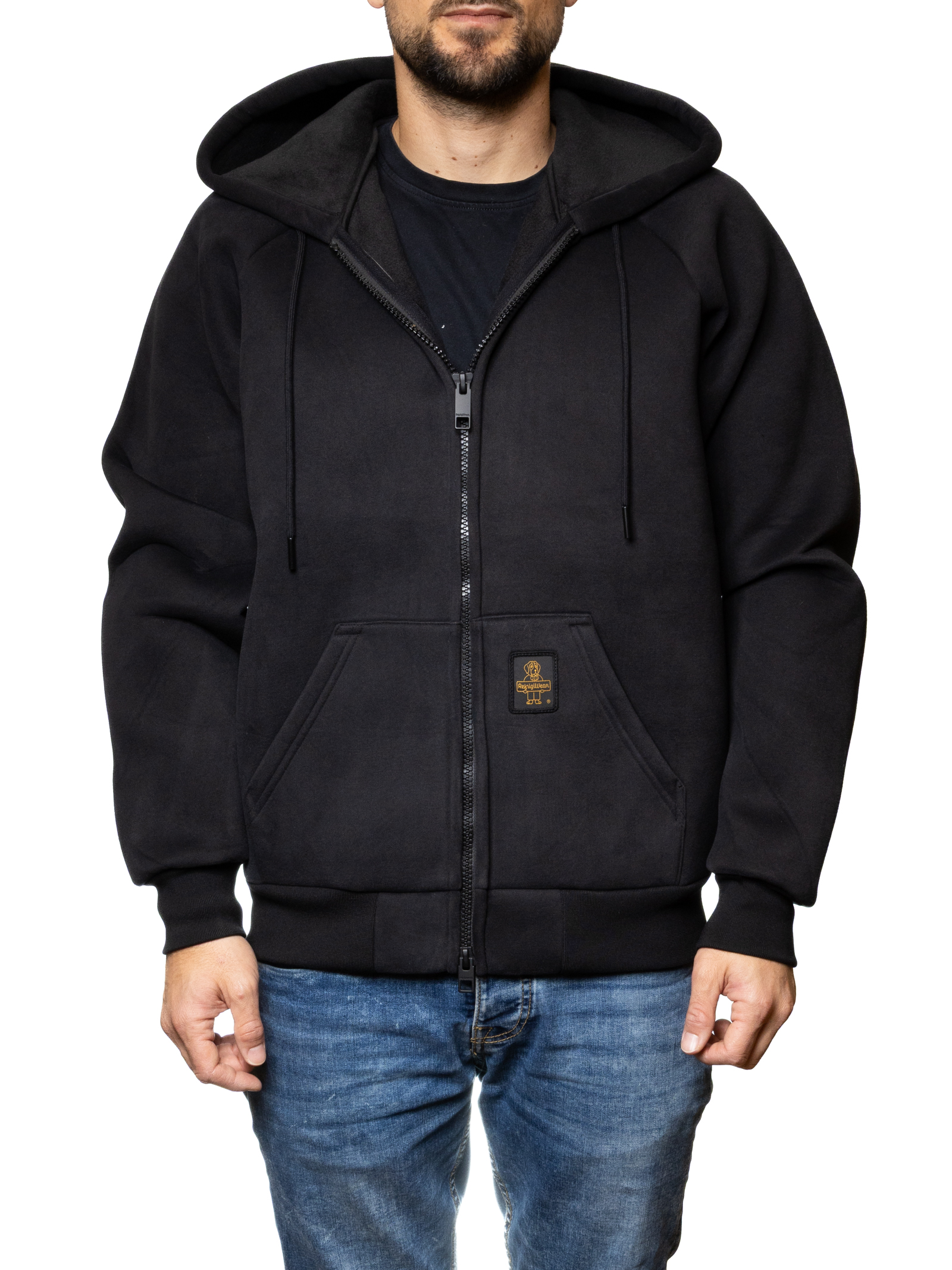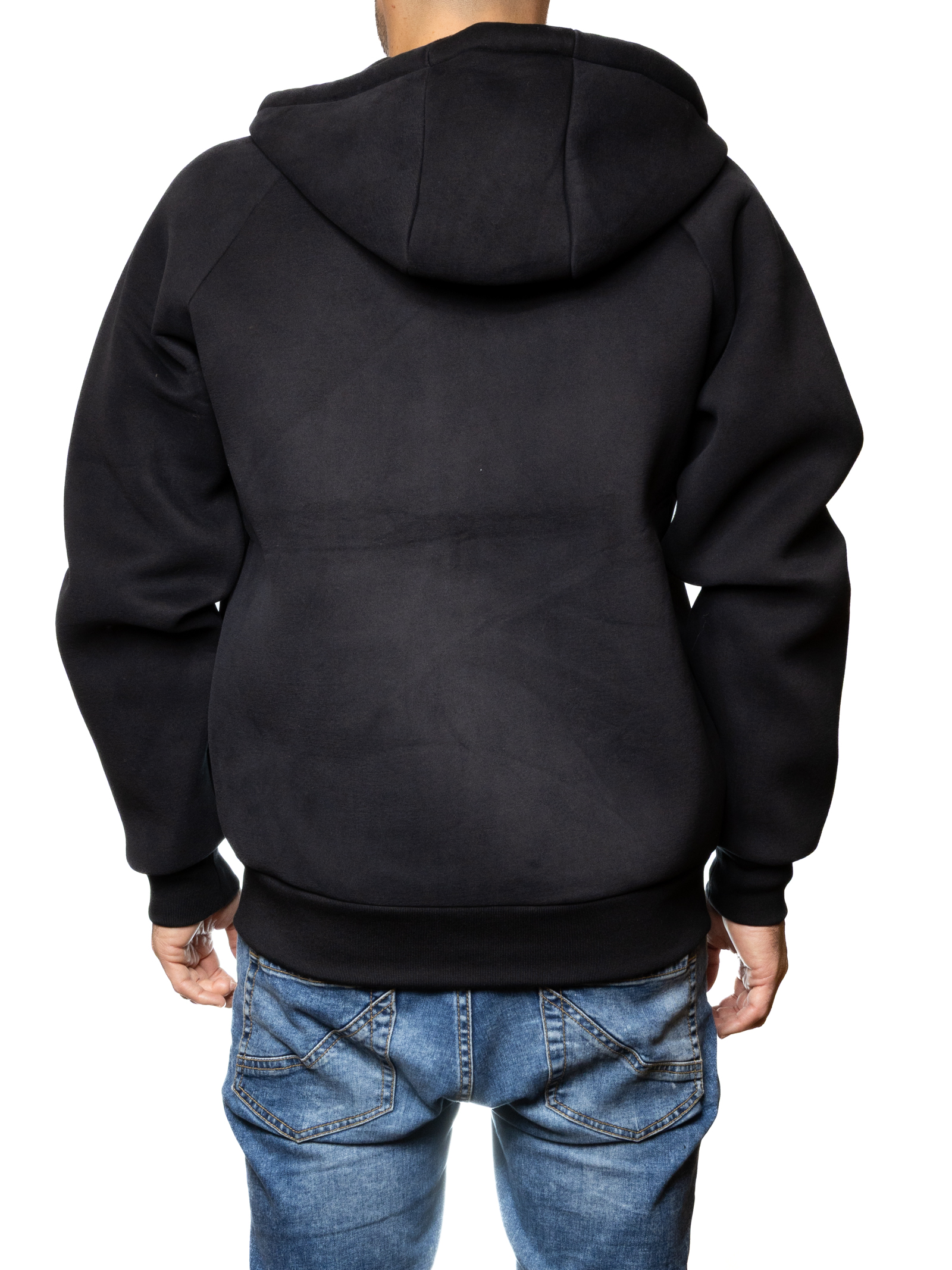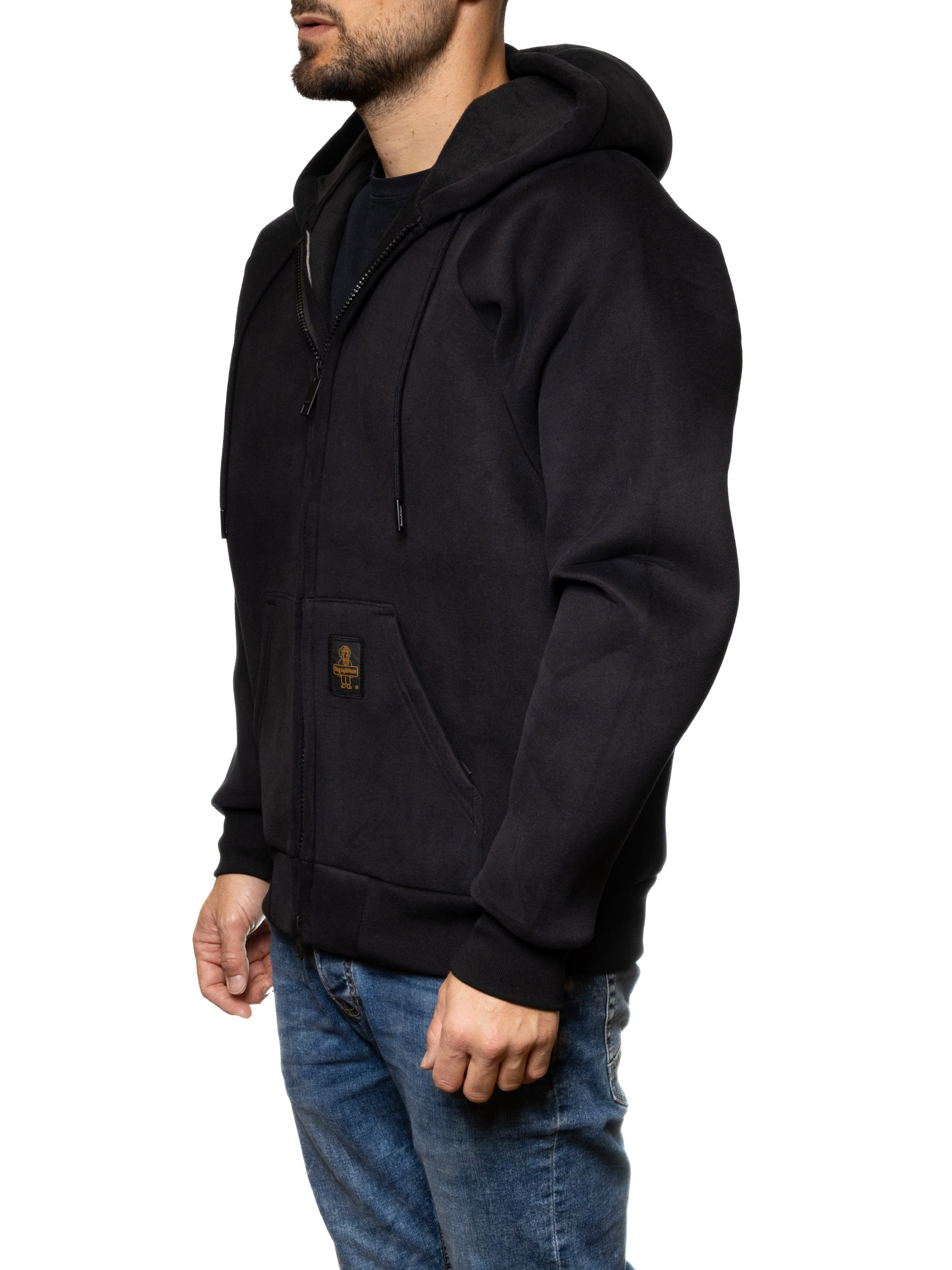 Men's sweatshirt in a deep shade of black, featuring a sporty and functional design. Made from soft, structured technical fabric, it offers exceptional comfort and a pleasant feeling of warmth thanks to the fleece lining. It features a full zip, an adjustable drawstring hood, and a practical front kangaroo pocket. Ribbed cuffs and hem ensure a stable and comfortable fit.