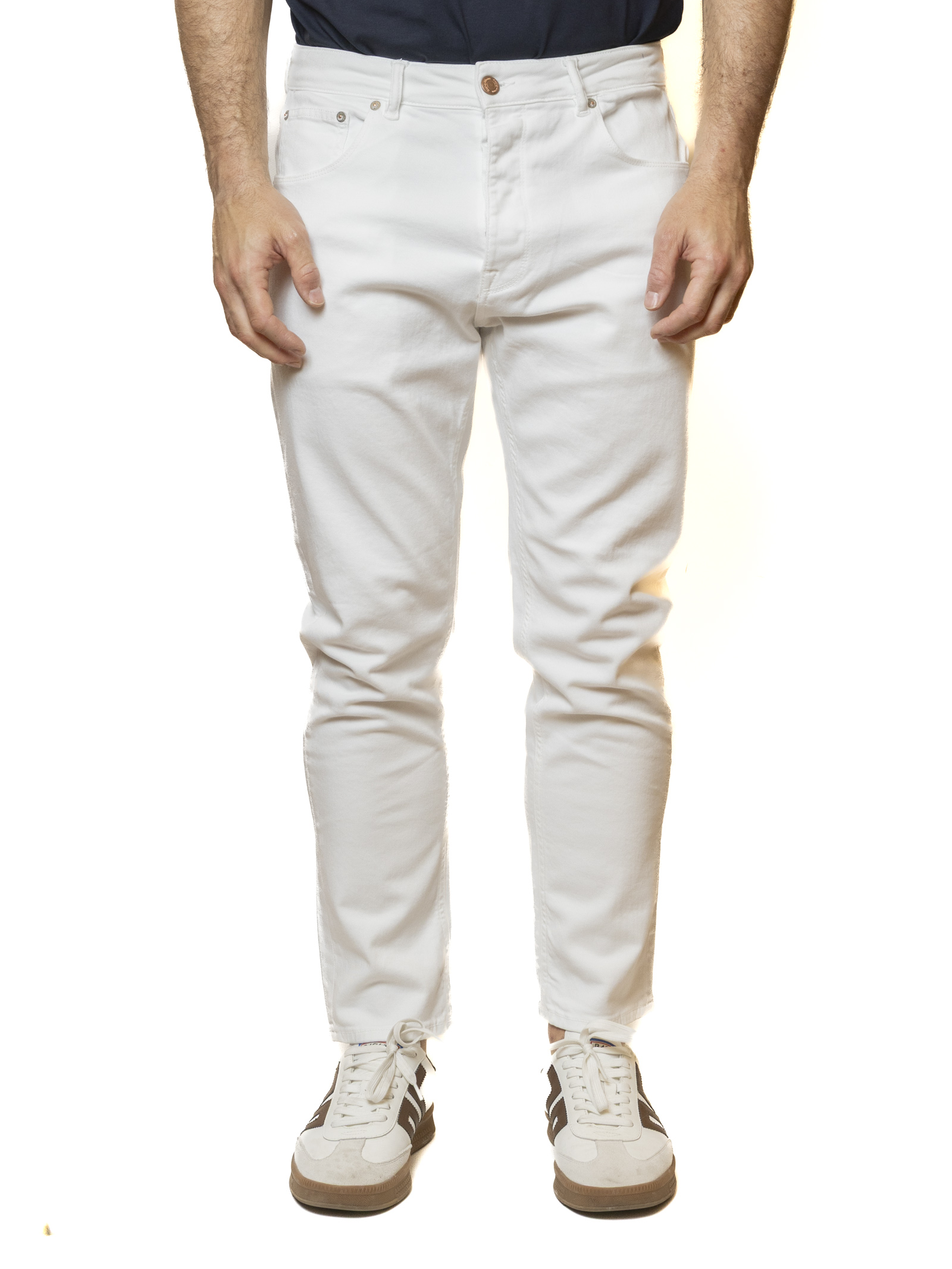The design is defined by the Scott model, featuring a contemporary Slim Fit with a slim leg that dynamically slims the figure. They feature classic five pockets reinforced with metal rivets and a front closure with contrasting buttons that enhance their refined aesthetic. The white shade is the most versatile in the summer wardrobe: perfect when paired with a light blue shirt for a refined business-casual look, or with a colorful polo shirt for a more informal and lively outfit. These are the ideal jeans for those seeking a high-quality basic that can add brightness to any outfit.